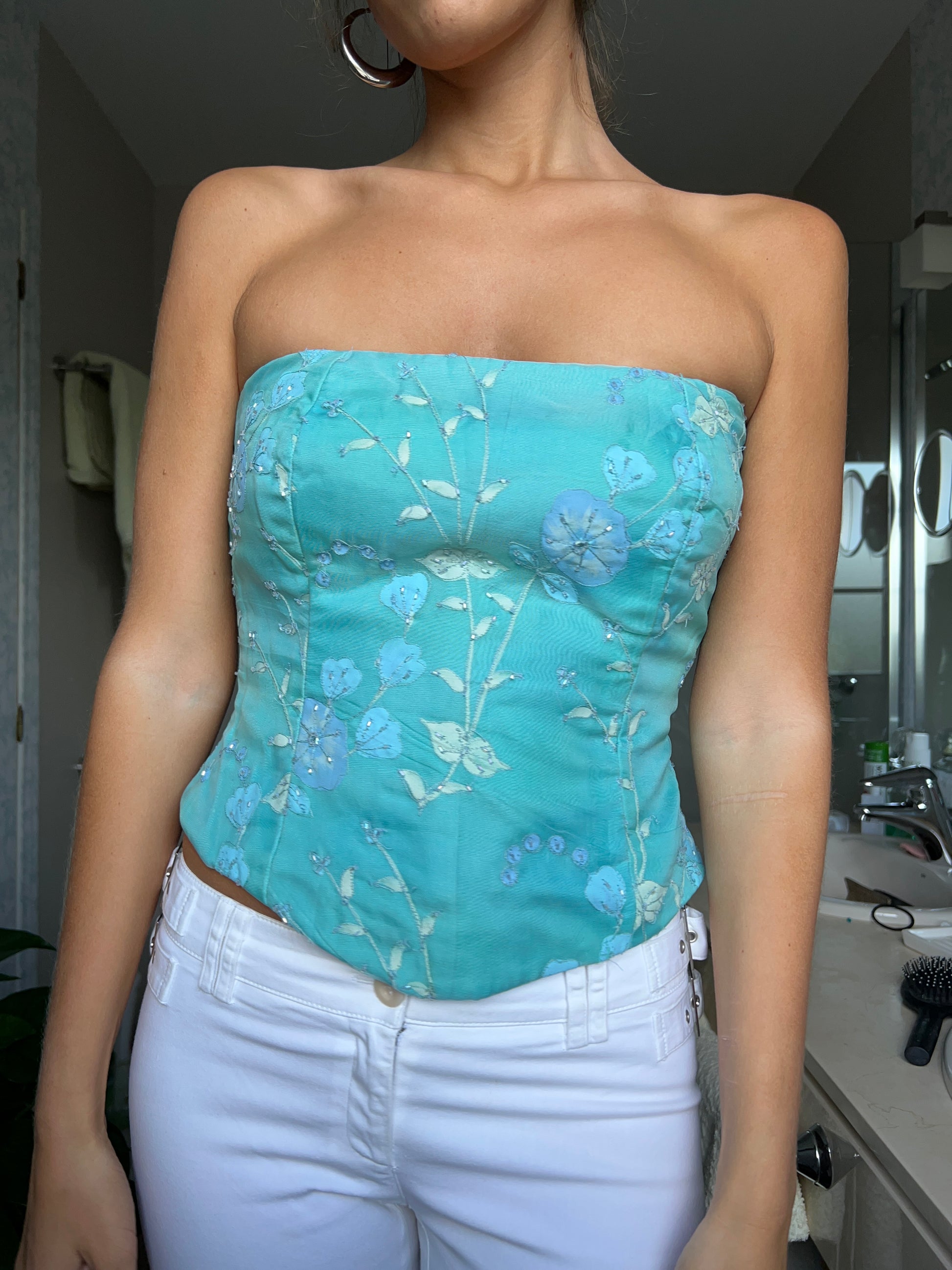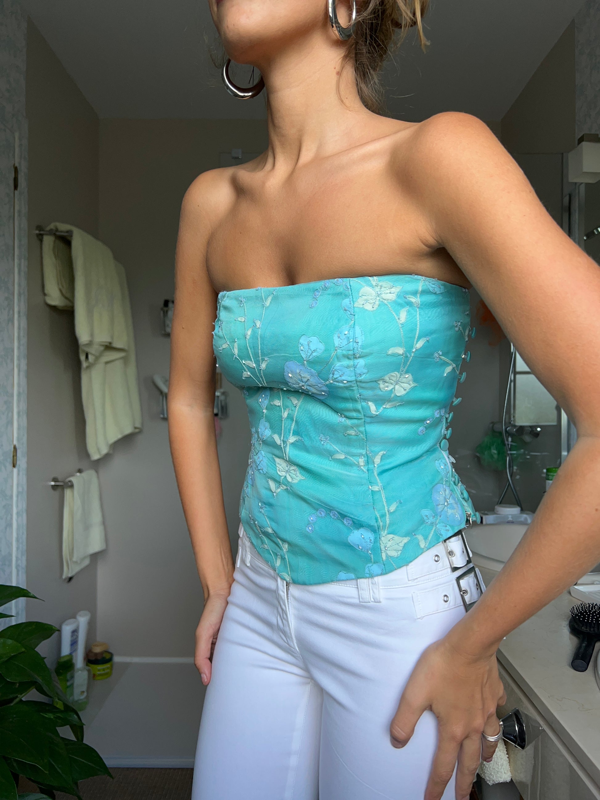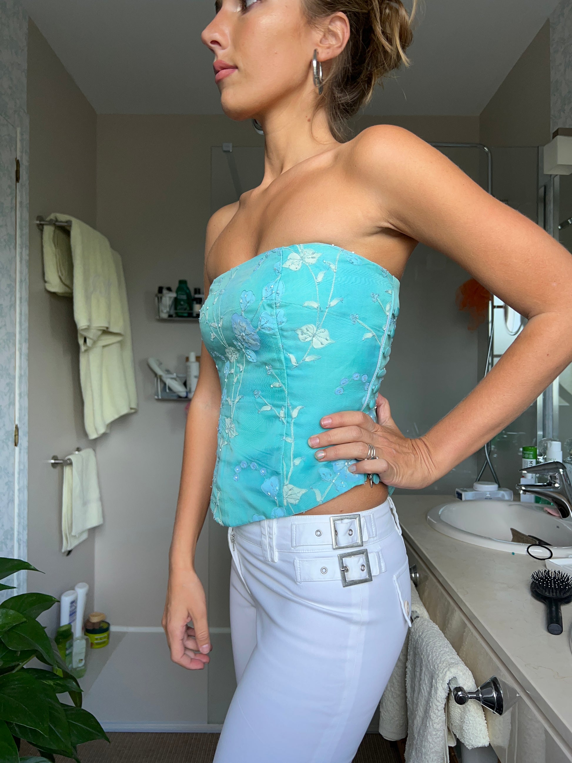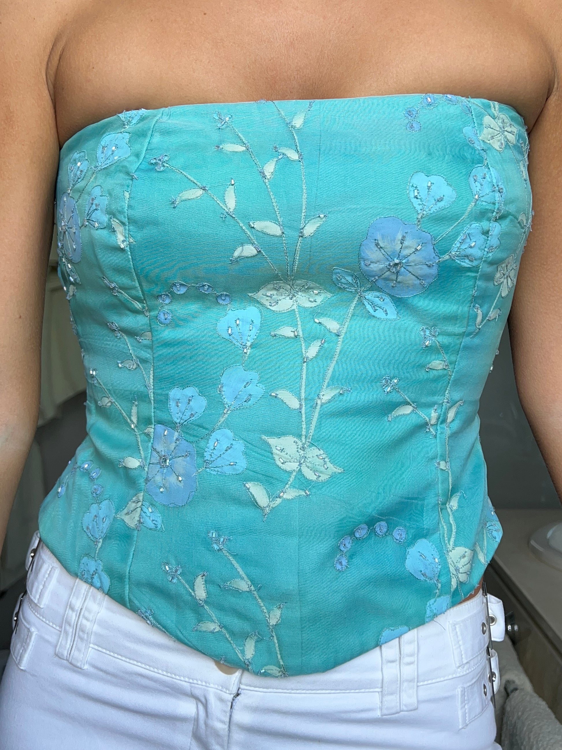 (Talla S) Beeindruckendes türkisfarbenes Korsett, kubisch geformte Blumenbordüren mit ihren hohen Taillen und Hosen und anderen blauen Tönen und scharfen Kanten, während der Tejido mit einer asiatischen Haube gestempelt wurde. Der seitliche Cremallera-Kreis ist mit einer Leiste aus Bonito-Stoffknöpfen geschmückt. Escote ligeramente de corazón. Empfehlenswert für diejenigen, die mehr Pecho haben möchten. Perfekte Bedingungen. Das Modell hat eine Größe von XS/S und eine mittlere Größe von 1,72 cm.