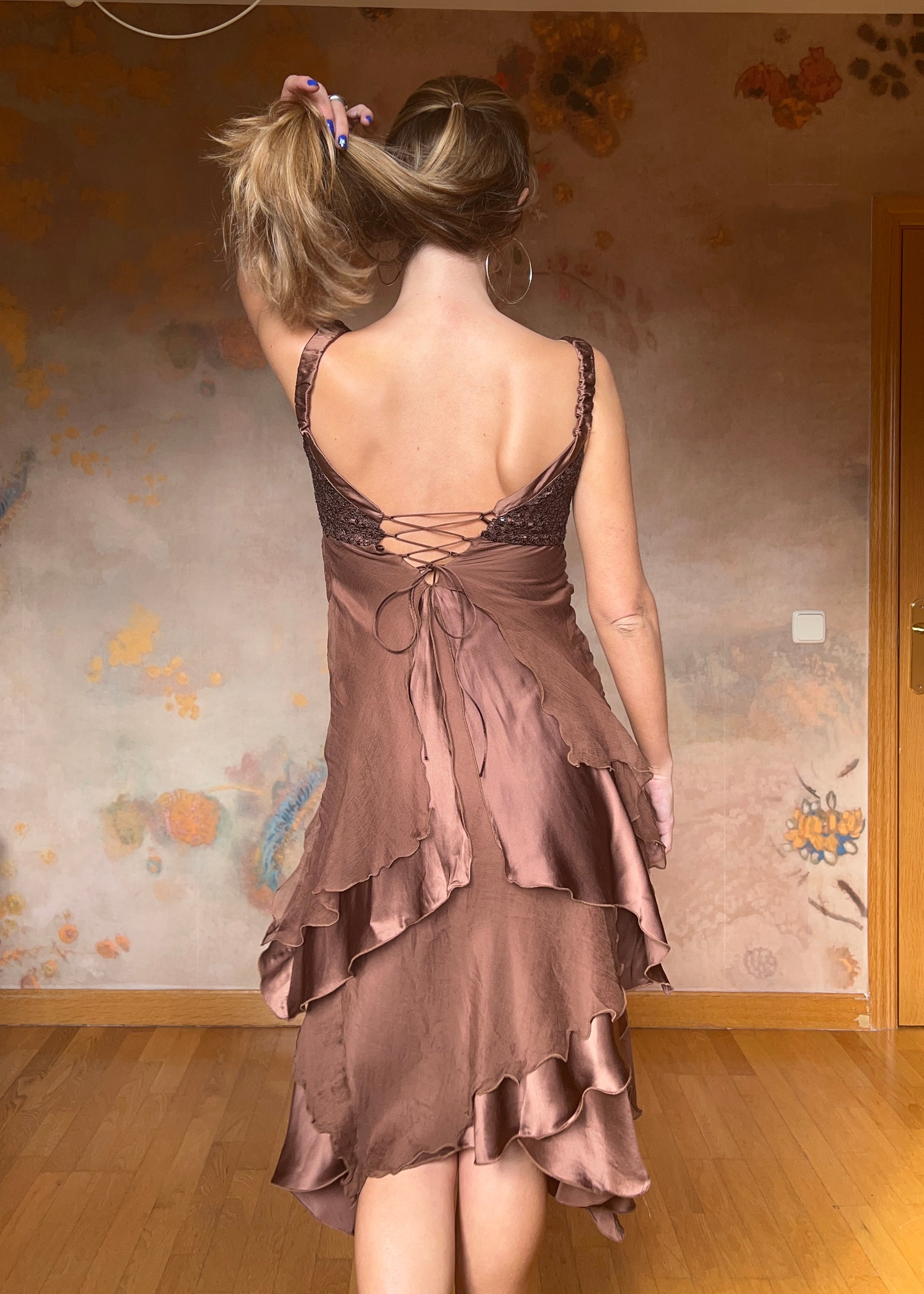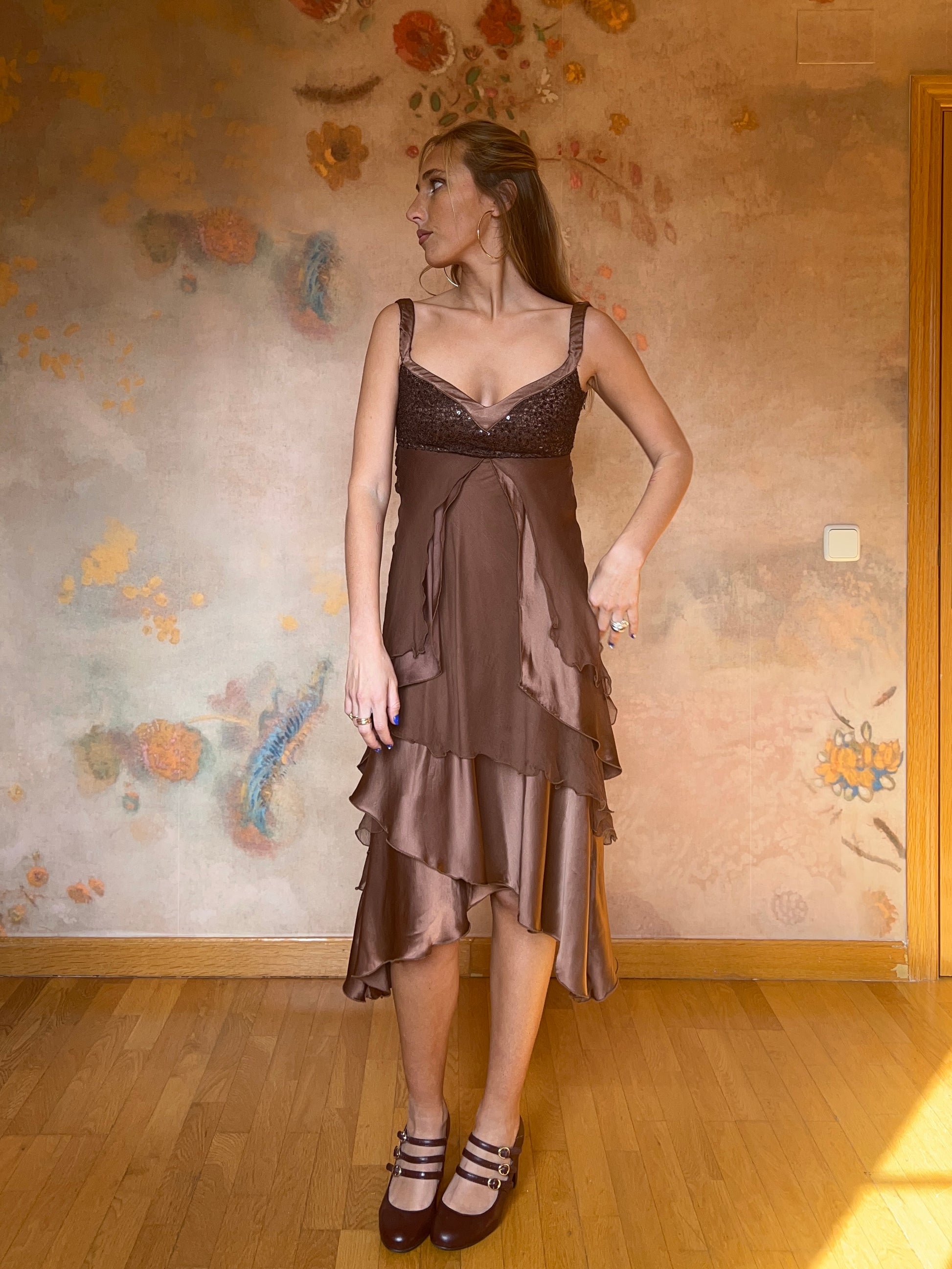(Talla S) Vestido midi ideal marrón chocolate de tirantes anchos y escote corazón. Corte babydoll ajustado debajo del pecho. El tejido está cubierto de lentejuelas marrones en el escote y luego cae en capas de seda y gasa asemejando a los pétalos de una flor, dándole un vuelo espectacular a la falda. Cierre trasero con fino lazo estilo corset, permitiendo ajustar al cuerpo perfectamente. Perfectas condiciones.