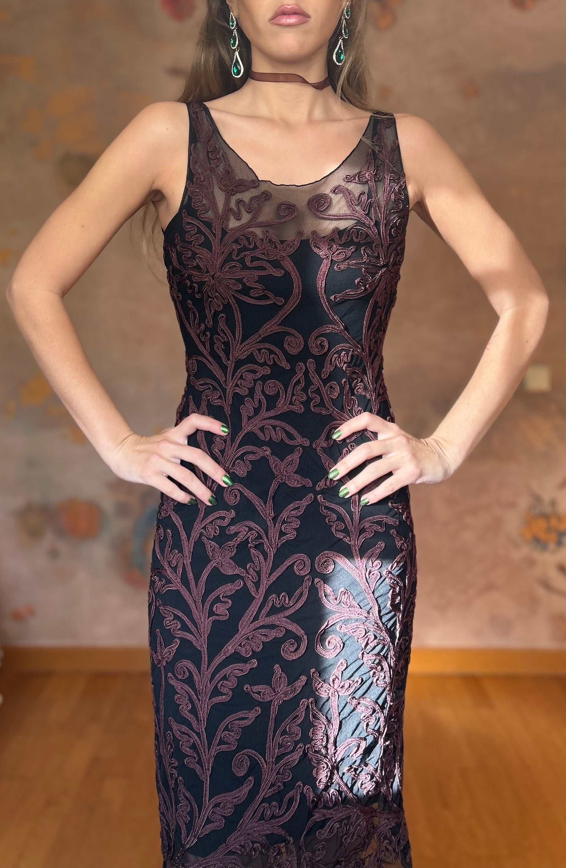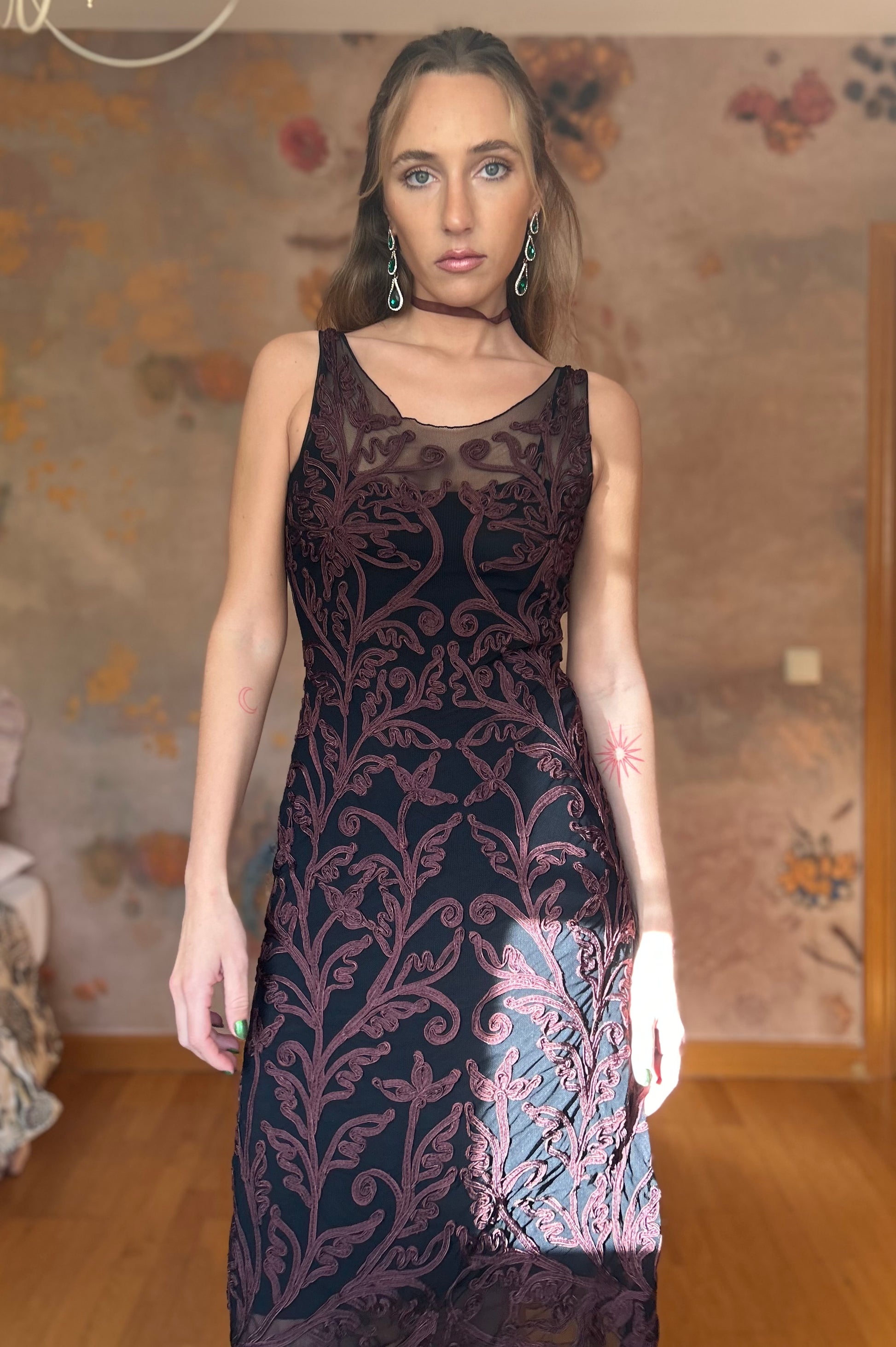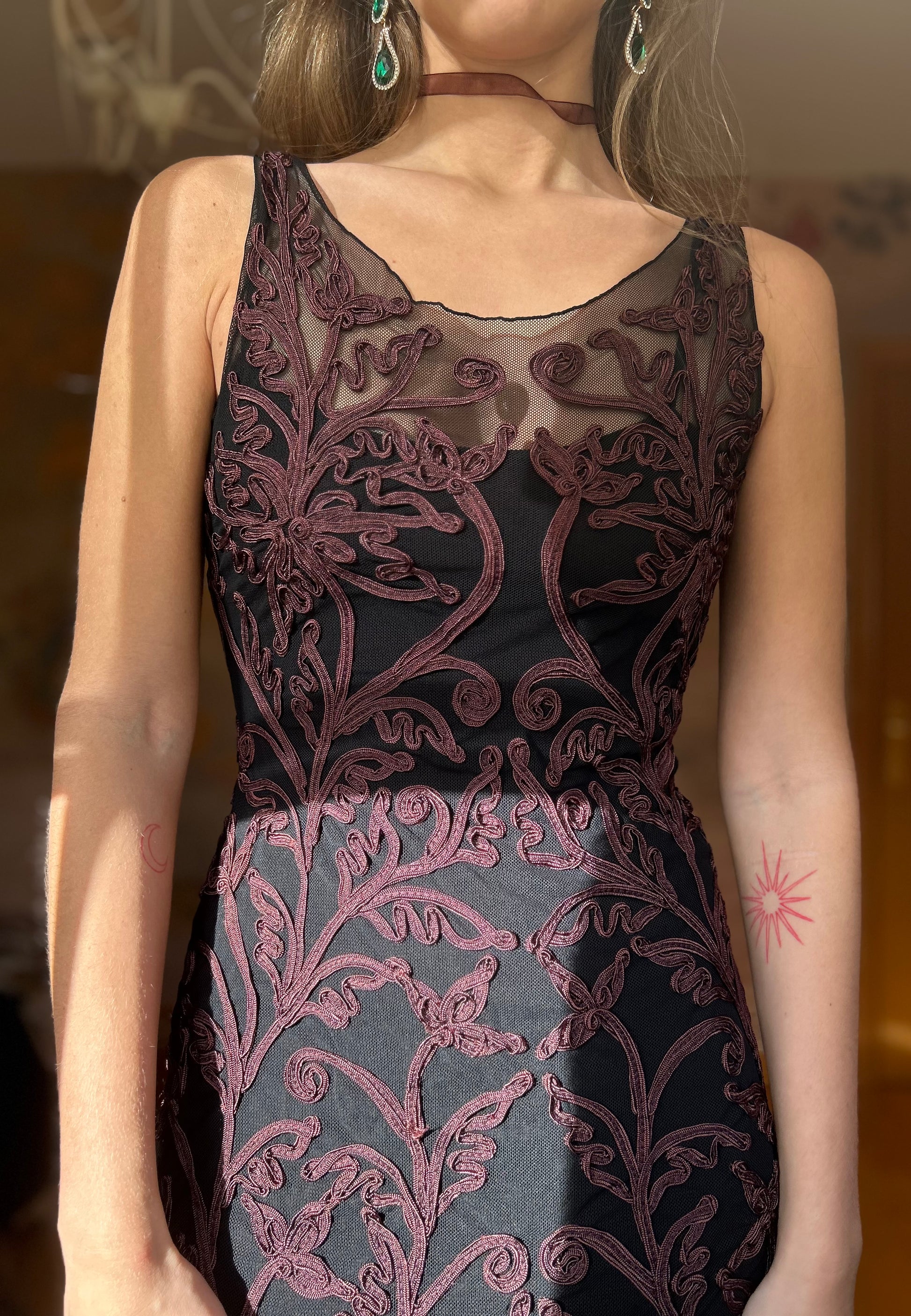 (Talla S) Precioso vestido midi color “maroon”, entre el marrón y el granate. De diseñador británico que fundó su línea en 1984 y fue el mismo creador del mono bicolor azul y blanco que lleva Julia Roberts en “Pretty Woman”. Las prendas de este diseñador se caracterizan por una relación calidad-elasticidad excelente, acuñando su propio término de tela, el “Original Crinckle”. El vestido consta de un forro negro y una tela mesh “maroon” que lo cubre con flores bordadas en hilo, creando un relieve y textura espectaculares. De tirantes y sin cierres. Opción idónea para cualquier evento navideño.