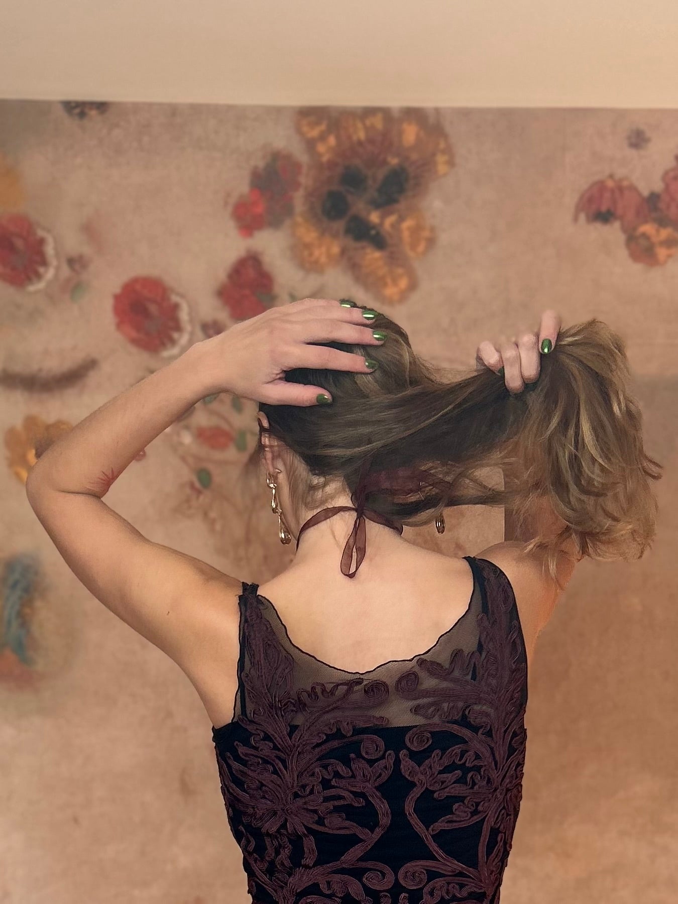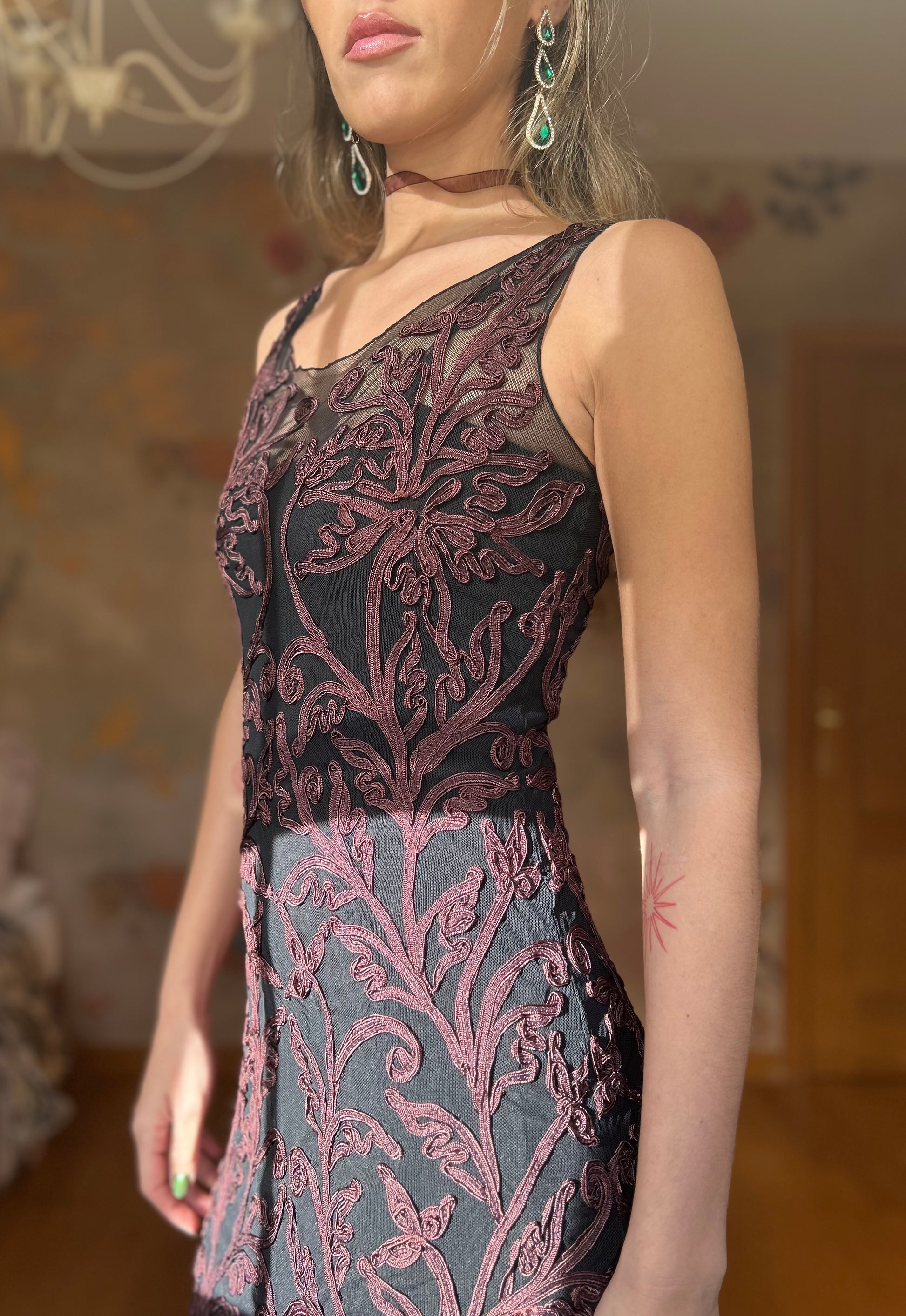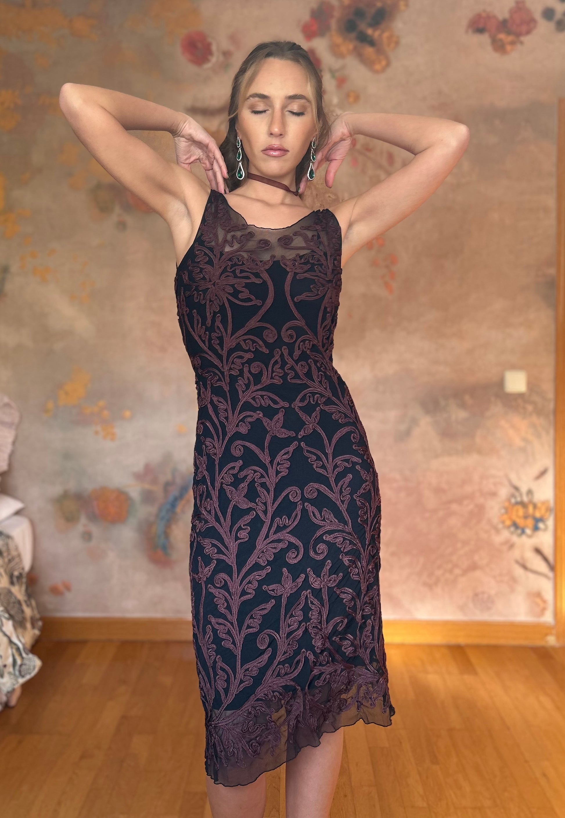 (Talla S) Precioso vestido midi color “maroon”, entre el marrón y el granate. De diseñador británico que fundó su línea en 1984 y fue el mismo creador del mono bicolor azul y blanco que lleva Julia Roberts en “Pretty Woman”. Las prendas de este diseñador se caracterizan por una relación calidad-elasticidad excelente, acuñando su propio término de tela, el “Original Crinckle”. El vestido consta de un forro negro y una tela mesh “maroon” que lo cubre con flores bordadas en hilo, creando un relieve y textura espectaculares. De tirantes y sin cierres. Opción idónea para cualquier evento navideño.