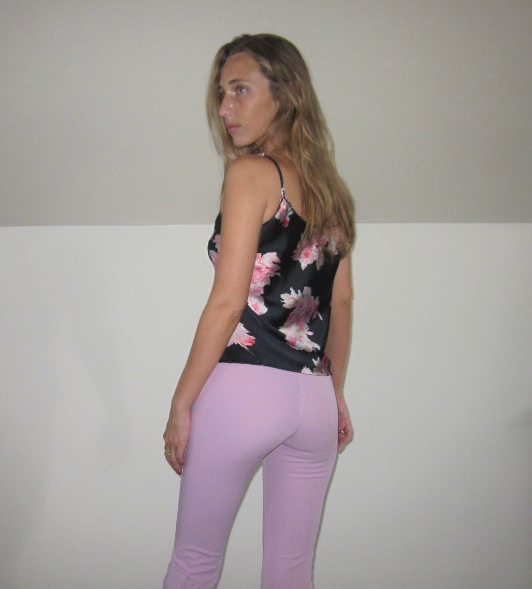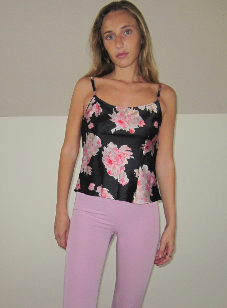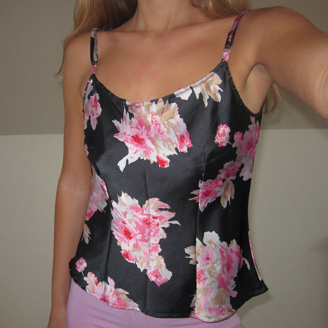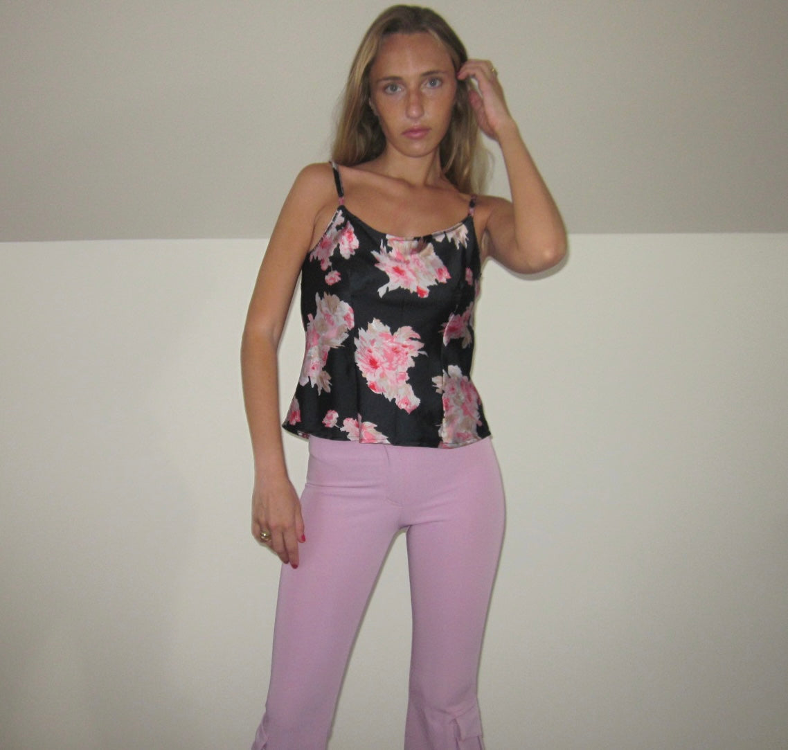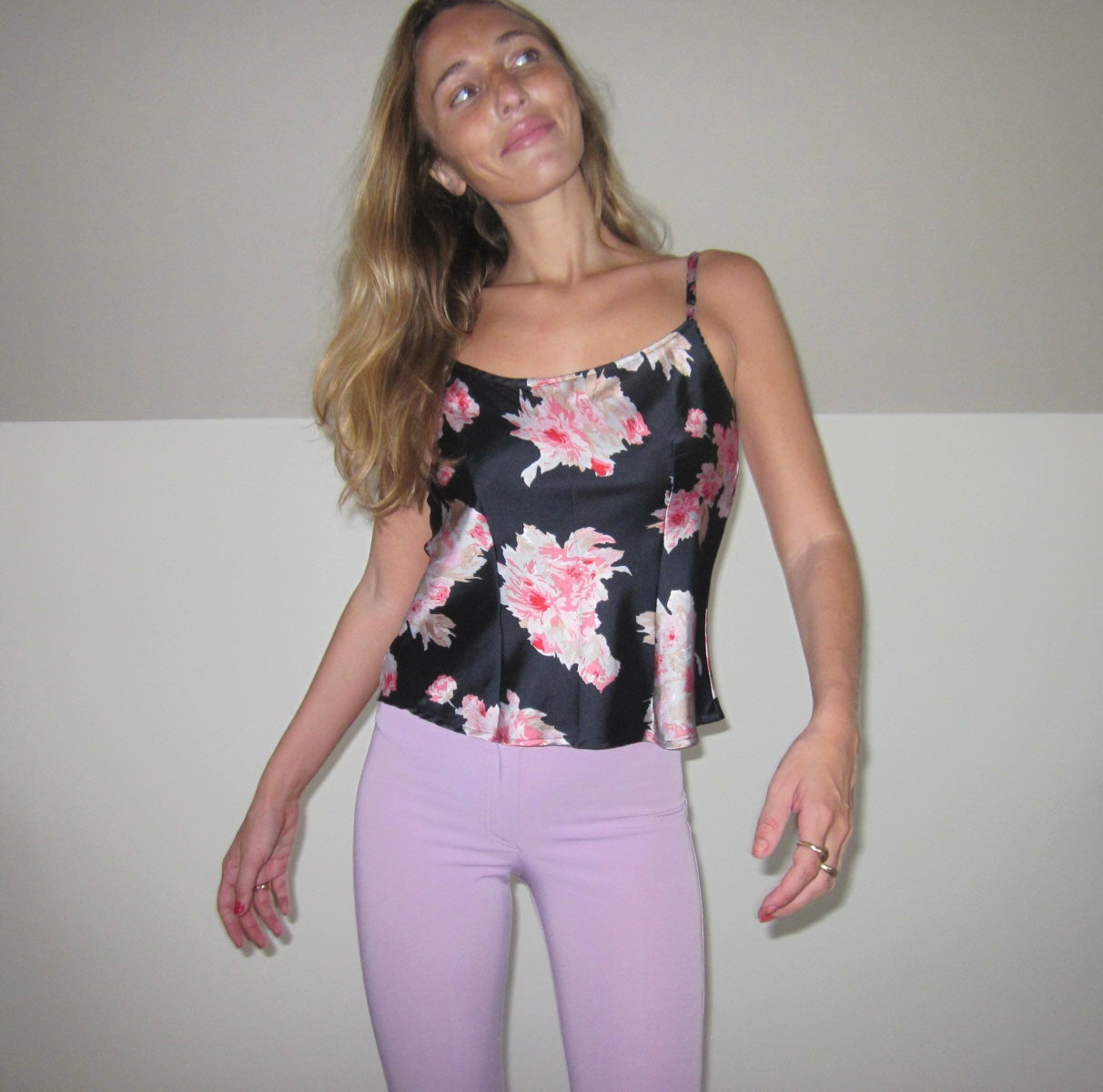 Talla S. Top Negro mit Stempel aus rosa Blumen. Tirantes finos cubiertos de lentejuelas negras. Leicht entallado. Tela sedosa y suave al tacto. Perfekte Bedingungen. (Das Modell hat eine Größe von XS/S und eine mittlere Höhe von 1,72 cm).