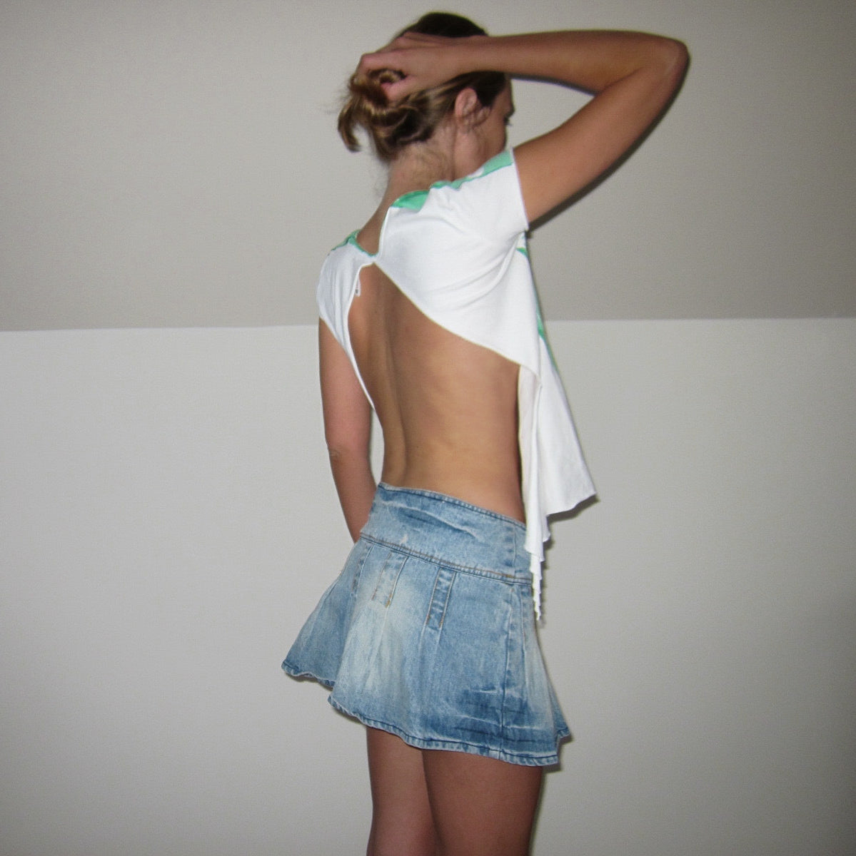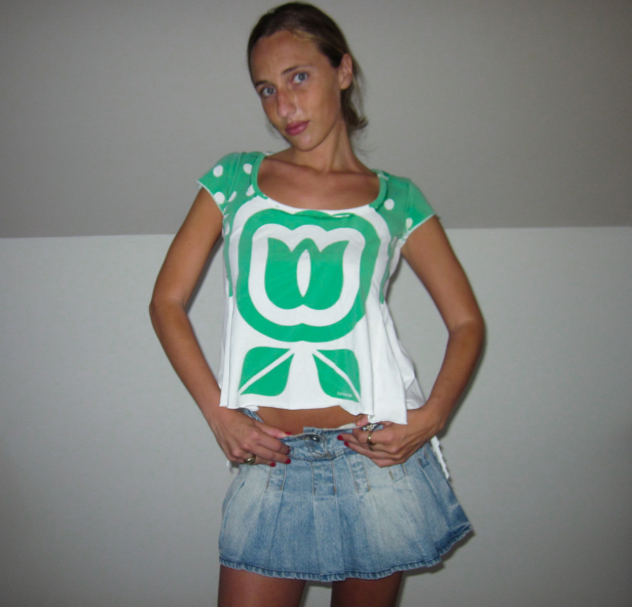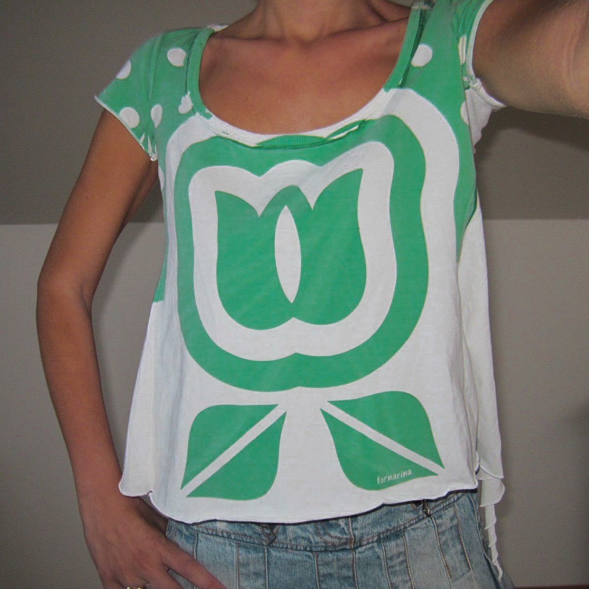 Größe S/M . Kurzes grünes und weißes Manga-T-Shirt mit abstraktem Stempel und Luftpolsterfolie. Originaldesign. Ideal für den Winter und den Strand. Perfekte Bedingungen. (Das Modell ist in Größe XS/S und mit einer Höhe von bis zu 1,72 cm erhältlich).
