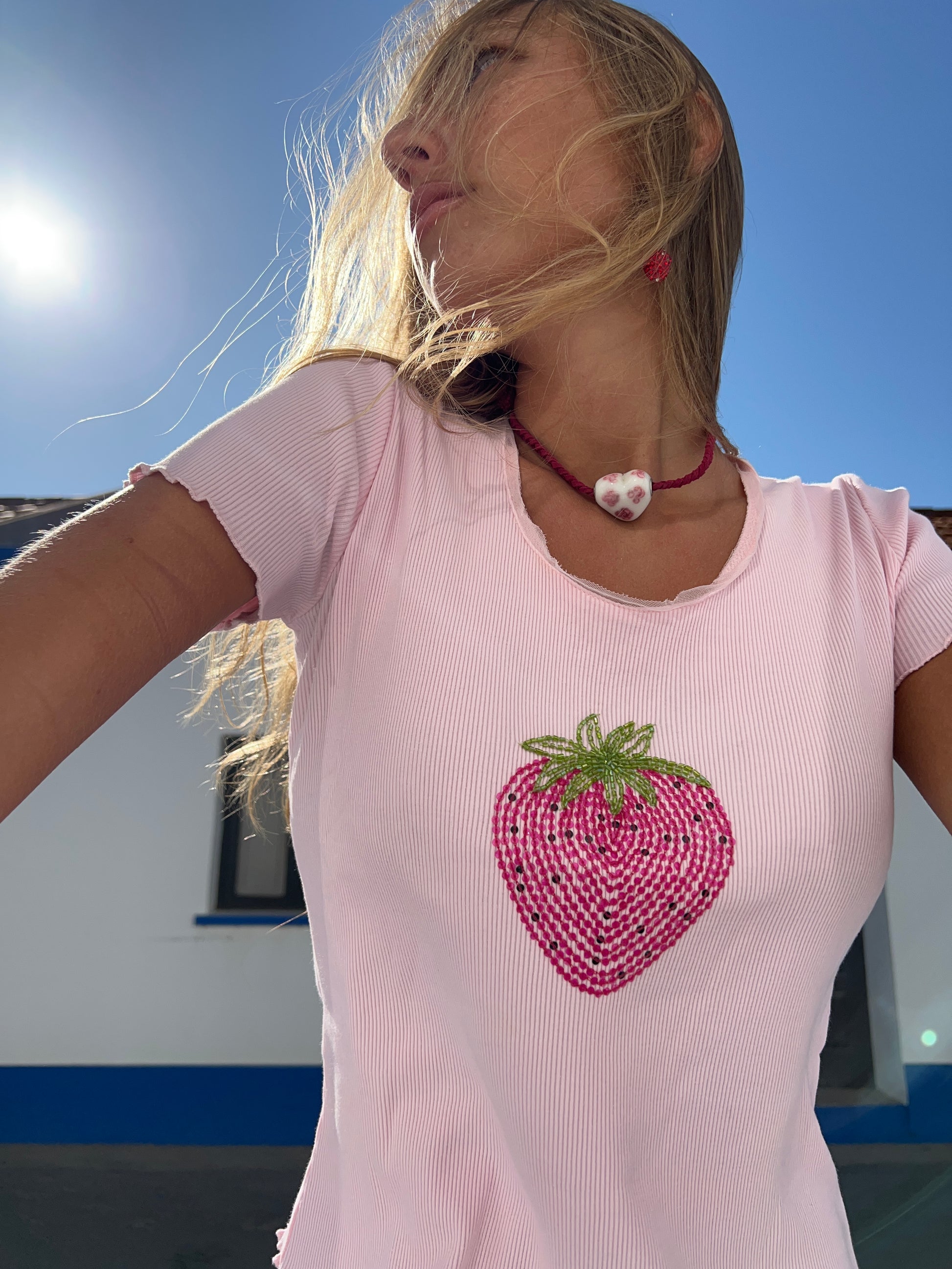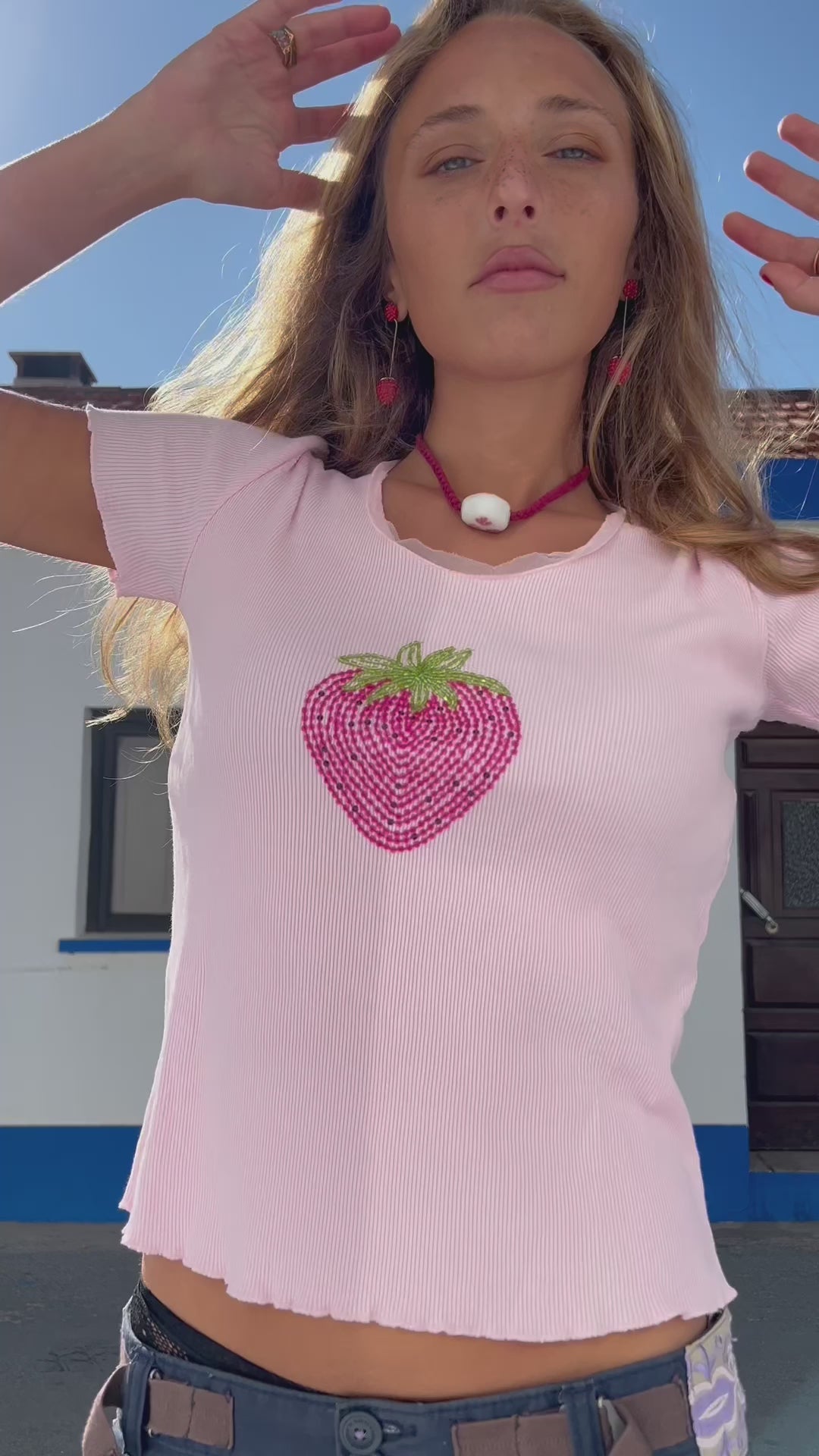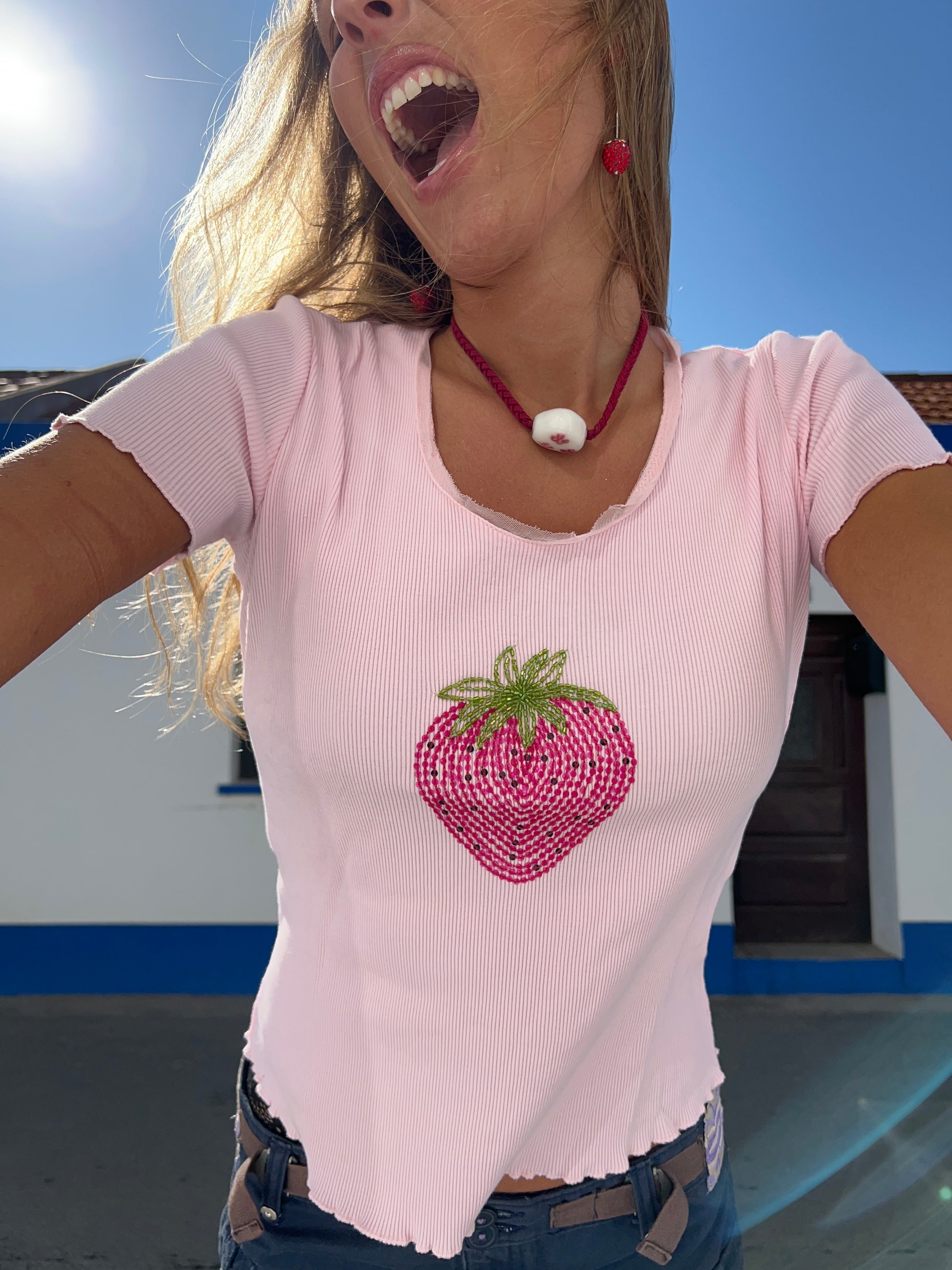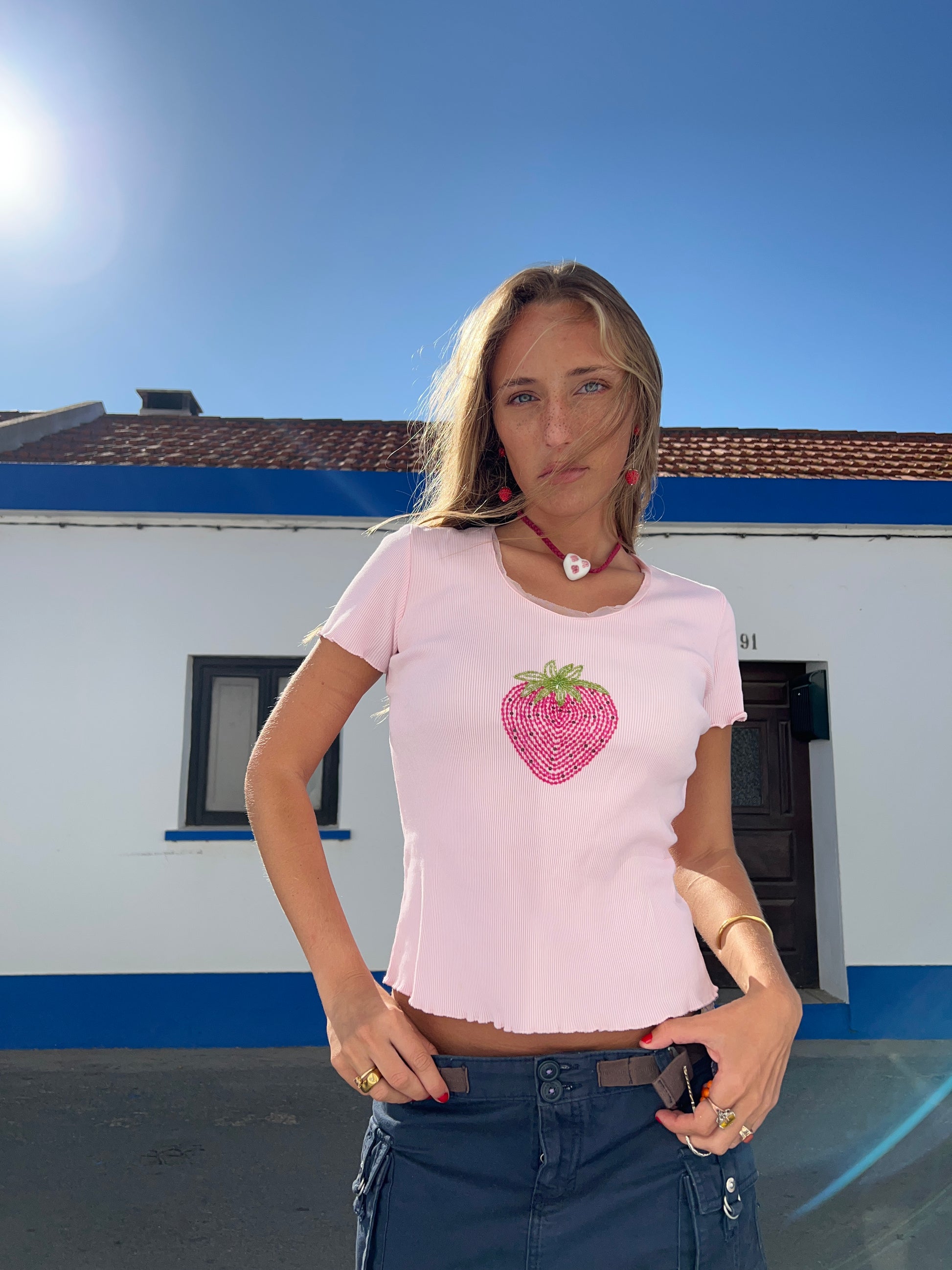 (Talla S) Ideales rosafarbenes T-Shirt mit einer großen Fresa auf dem vorderen Teil des kubischen Bereichs der rosafarbenen Gläser und der grünen Blätter. Halbtransparente Bordüre für unterwegs. Tejido höflich. Sehr beliebt und sehr beliebt. Tarta de Fresa-Kern. Perfekte Bedingungen.