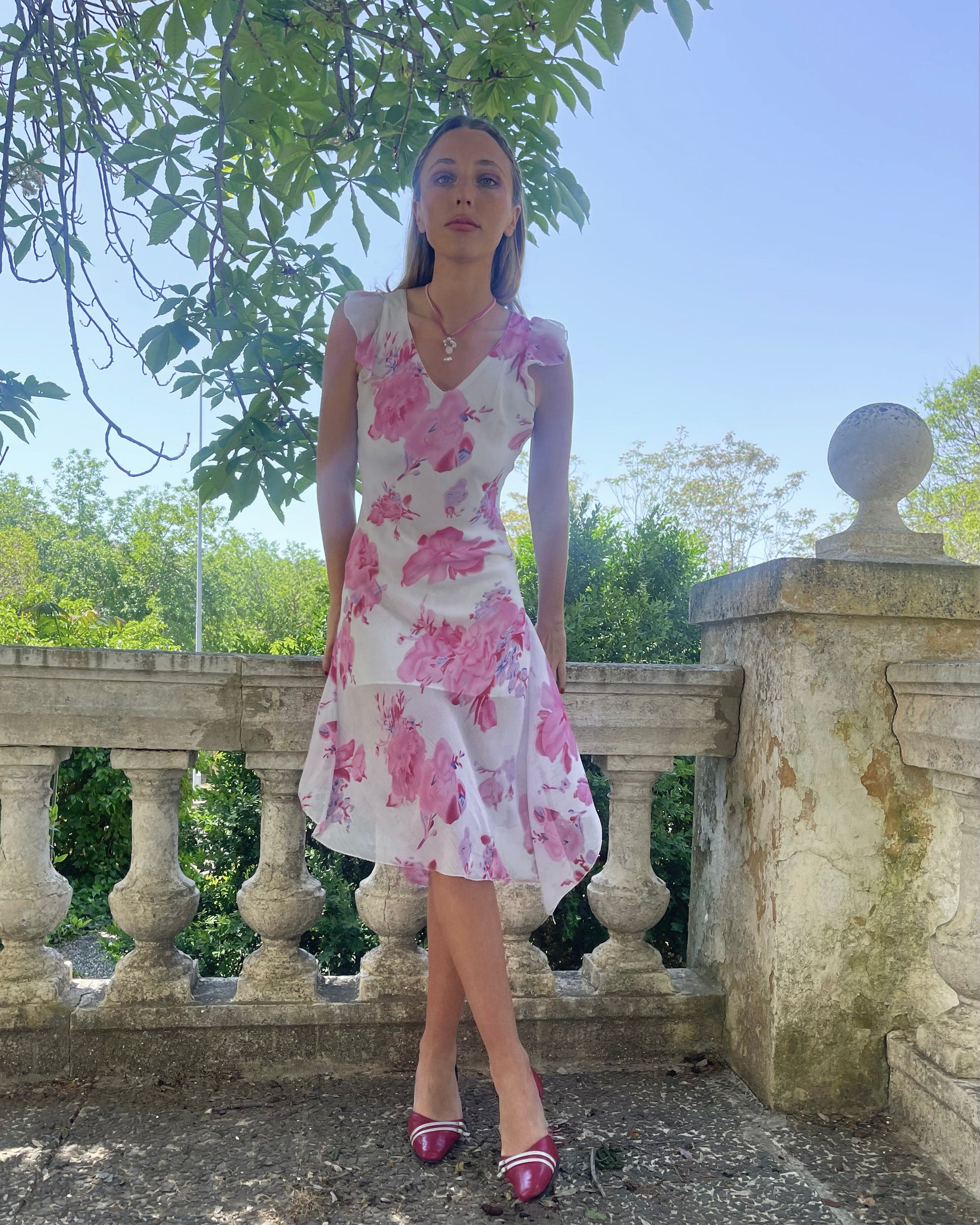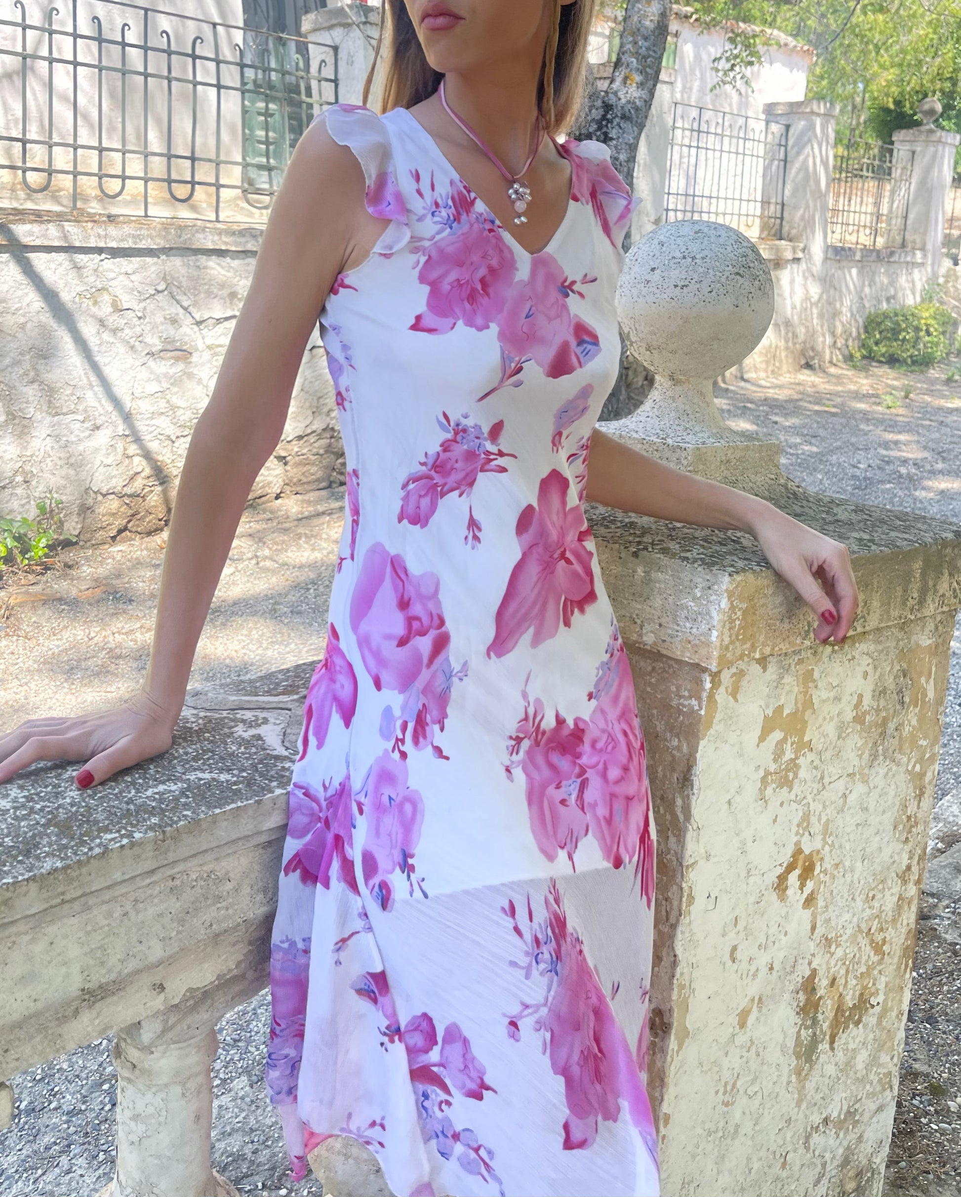 Größe M. Zartes Kleid mit Blumenmotiven in Rosa und Mauve, leicht und schmeichelhaft, mit Transparenz am unteren Rand, die eine sehr feminine Note verleiht. Perfekt für Tagesveranstaltungen (Taufen, Kommunionen, Messen…). Am Ausschnitt mit Faden überarbeitet, sonst perfekter Zustand . Die Maße in cm betragen 98 im Brustbereich, 86 im Umfang und 117 in der Länge (Das Modell hat Größe XS/S und ist 1,72 cm groß).