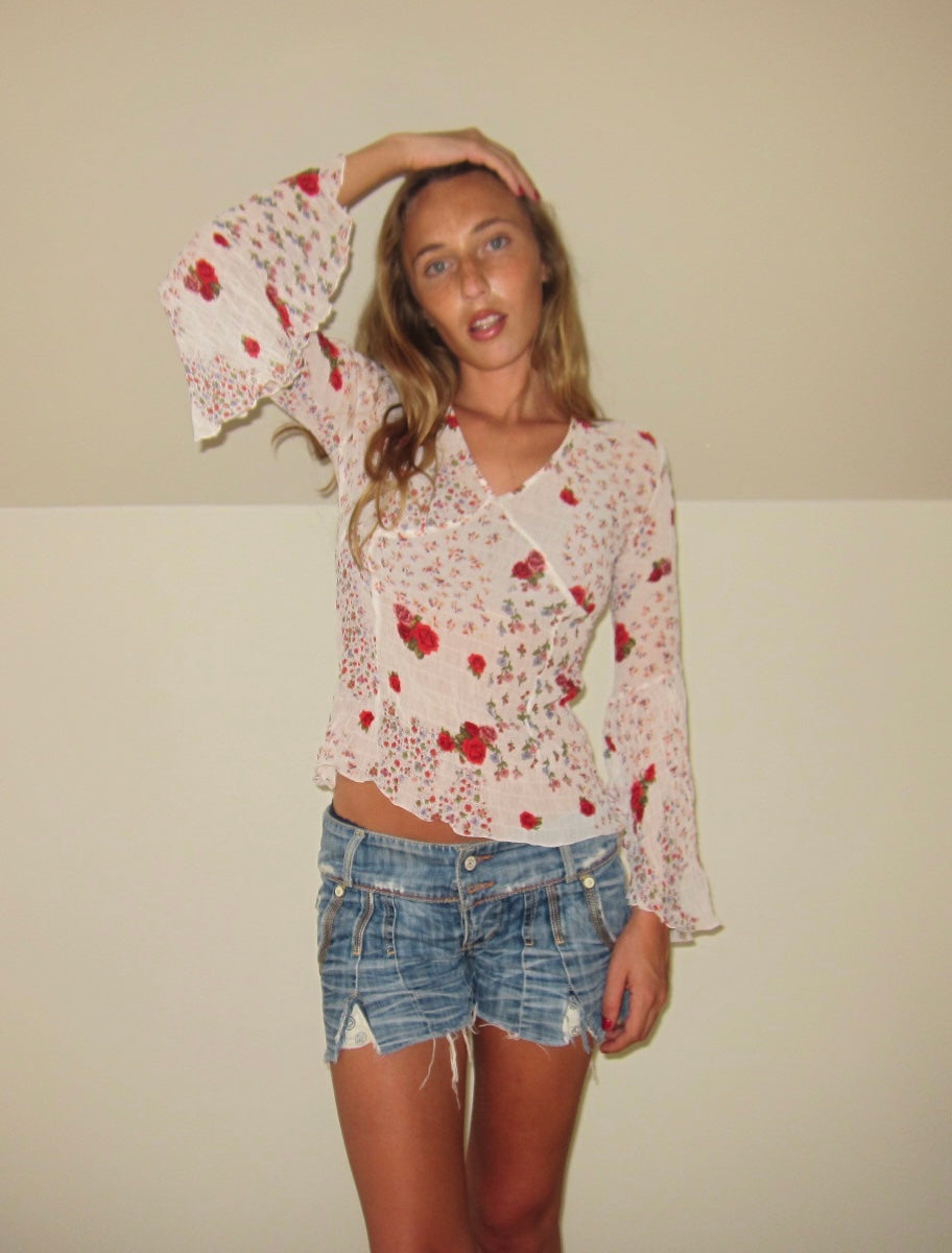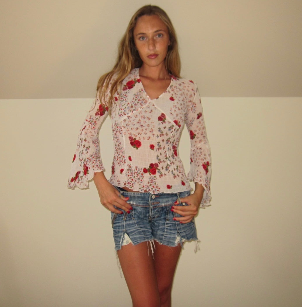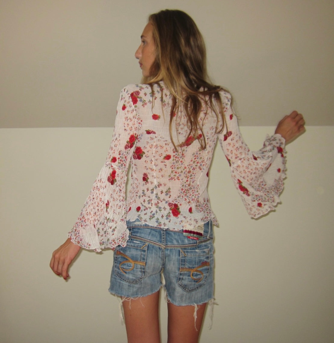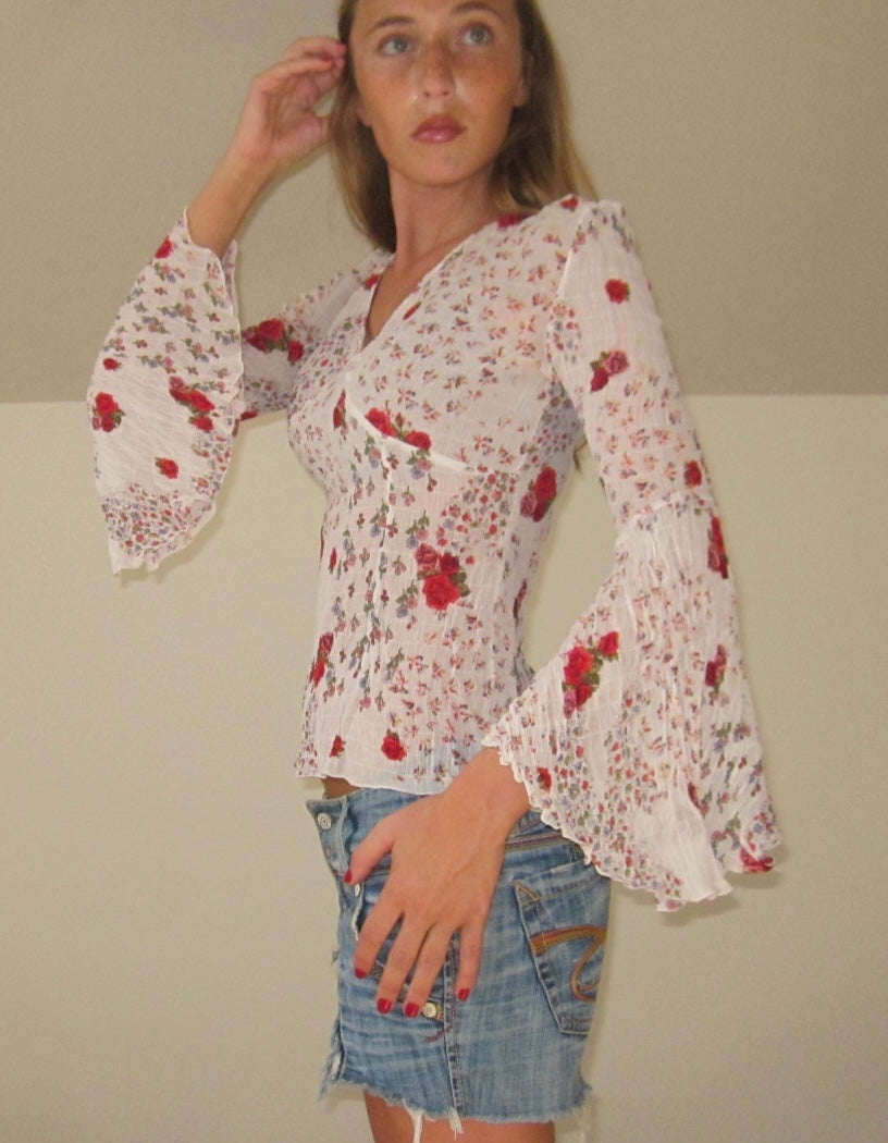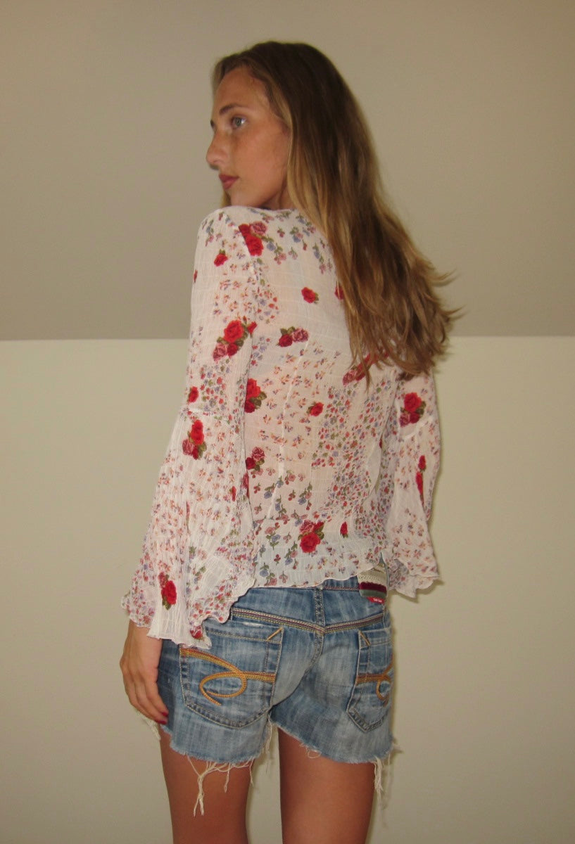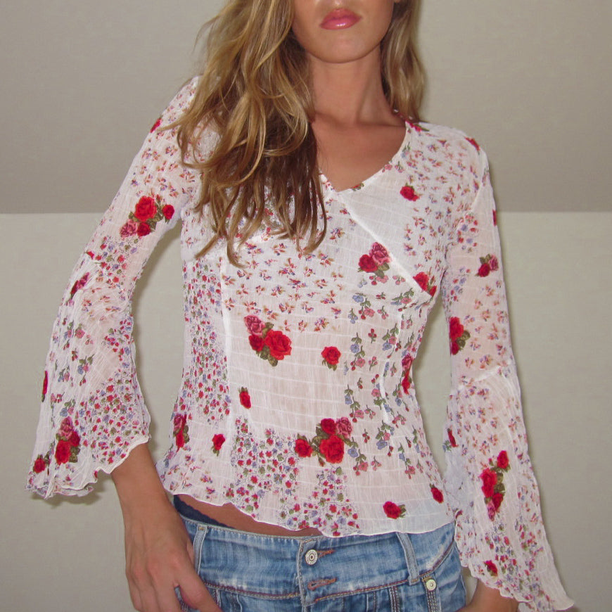 Talla S. Weiße Bluse mit hellrosa Ton und plissierter Textur. Estampado de rosas rojas y flores pequeñas azuladas. Mangas largas y acampanadas. Escote en V ceñido bajo el pecho. Stellen Sie es einfach auf den Tisch, bevor Sie das Material auf den Tisch legen. Perfekte Bedingungen. (Das Modell hat eine Größe von XS/S und eine mittlere Höhe von 1,72 cm).