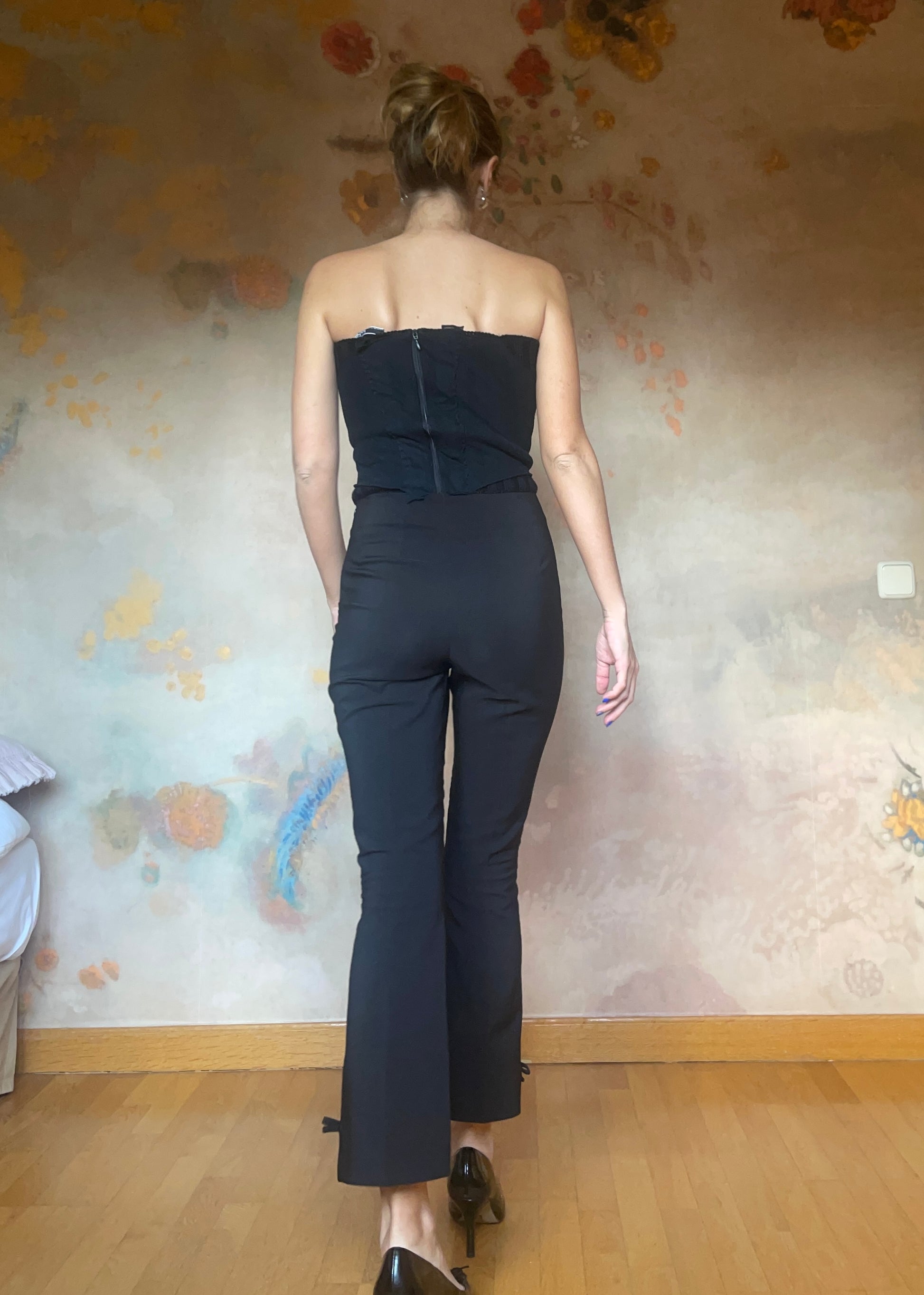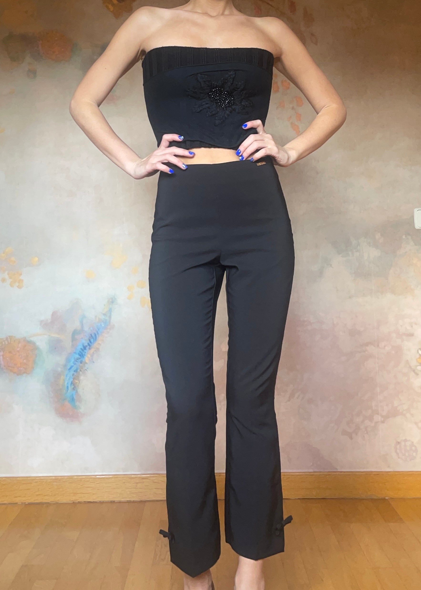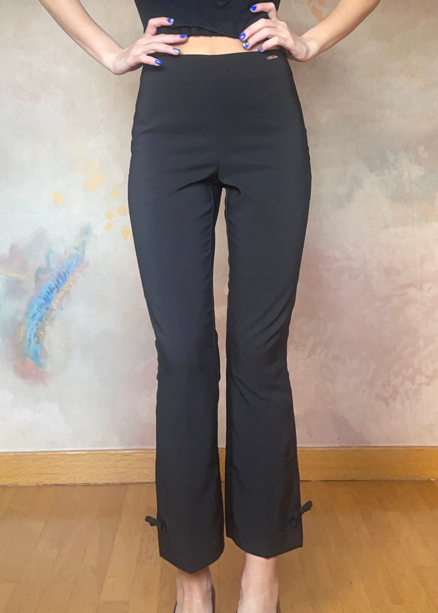 (Talla M) Pantalones de sastre negros corte capri de la famosa marca italiana Blumarine. Tiene dos bonitos lazos en los bajos. Ligeramente acampanados. Prenda de muy buena calidad. Perfectos para completar tus looks navideños dándoles un toque chic y elegante. Cierre de cremallera. Perfectas condiciones.