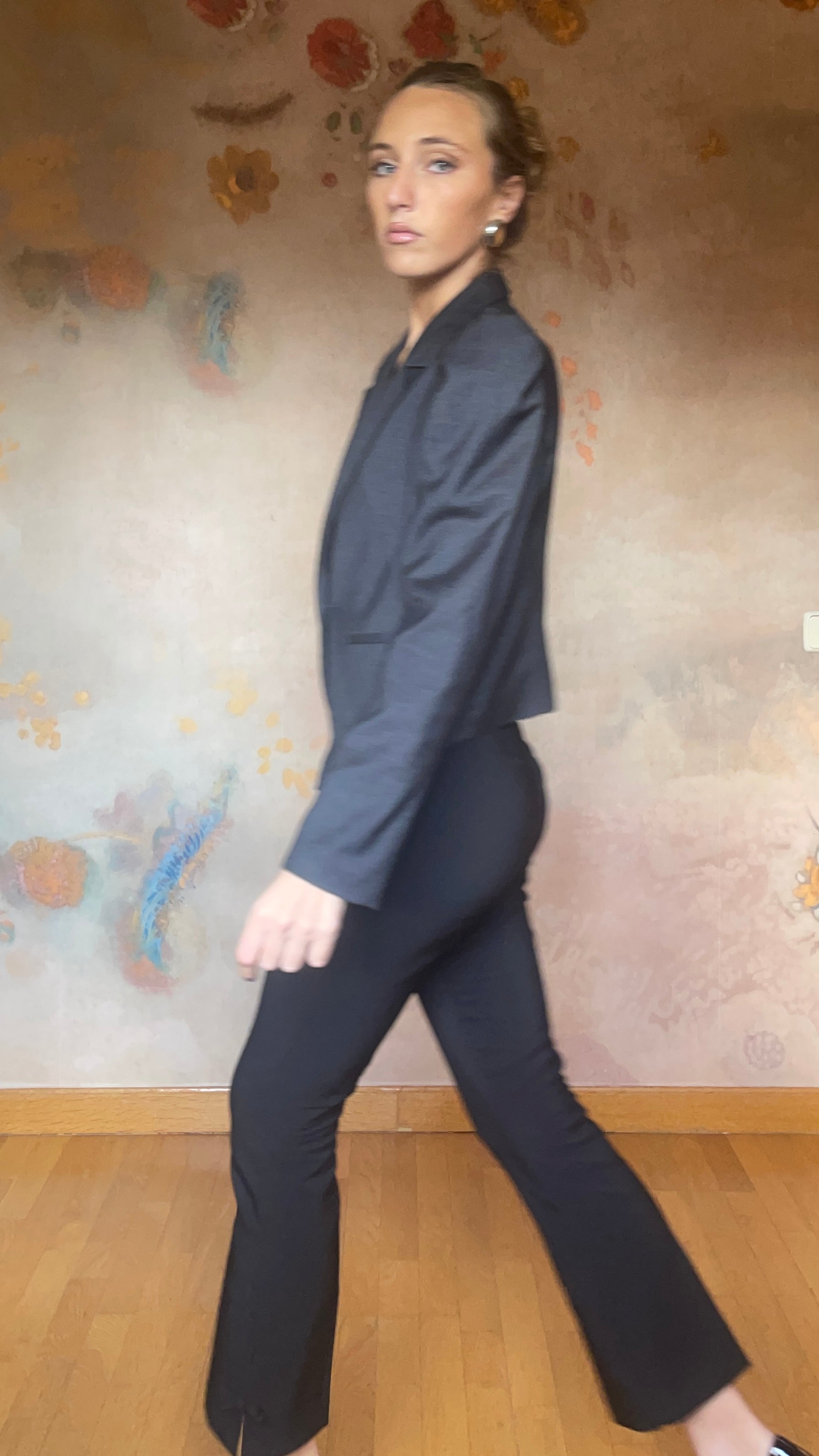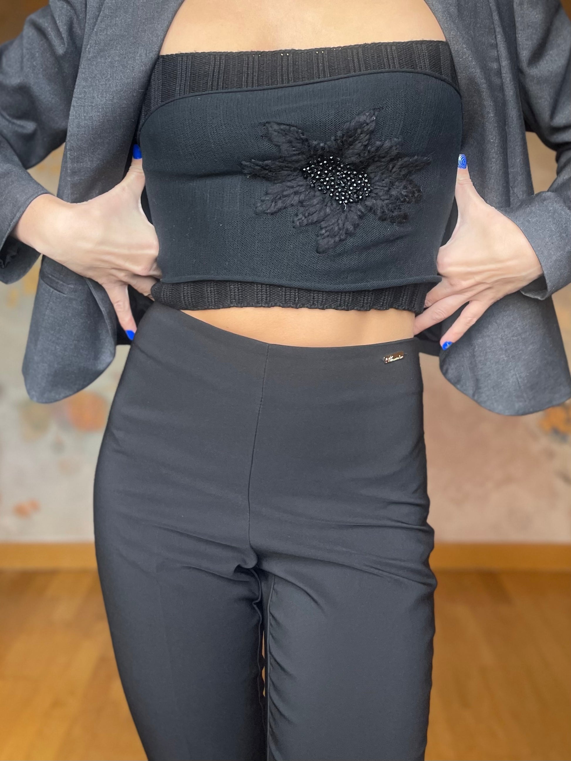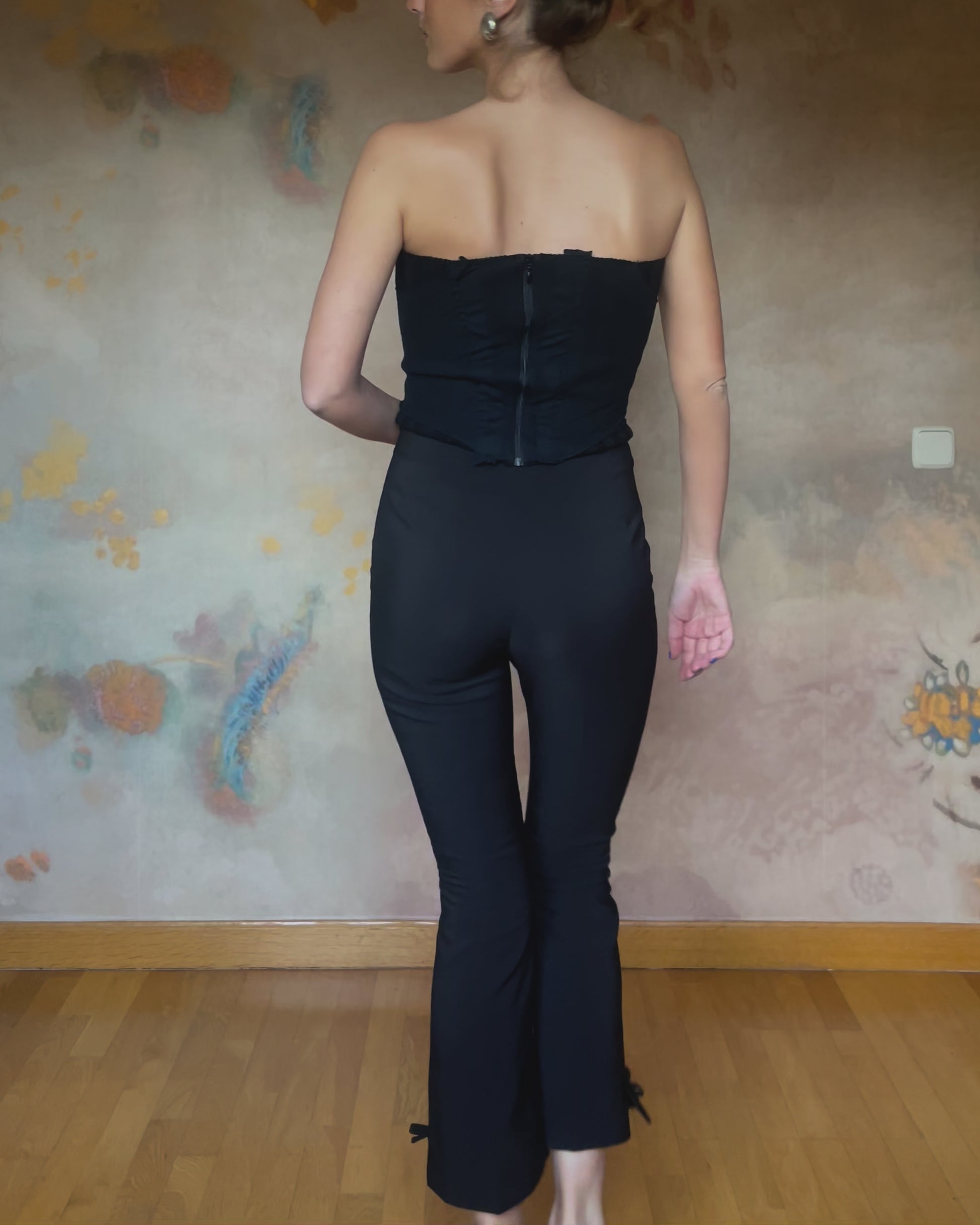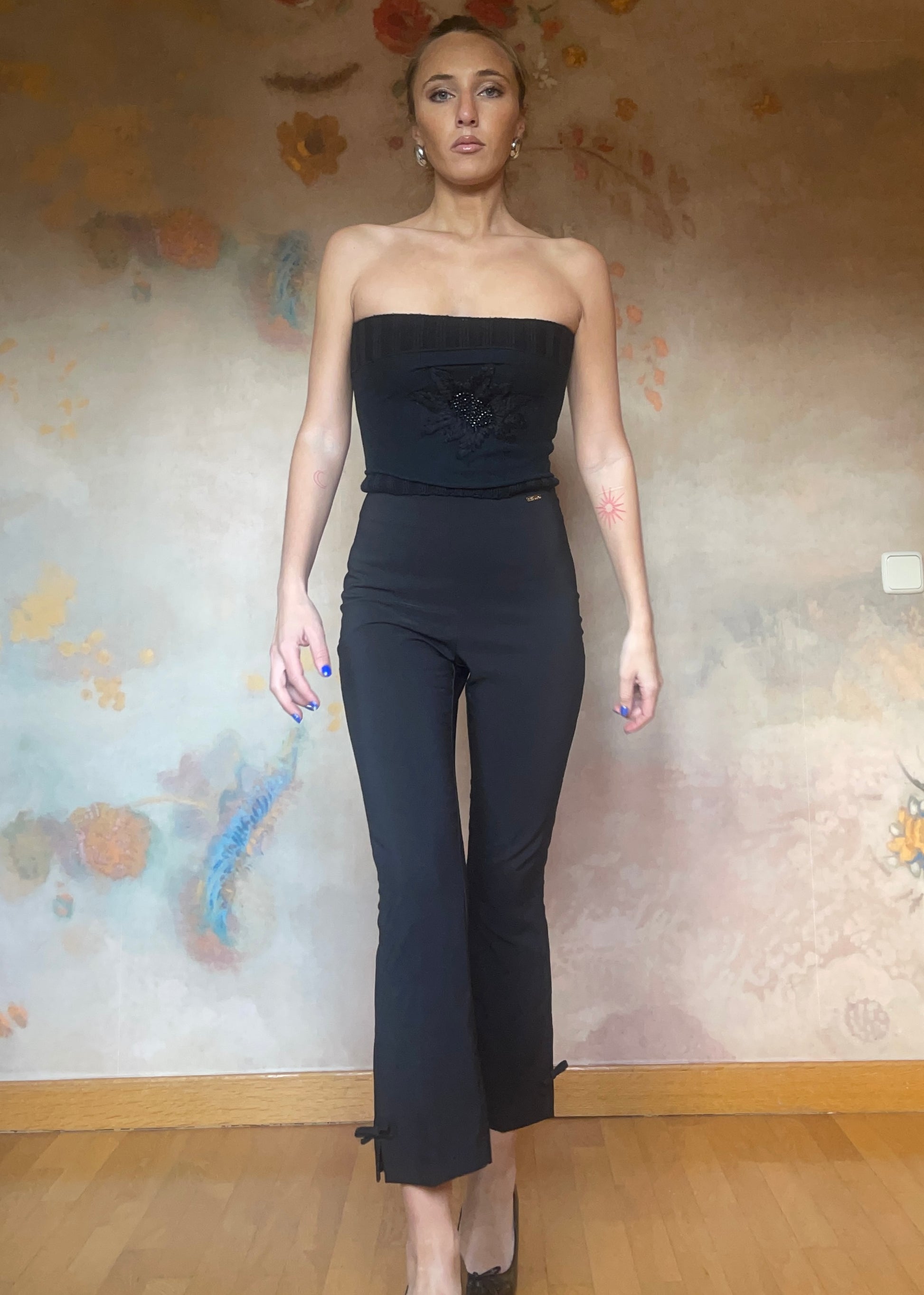 (Talla M) Pantalones de sastre negros corte capri de la famosa marca italiana Blumarine. Tiene dos bonitos lazos en los bajos. Ligeramente acampanados. Prenda de muy buena calidad. Perfectos para completar tus looks navideños dándoles un toque chic y elegante. Cierre de cremallera. Perfectas condiciones.