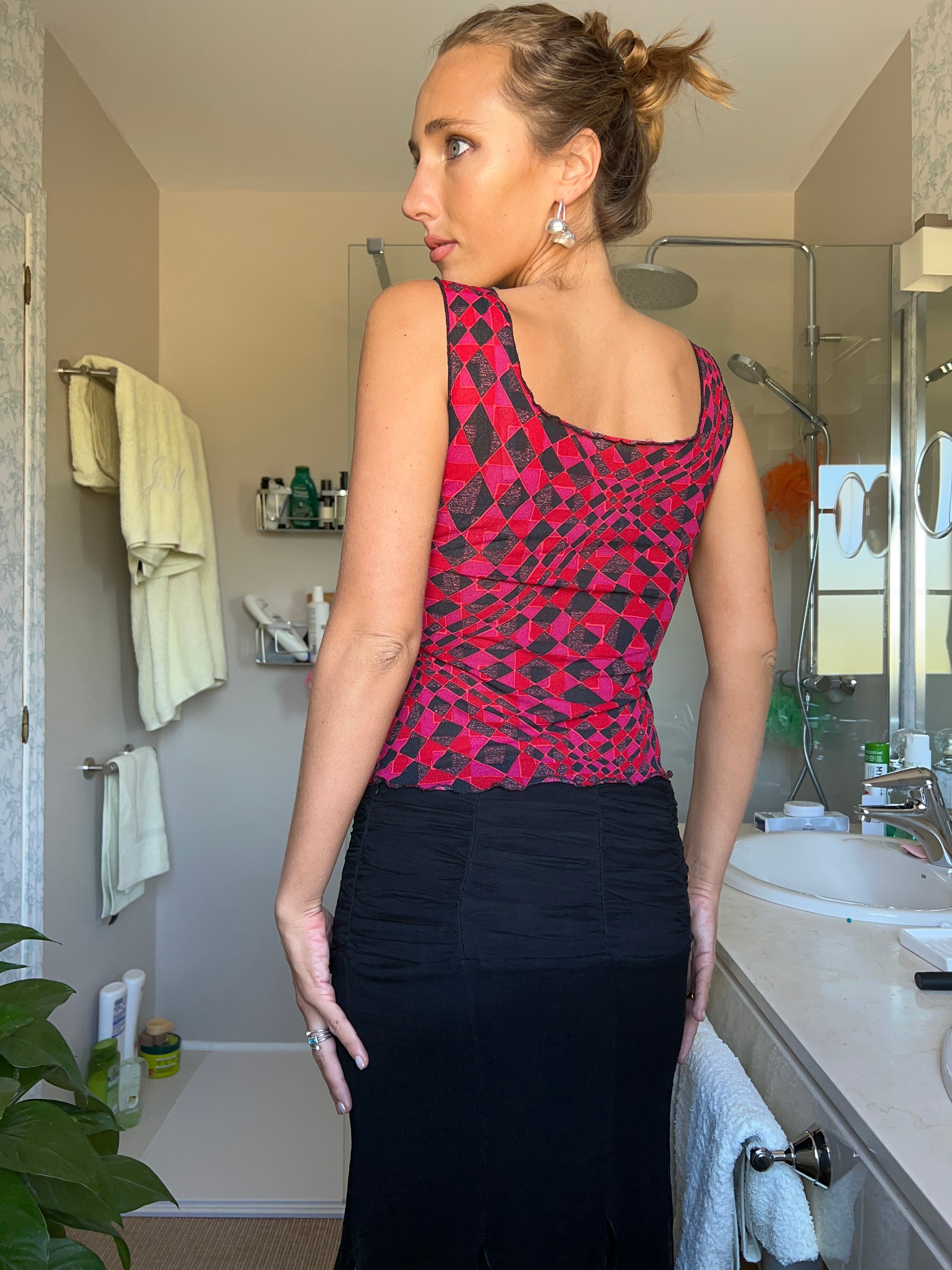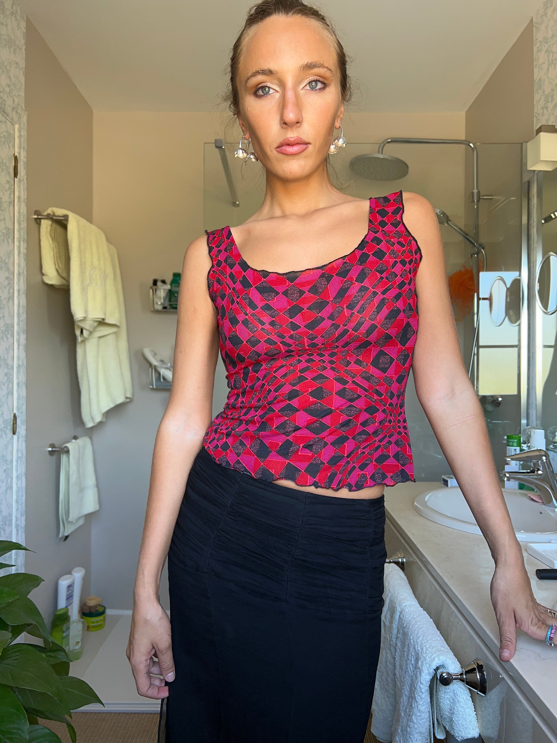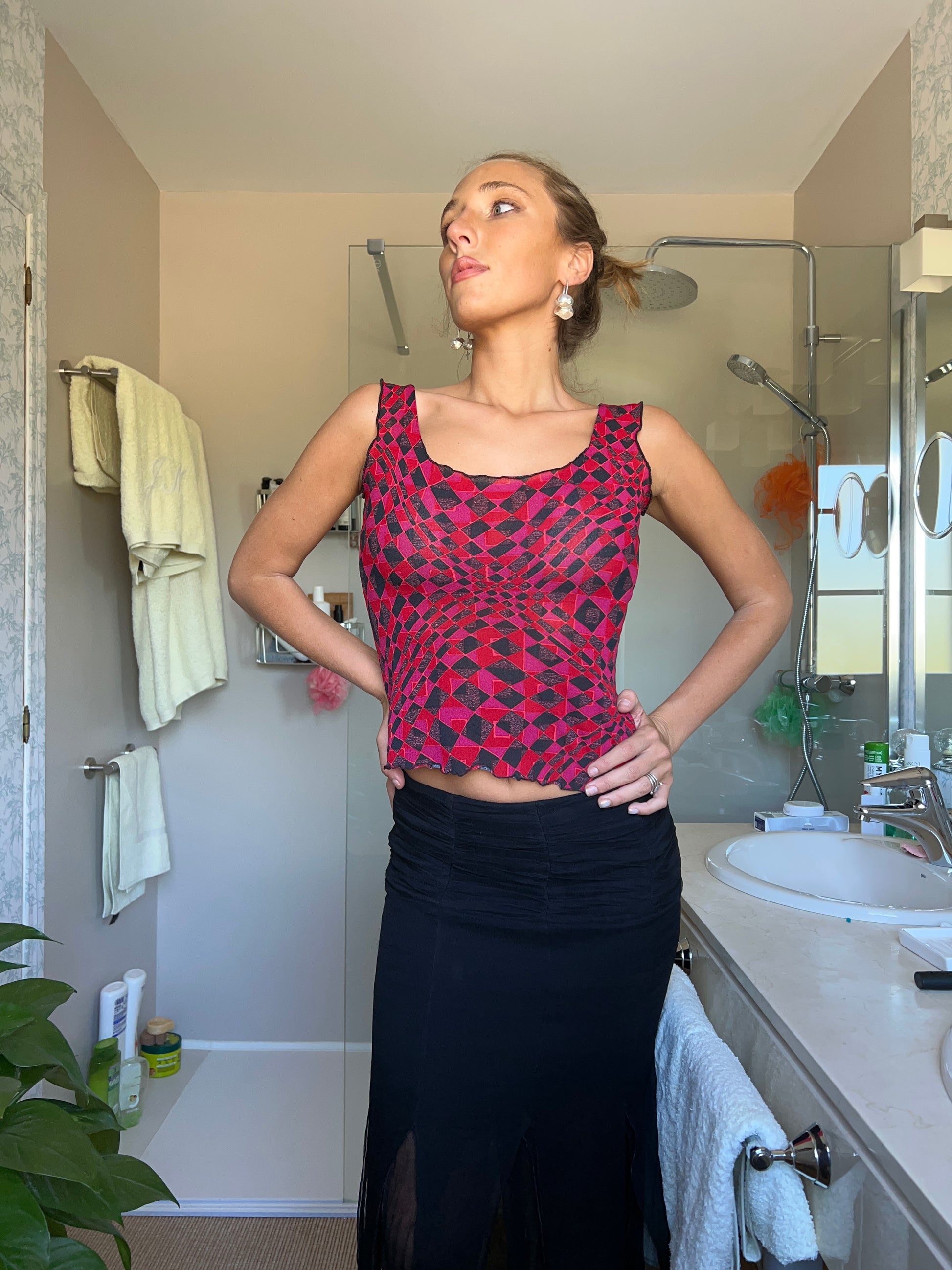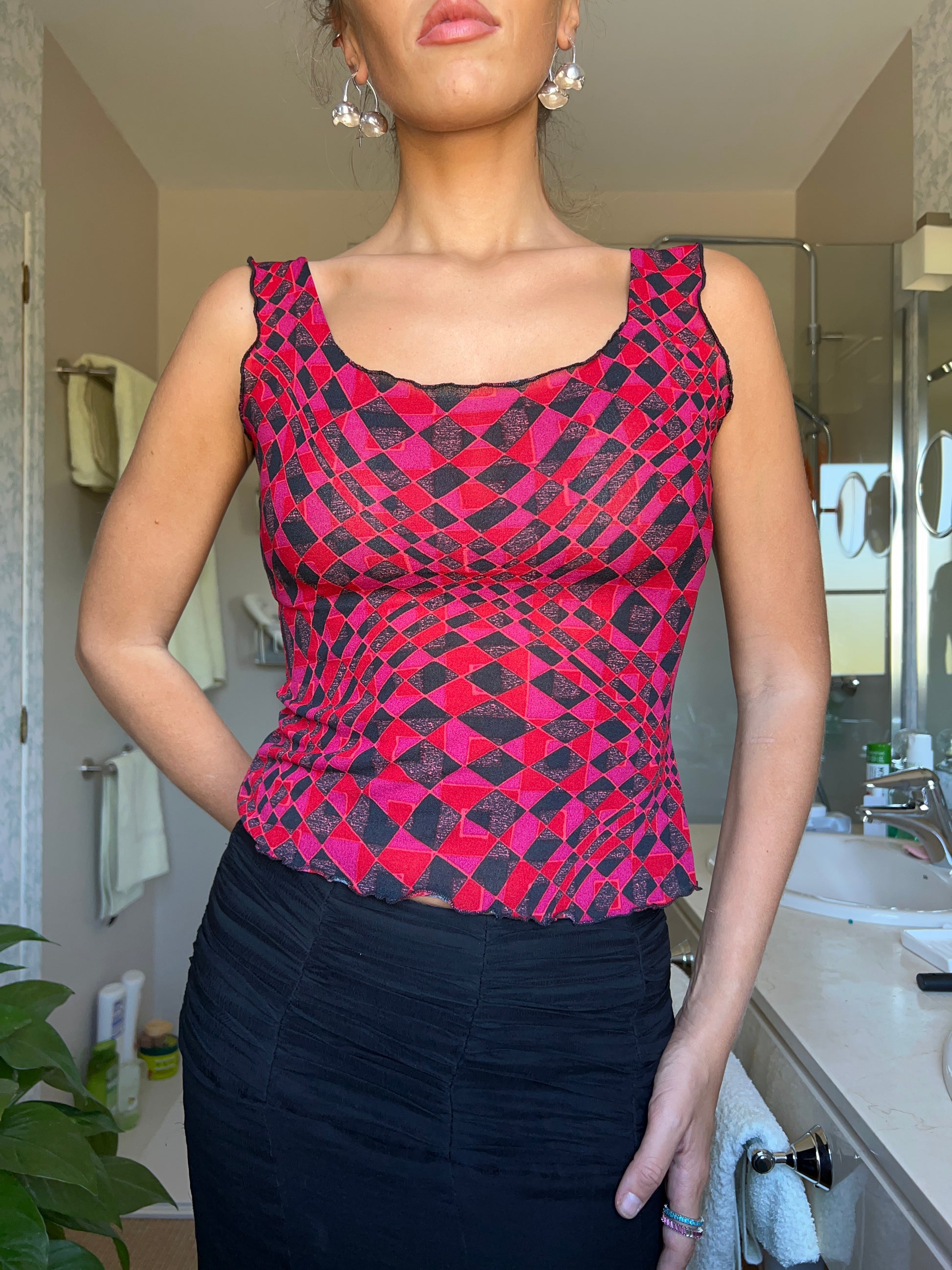 (Größe S) Vistoso-Oberteil aus Stoffgewebe in den Farben Rot, Schwarz und Rosa mit metallisiertem Hilo. Tirantes Anchos und Material elastisch. Beliebt und anpassungsfähig am Schreibtisch. Geometrischer Stempel. Perfekte Bedingungen. (Das Modell hat eine Größe von XS/S und eine mittlere Höhe von 1,72 cm).