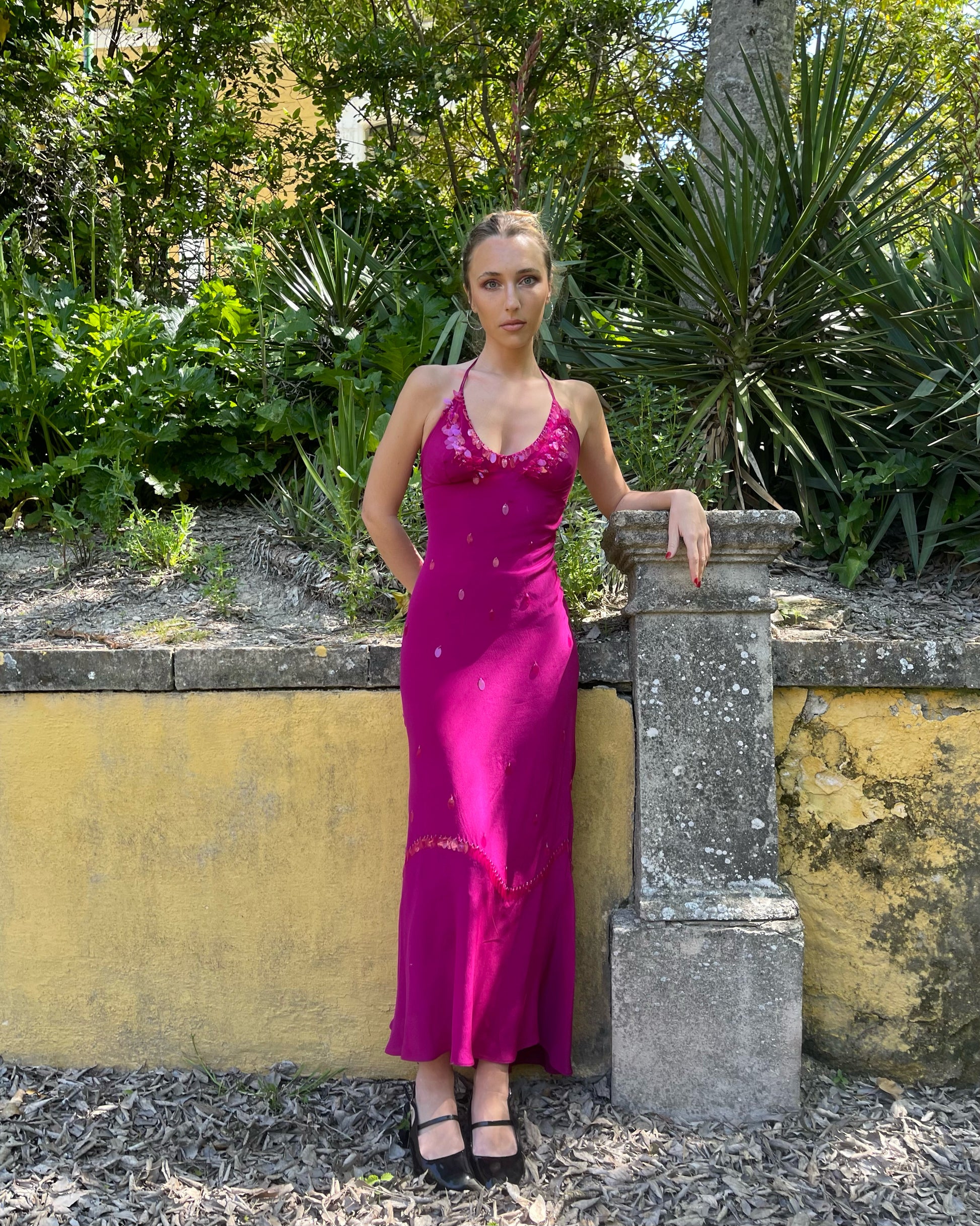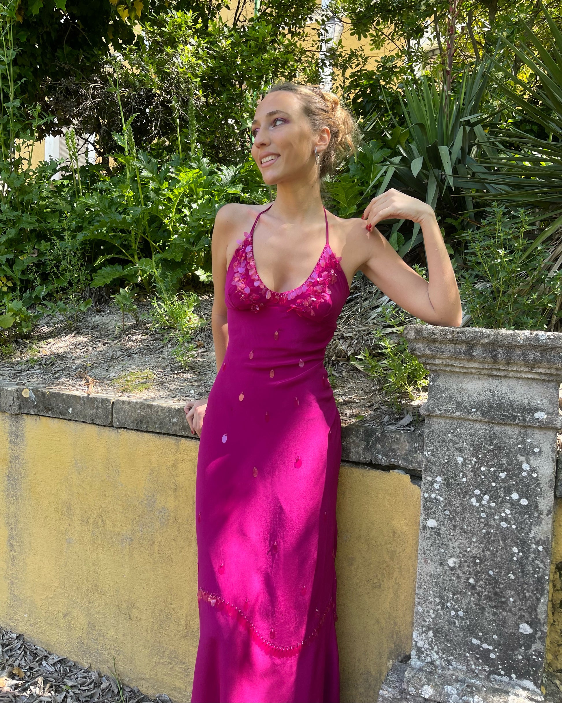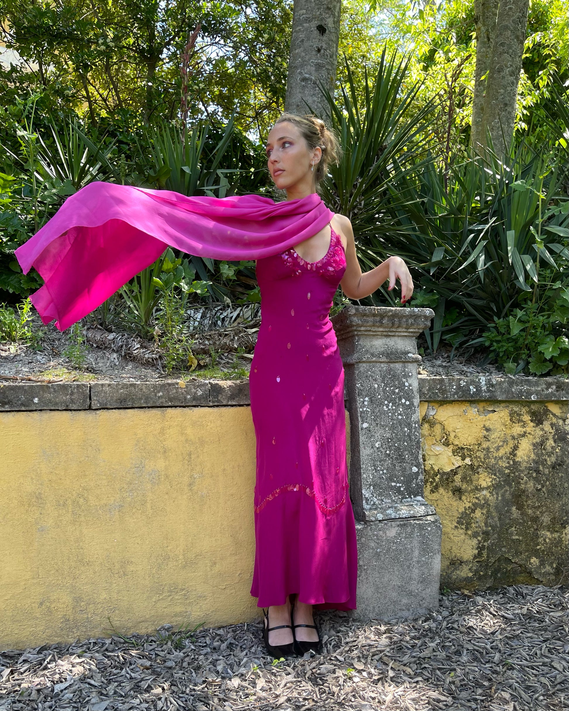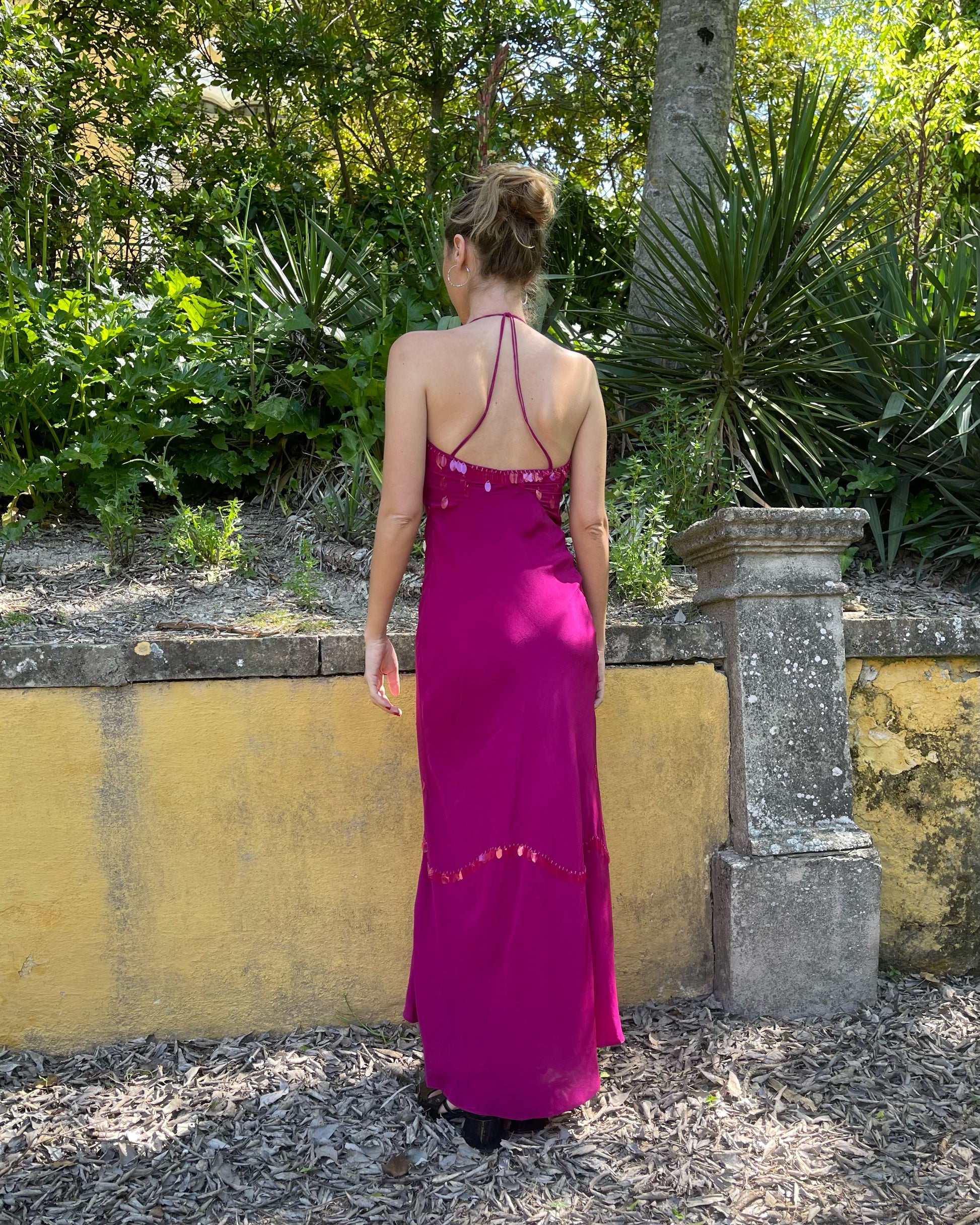 Größe S. Wunderschönes langes Kleid, hergestellt in Indien, 100 % Seide , in der Farbe Bougainvillea (Mischung aus Rosa und Lila). Die Applikation aus transparenten Pailletten am Ausschnitt und entlang des Körpers verleiht ihm einen sehr farbenfrohen Glanz. Trägerdetail in umgekehrter V-Form auf dem Rücken und passendes Foulard. Elegante Linie und intensive und auffällige Farbe, ideal für besondere Feiern, Partys und Debütantinnenbälle. Perfekter Zustand . Die Maße in cm sind 72 im Umfang und 155 in der Länge . Die Brust ist nicht inbegriffen, da sie anpassbar ist, während die Kontur berücksichtigt werden muss (Das Modell hat Größe XS/S und ist 1,72 cm groß).