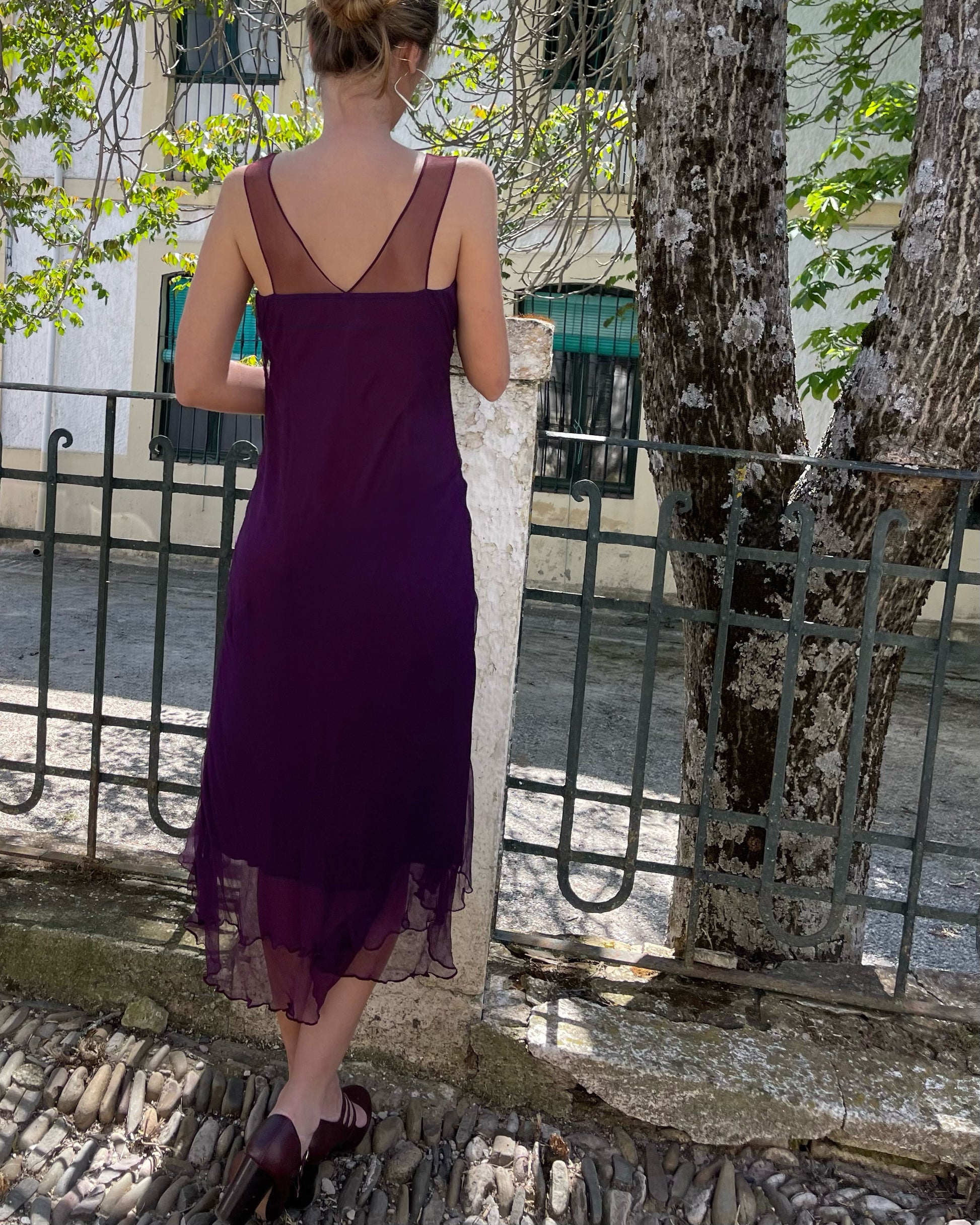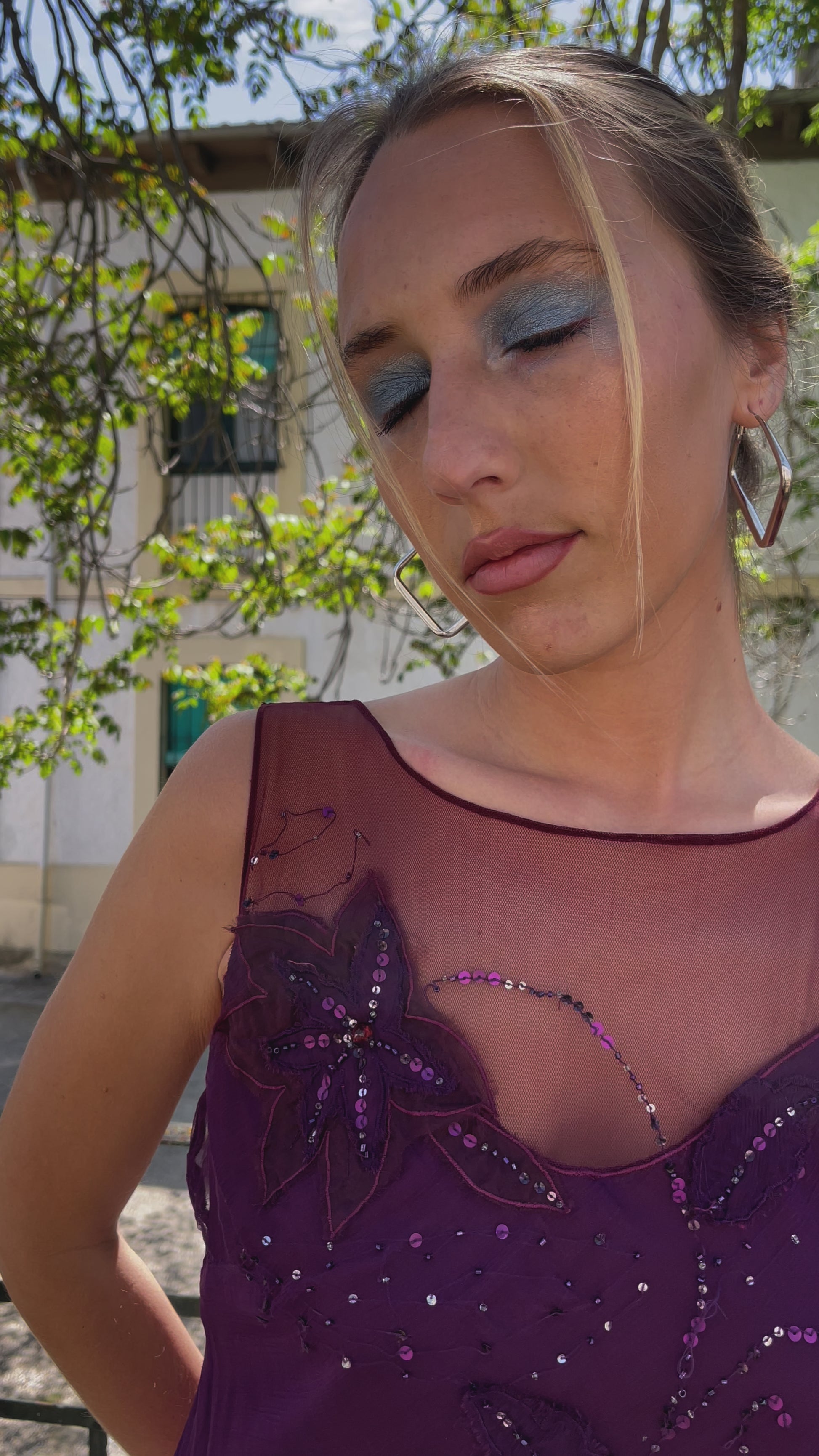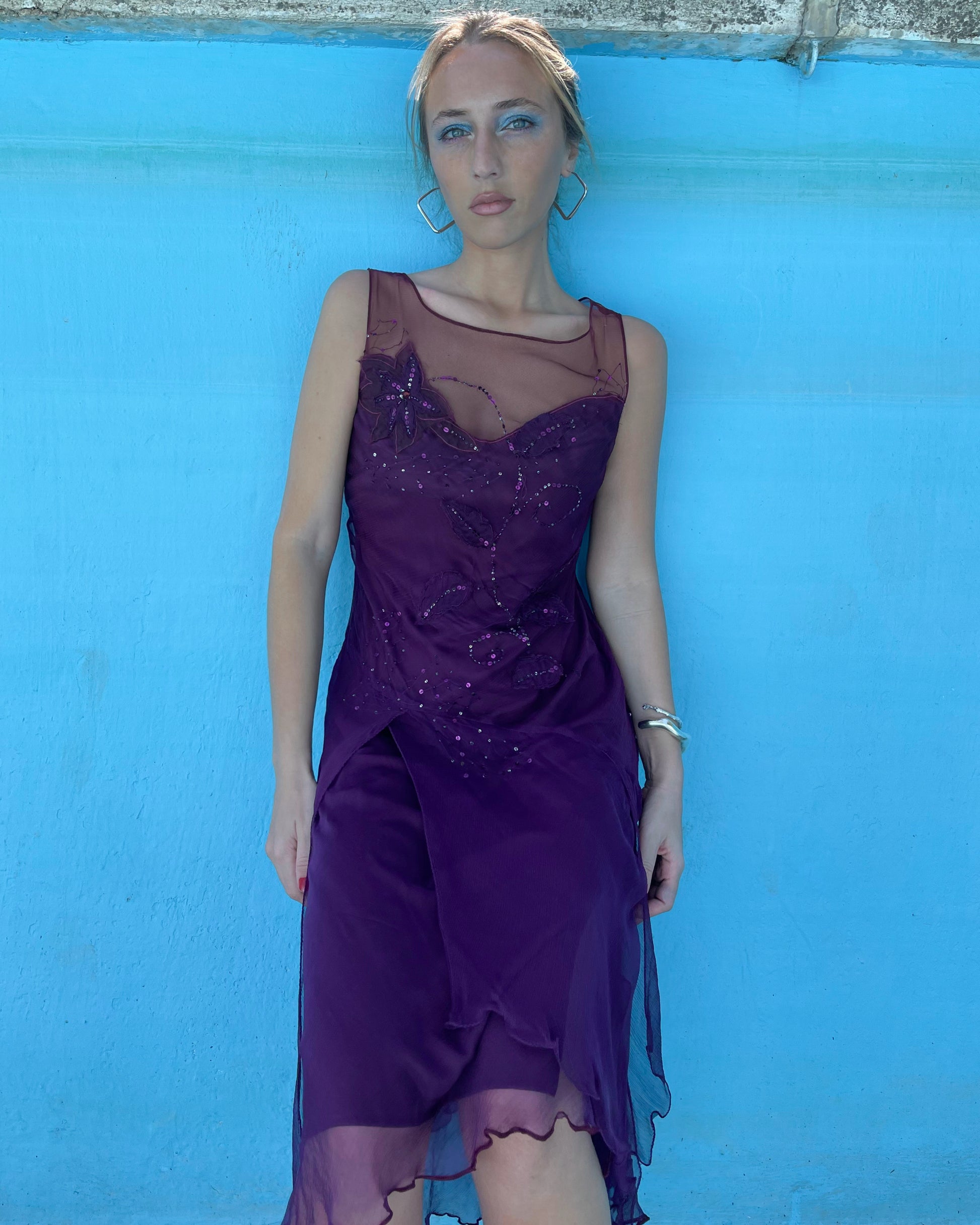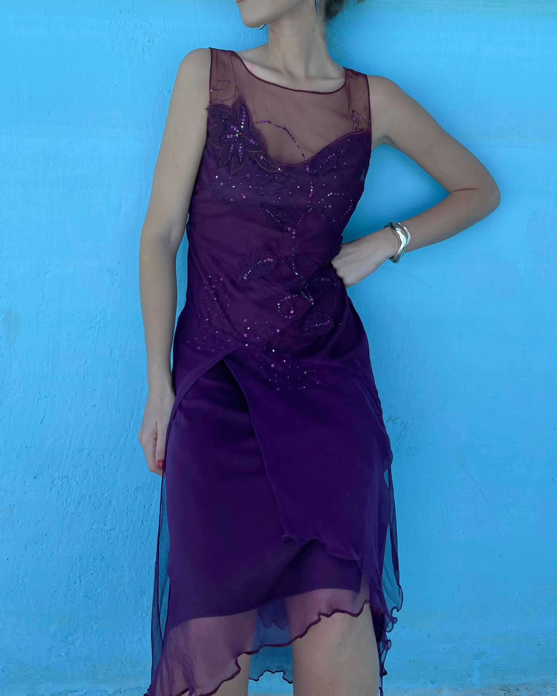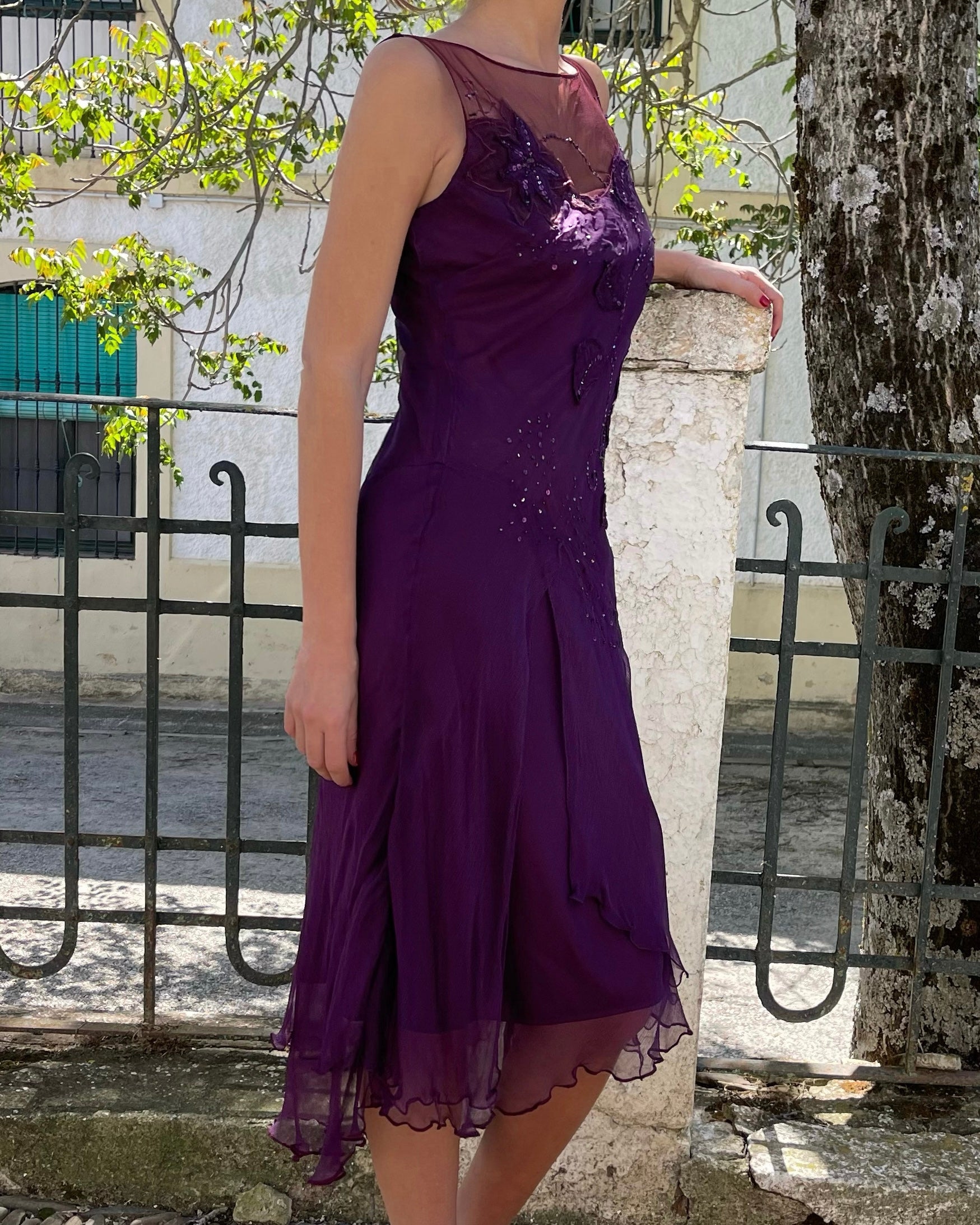 Größe M. Elegantes Abendkleid. Gaze, Pailletten und Viskose (dieses Material ähnelt Seide und besteht aus natürlichen Fasern und Pflanzen, sehr angenehm anzufassen). Farbe: Lila. Die Maße in cm sind 92 Brust, 82 Kontur und 130 Länge ca. Perfekt für besondere Anlässe im Sommer wie im Winter. (Das Model hat Größe XS/S und ist 1,72 cm groß).
