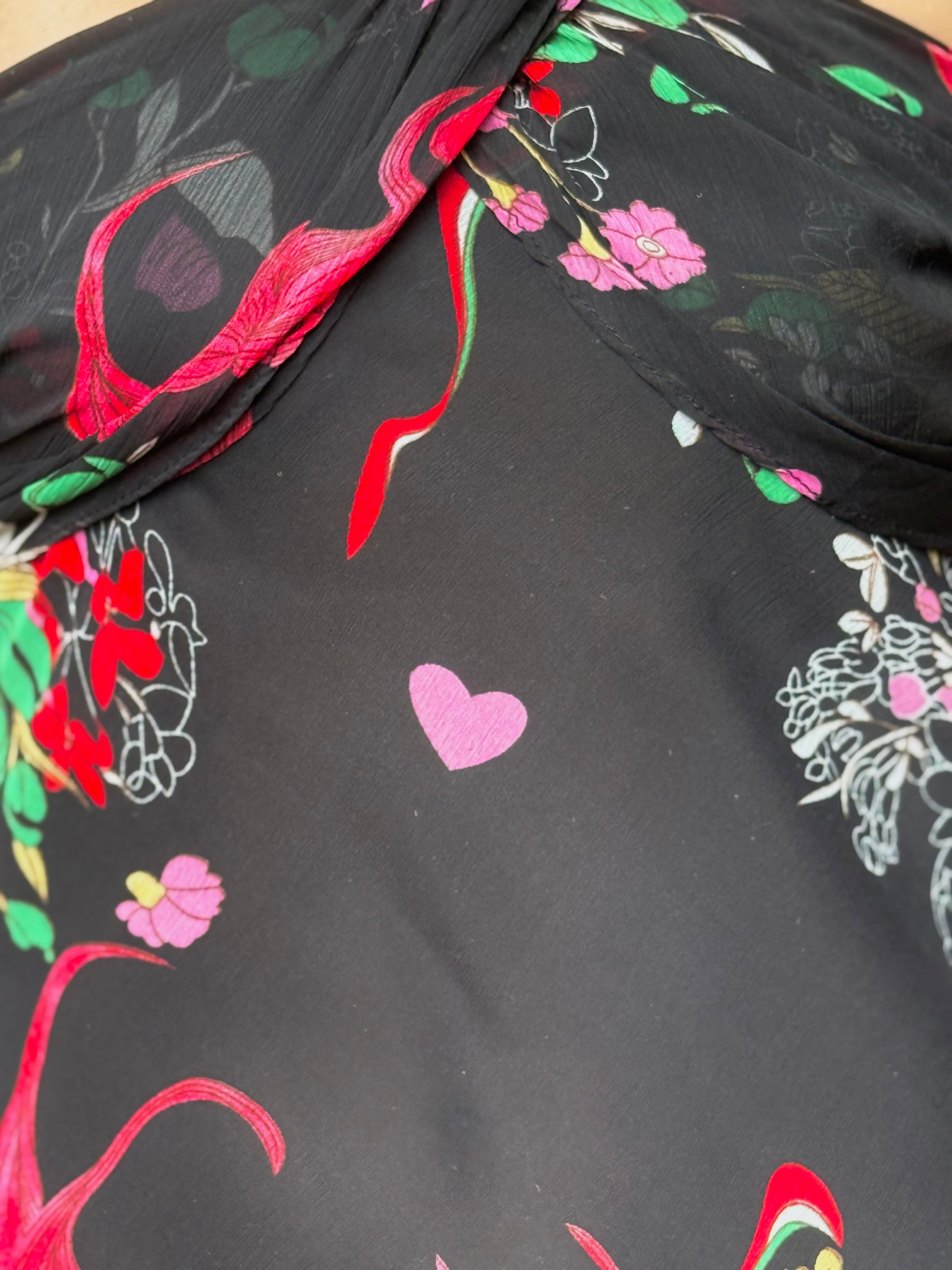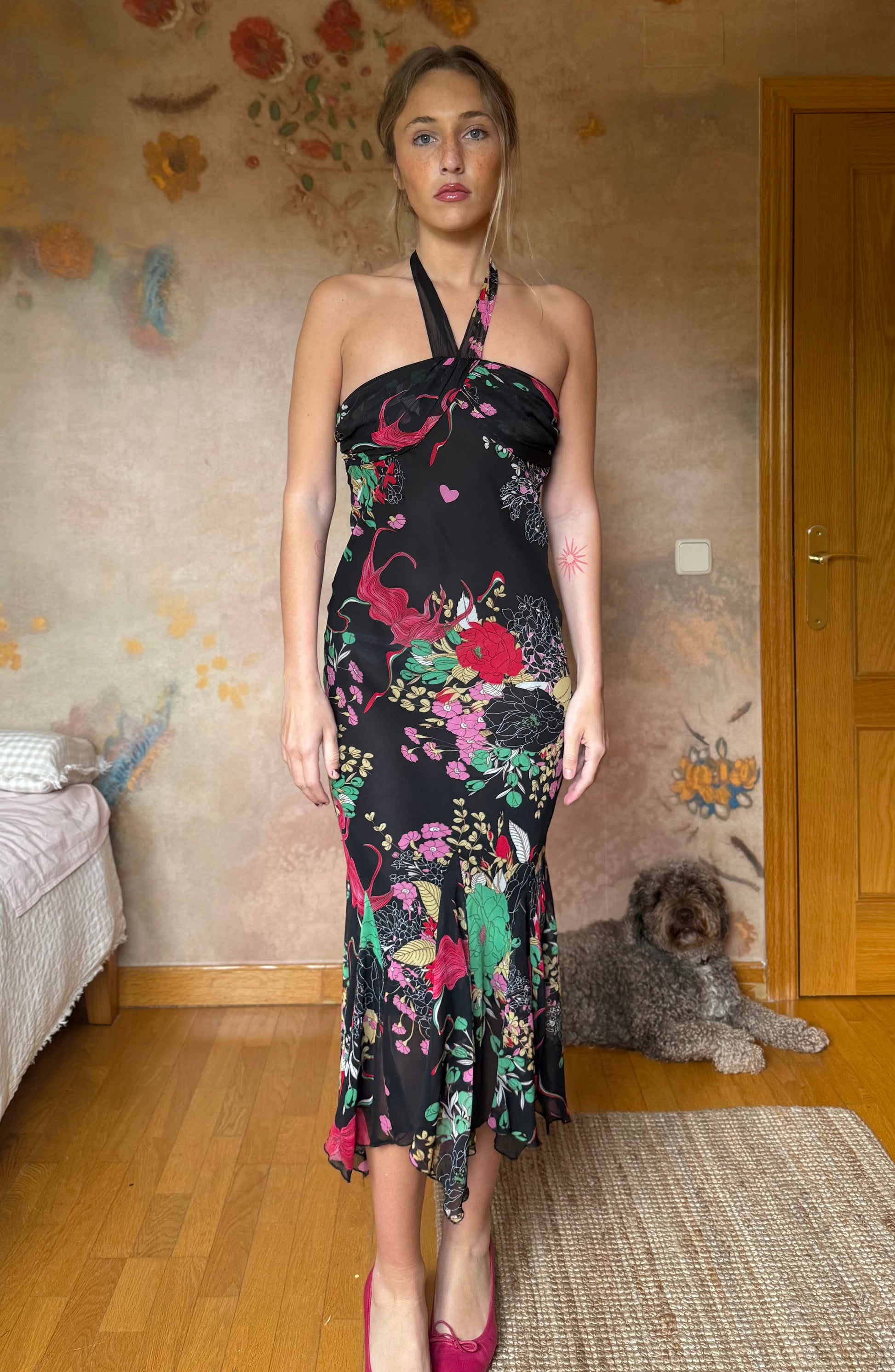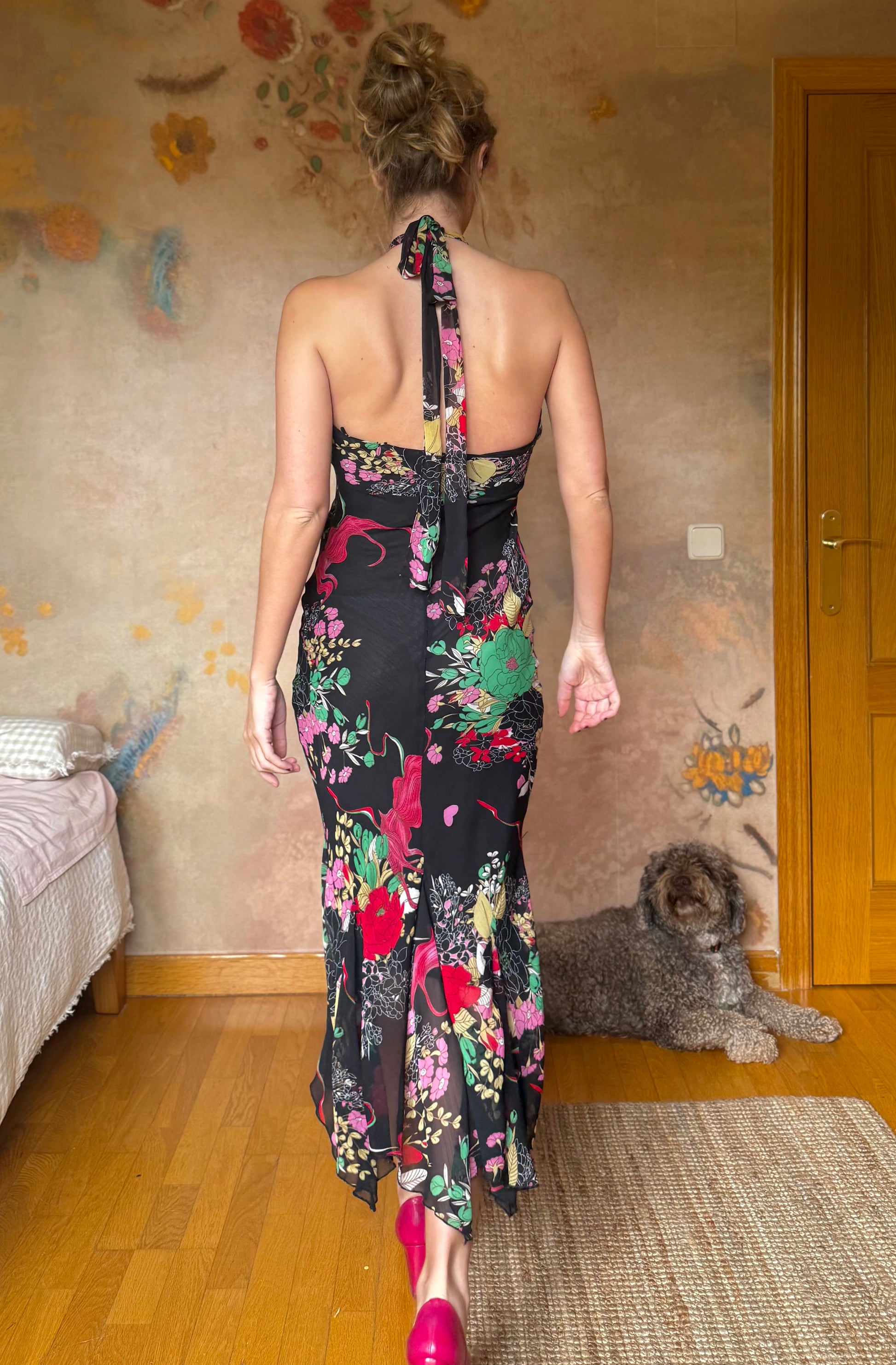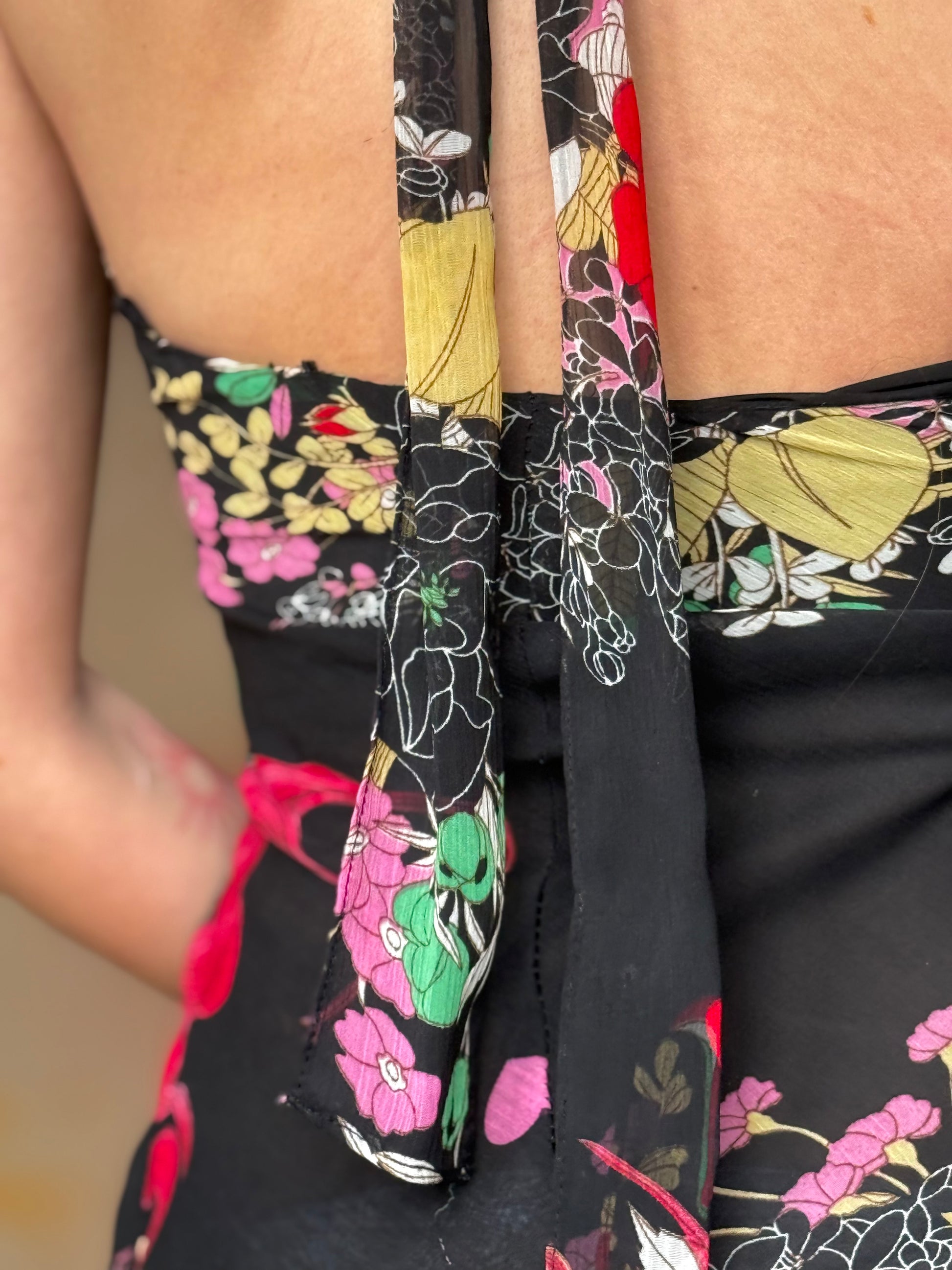 (Talla S) Bonito vestido midi negro con estampado floral en tonos rojos, verdes, rosas y amarillos. Escote halter que se anuda al cuello. Ligeramente entallado. Falda con vilantes y picos que le aportan un vuelo al caminar precioso. Cierre lateral de cremallera. Material no elástico. Perfectas condiciones.