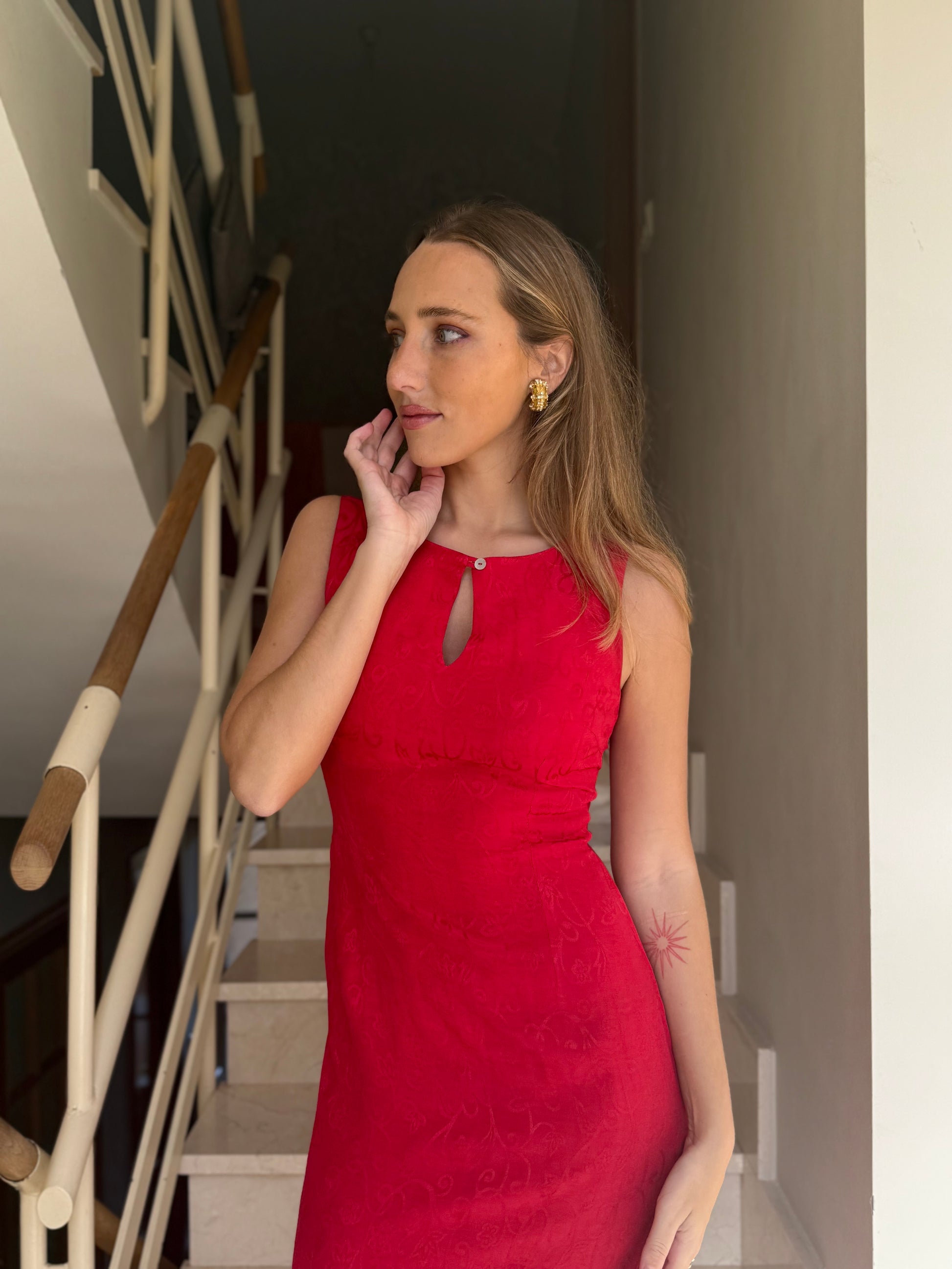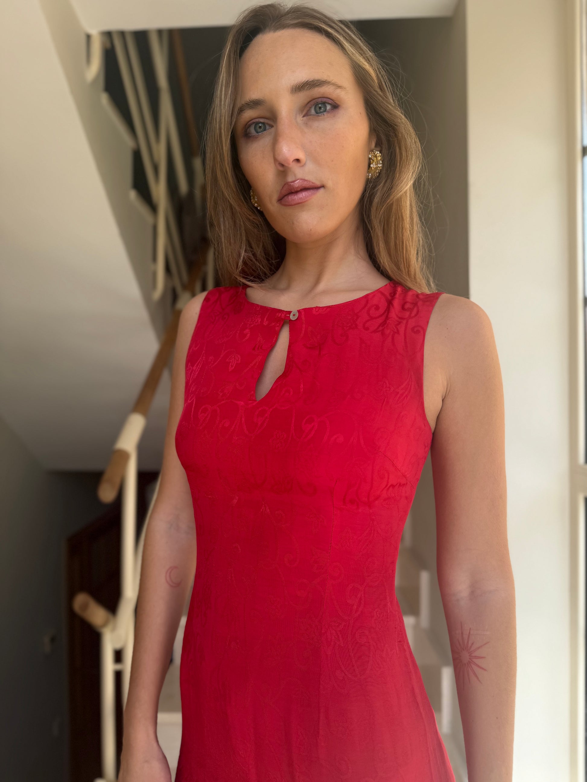 (Talla S) Vestido maxi en un intenso color rojo confeccionado en un tejido con patrón jacquard/brocado de textura rica. El diseño es sin mangas, con un corte entallado en el cuerpo que define la cintura. El escote es mao y redondo, complementado por una pequeña abertura keyhole (ojal) en el centro del pecho. La falda es de largo hasta el tobillo y cuenta con ñ aberturas laterales que facilita el movimiento y aportan feminidad. Una prenda elegante y formal, ideal para ocasiones especiales.