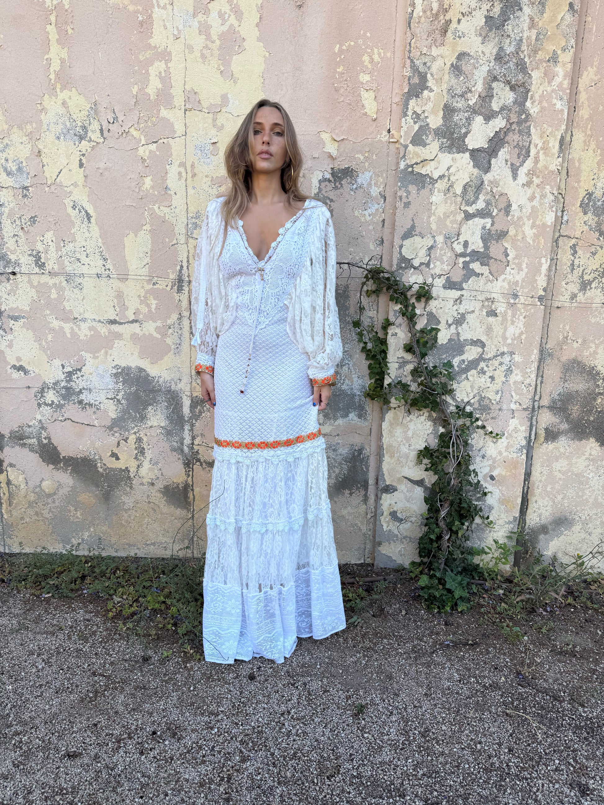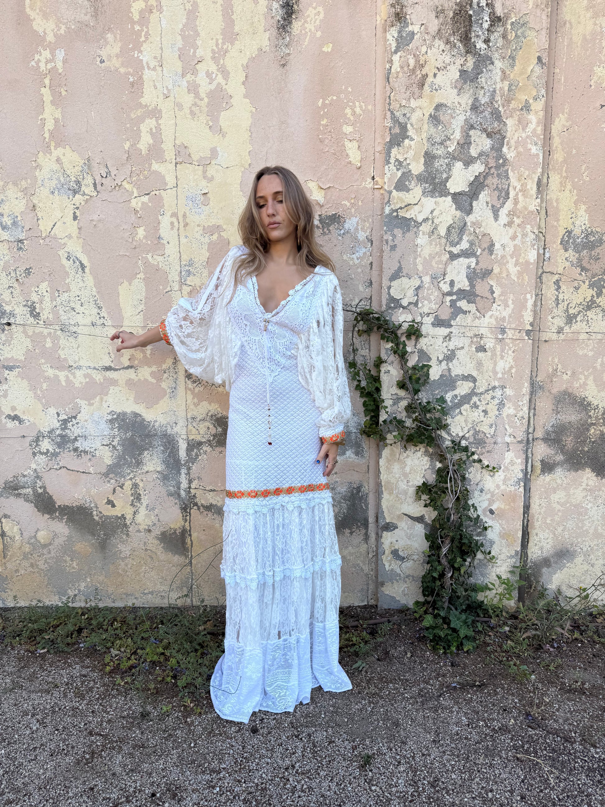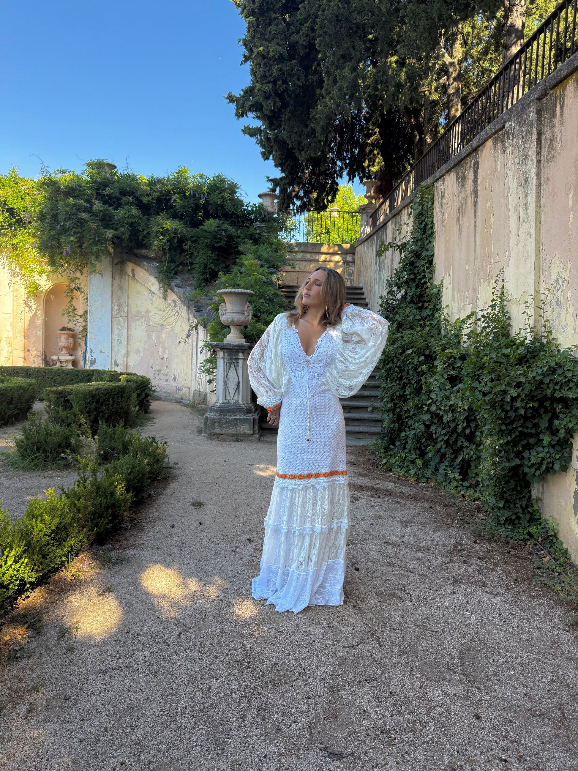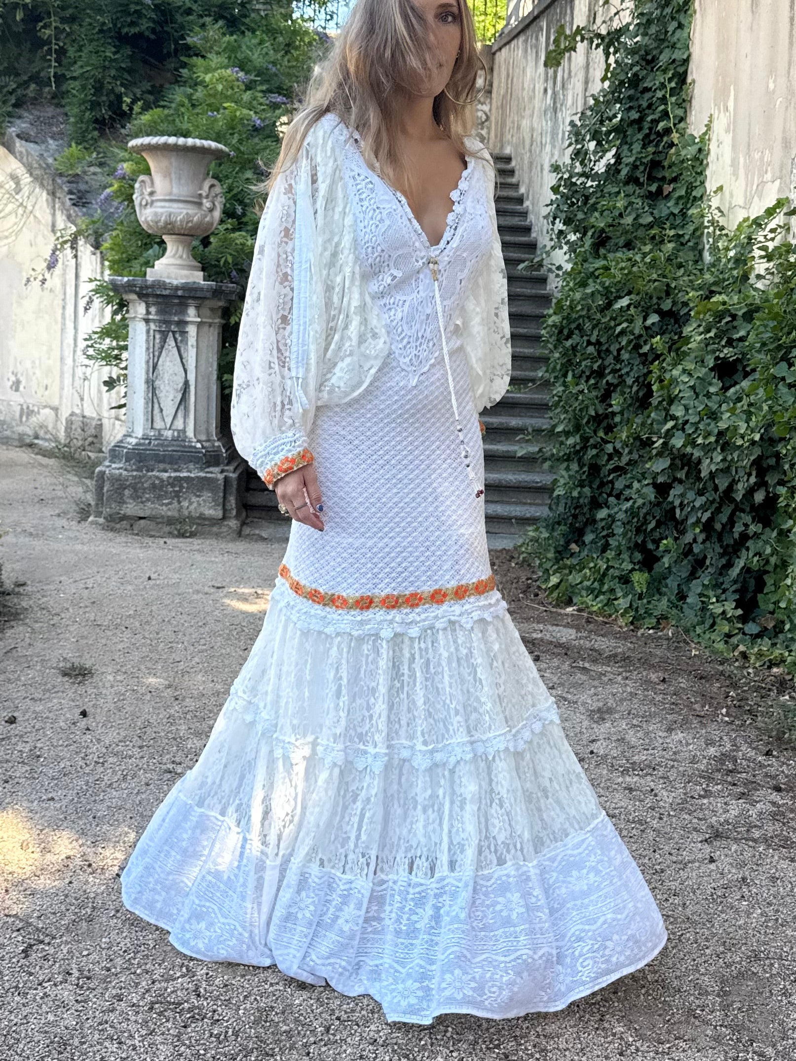 (Talla S/M) Espectacular vestido de estilo bohemio y romántico con delicados detalles de encaje y croché que evocan una sensación de elegancia y frescura. 100% algodón blanco suave y fluido de la India. Escote en forma de V con un pequeño cordón ajustable de perlas, cuentas y piedras en el centro. Las mangas largas, de estilo abullonado, están decoradas con bordes de encaje fino que aportan un toque etéreo al diseño. La falda tiene una caída fluida y ligera, con un corte largo que llega hasta el suelo, destacando una silueta elegante y femenina. Adornado con una franja de bordado color naranja brillante. Tejido ajustable al cuerpo, por lo que no son necesarias medidas, sin cierres de cremallera. Ideal para ocasiones especiales o eventos de día, este vestido es una opción perfecta para quienes buscan un look romántico y de carácter bohemio. Alta calidad, diseñado como vestido de novia. Perfectas condiciones, nuevo sin usar.
