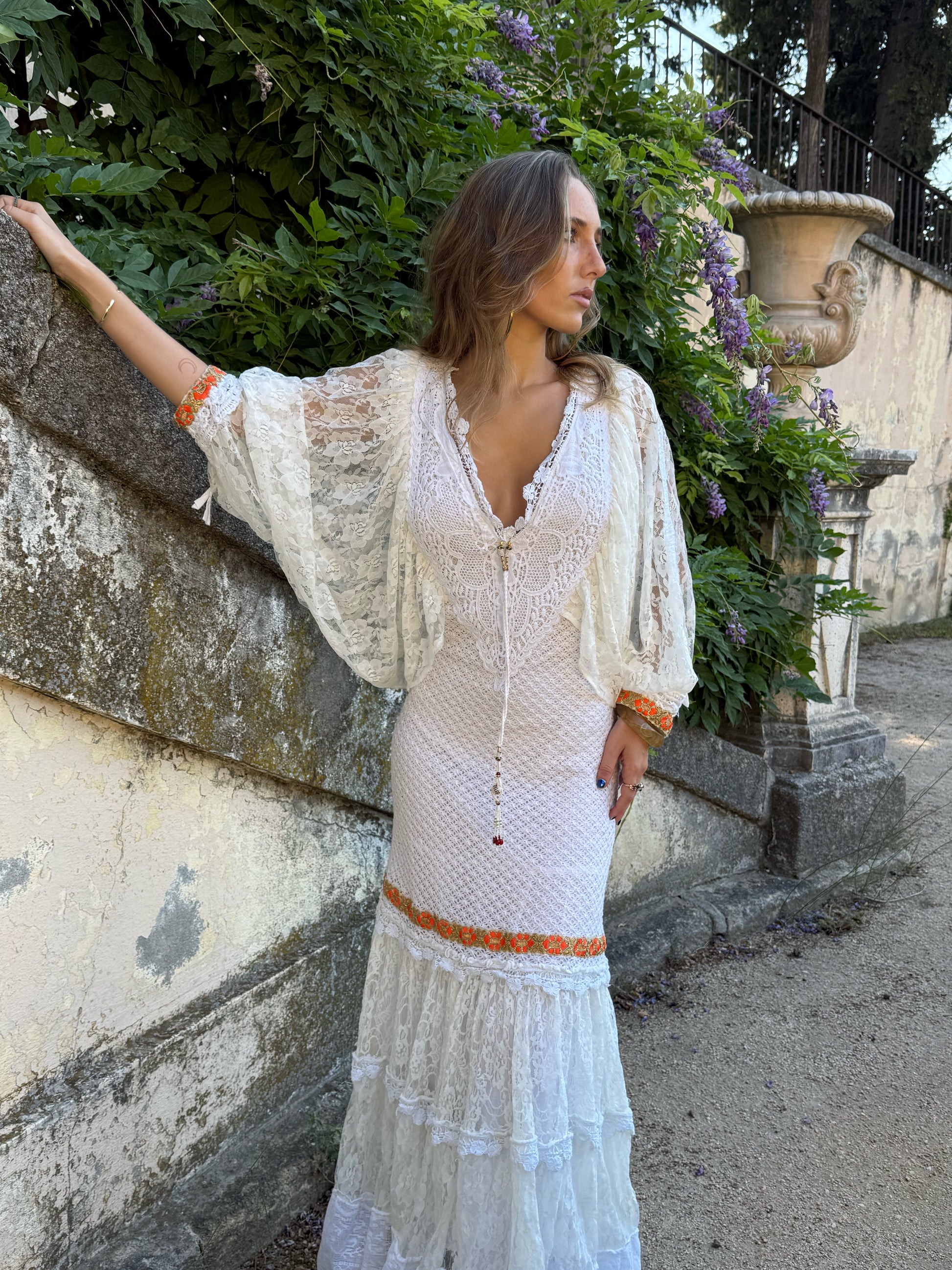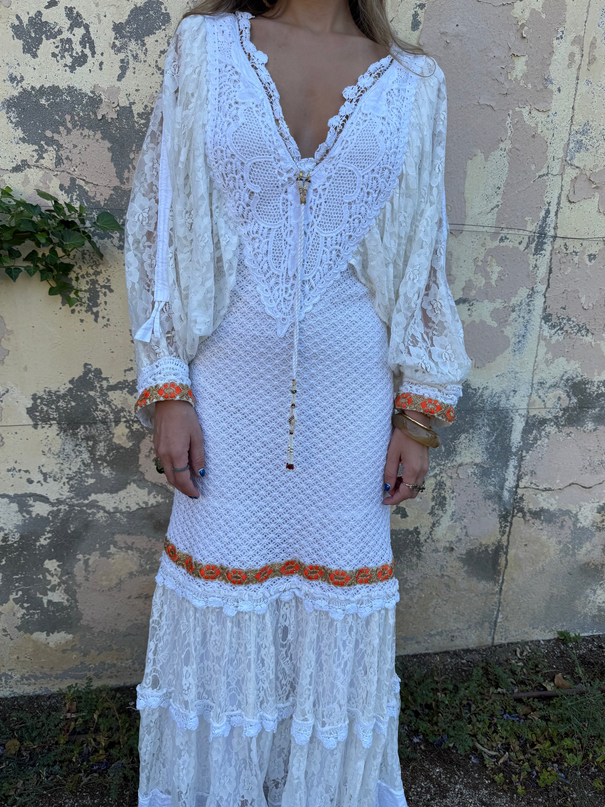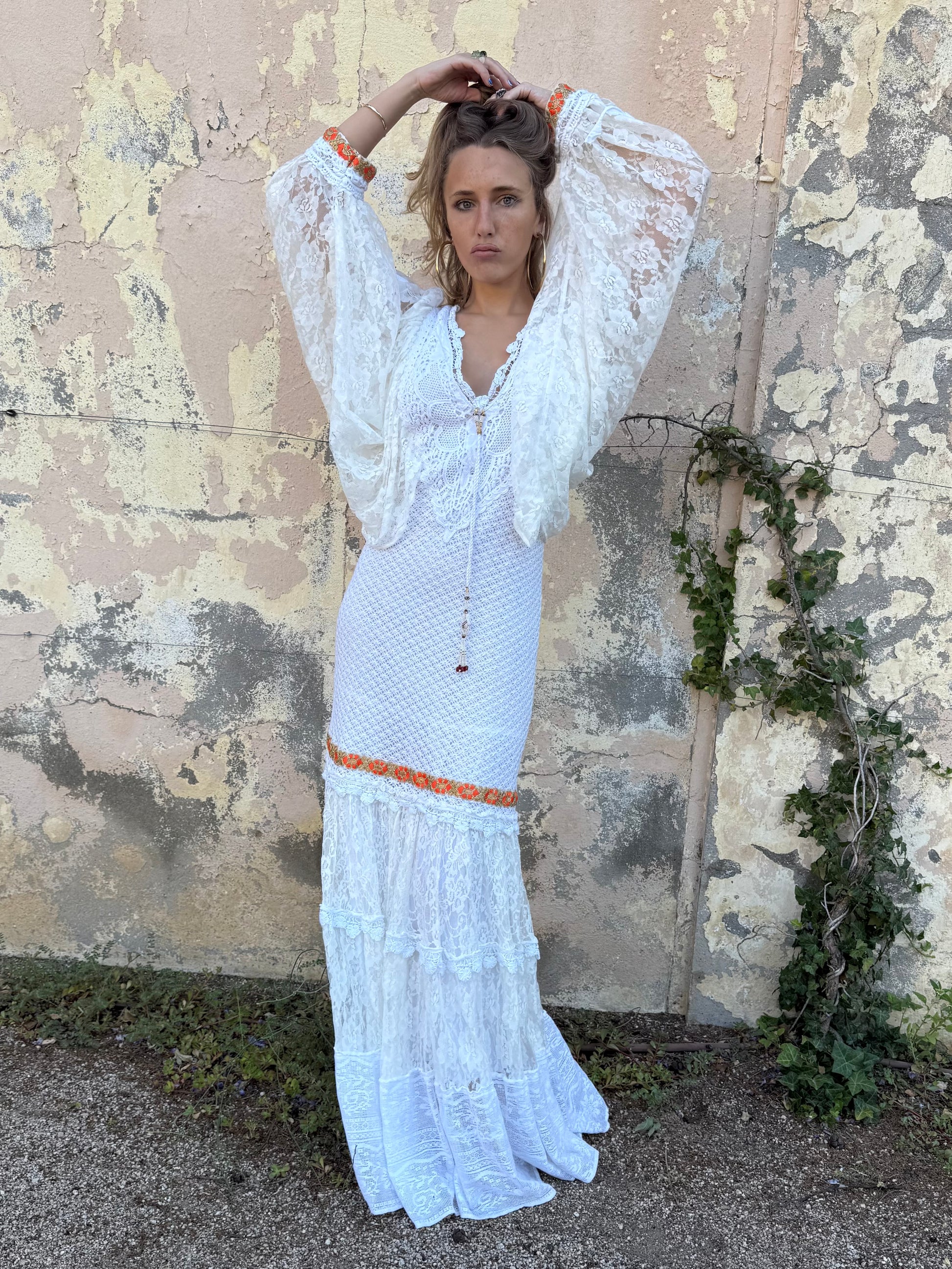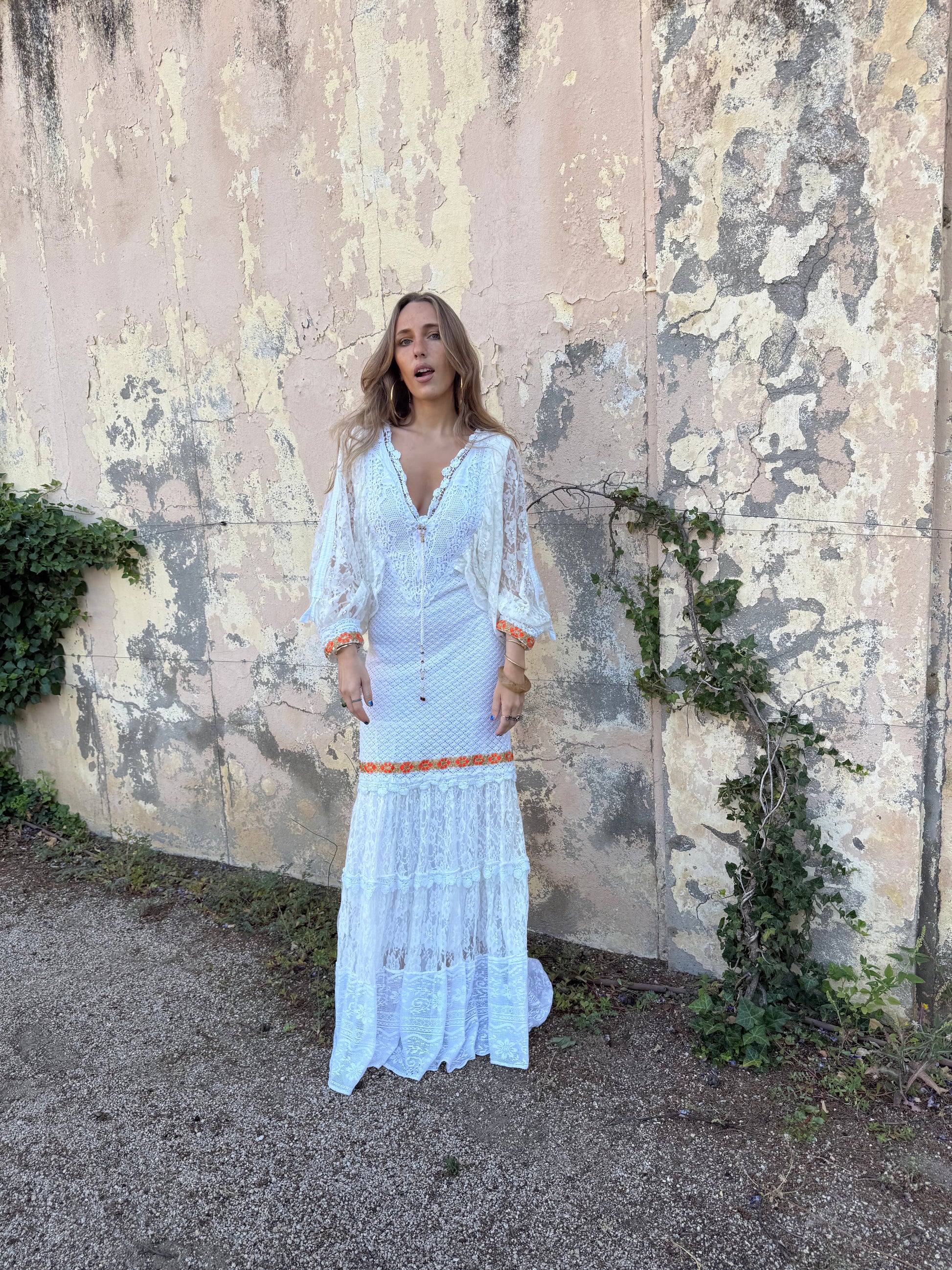 (Talla S/M) Espectacular vestido de estilo bohemio y romántico con delicados detalles de encaje y croché que evocan una sensación de elegancia y frescura. 100% algodón blanco suave y fluido de la India. Escote en forma de V con un pequeño cordón ajustable de perlas, cuentas y piedras en el centro. Las mangas largas, de estilo abullonado, están decoradas con bordes de encaje fino que aportan un toque etéreo al diseño. La falda tiene una caída fluida y ligera, con un corte largo que llega hasta el suelo, destacando una silueta elegante y femenina. Adornado con una franja de bordado color naranja brillante. Tejido ajustable al cuerpo, por lo que no son necesarias medidas, sin cierres de cremallera. Ideal para ocasiones especiales o eventos de día, este vestido es una opción perfecta para quienes buscan un look romántico y de carácter bohemio. Alta calidad, diseñado como vestido de novia. Perfectas condiciones, nuevo sin usar.