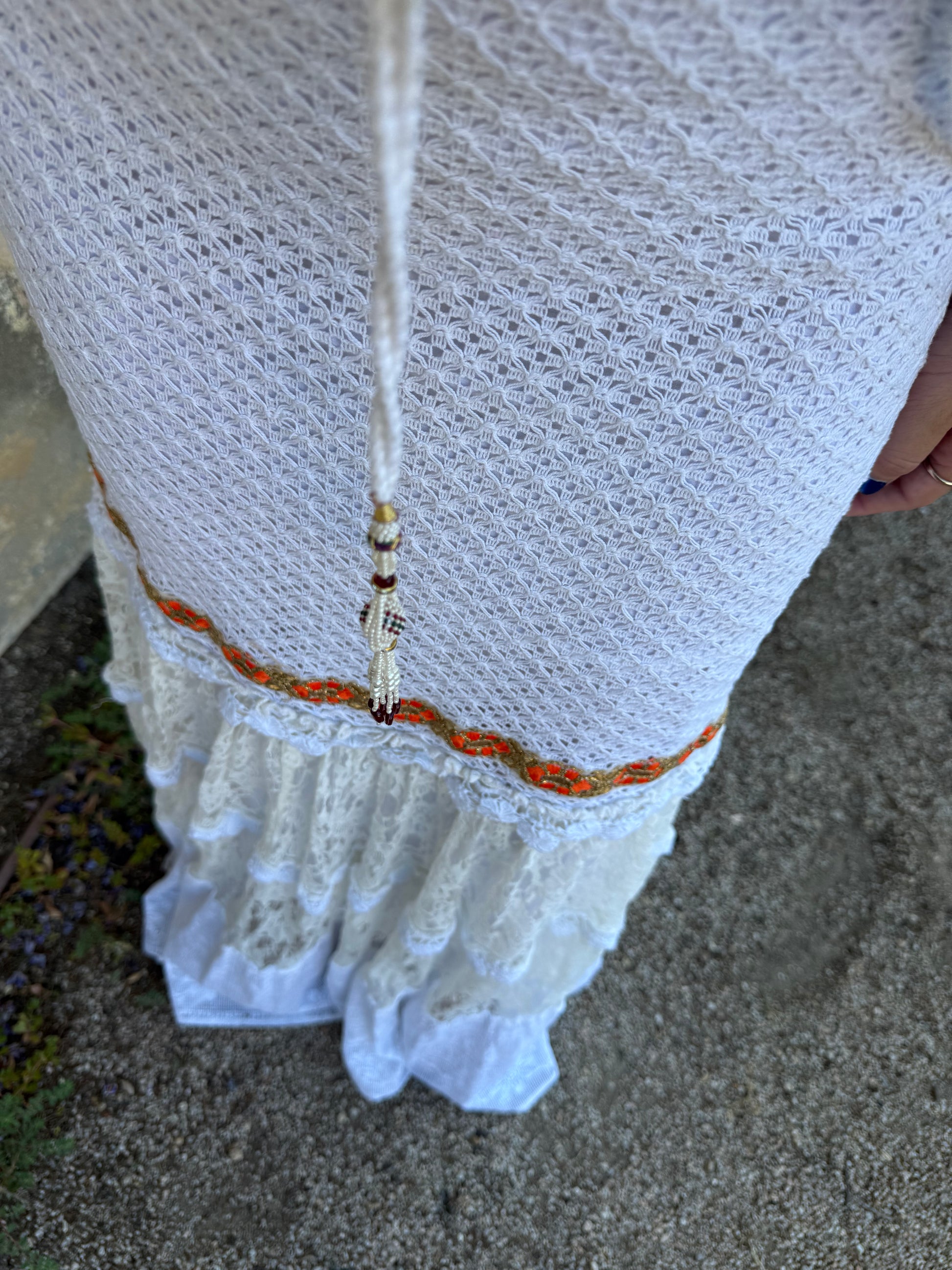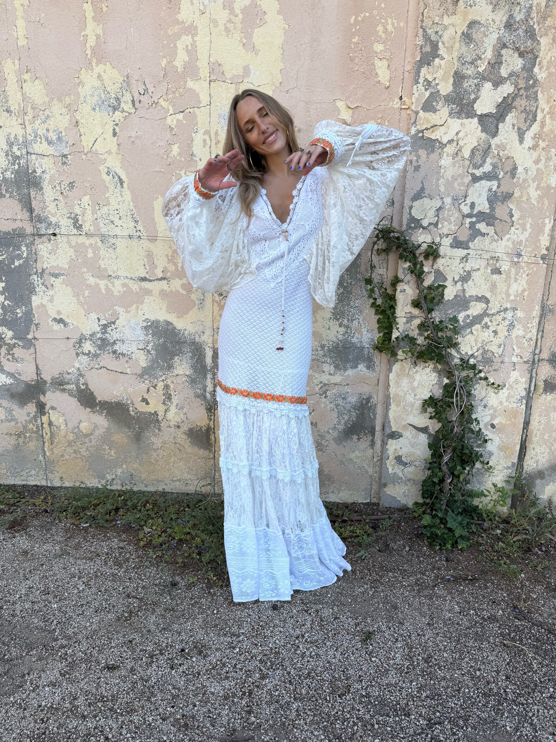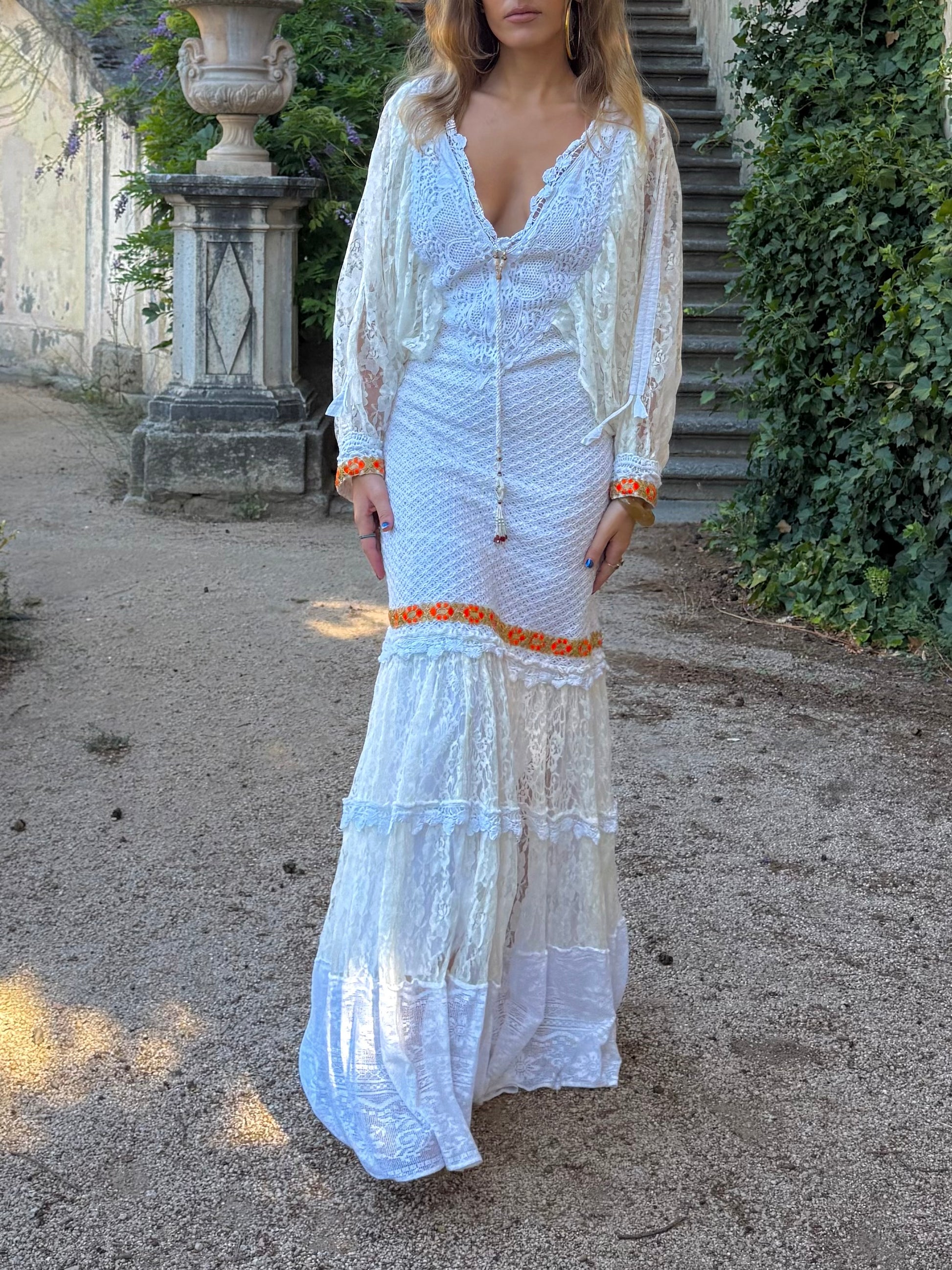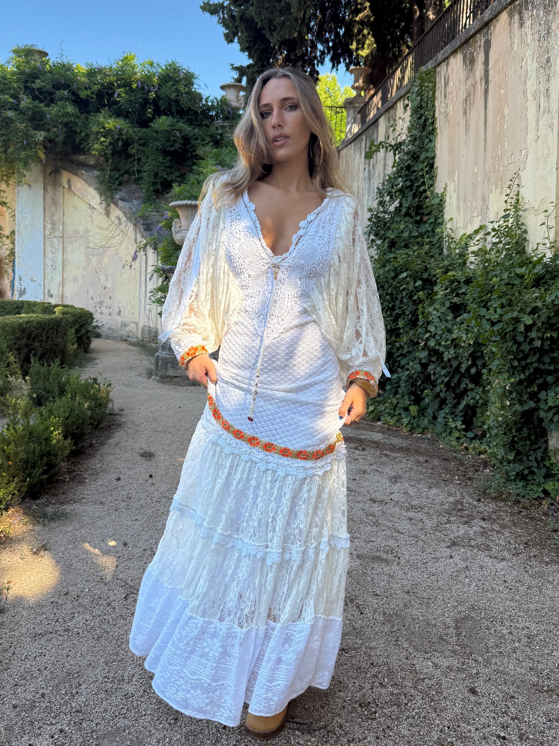 (Talla S/M) Espectacular vestido de estilo bohemio y romántico con delicados detalles de encaje y croché que evocan una sensación de elegancia y frescura. 100% algodón blanco suave y fluido de la India. Escote en forma de V con un pequeño cordón ajustable de perlas, cuentas y piedras en el centro. Las mangas largas, de estilo abullonado, están decoradas con bordes de encaje fino que aportan un toque etéreo al diseño. La falda tiene una caída fluida y ligera, con un corte largo que llega hasta el suelo, destacando una silueta elegante y femenina. Adornado con una franja de bordado color naranja brillante. Tejido ajustable al cuerpo, por lo que no son necesarias medidas, sin cierres de cremallera. Ideal para ocasiones especiales o eventos de día, este vestido es una opción perfecta para quienes buscan un look romántico y de carácter bohemio. Alta calidad, diseñado como vestido de novia. Perfectas condiciones, nuevo sin usar.