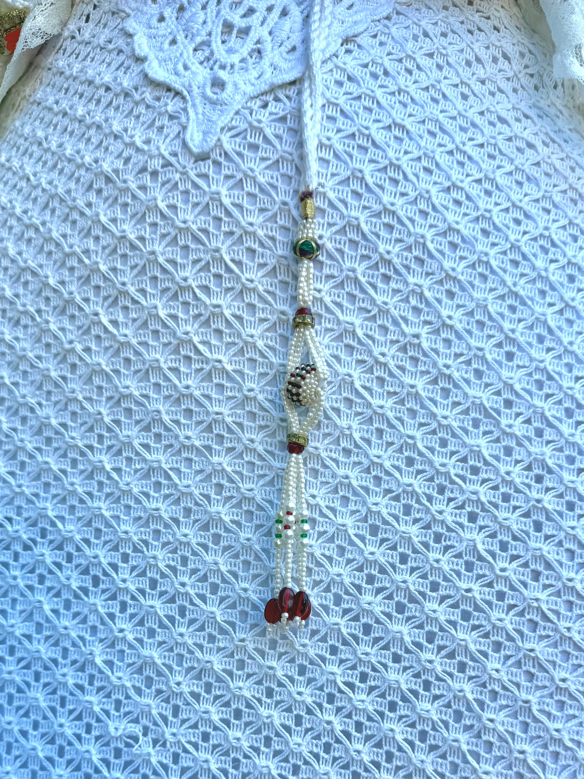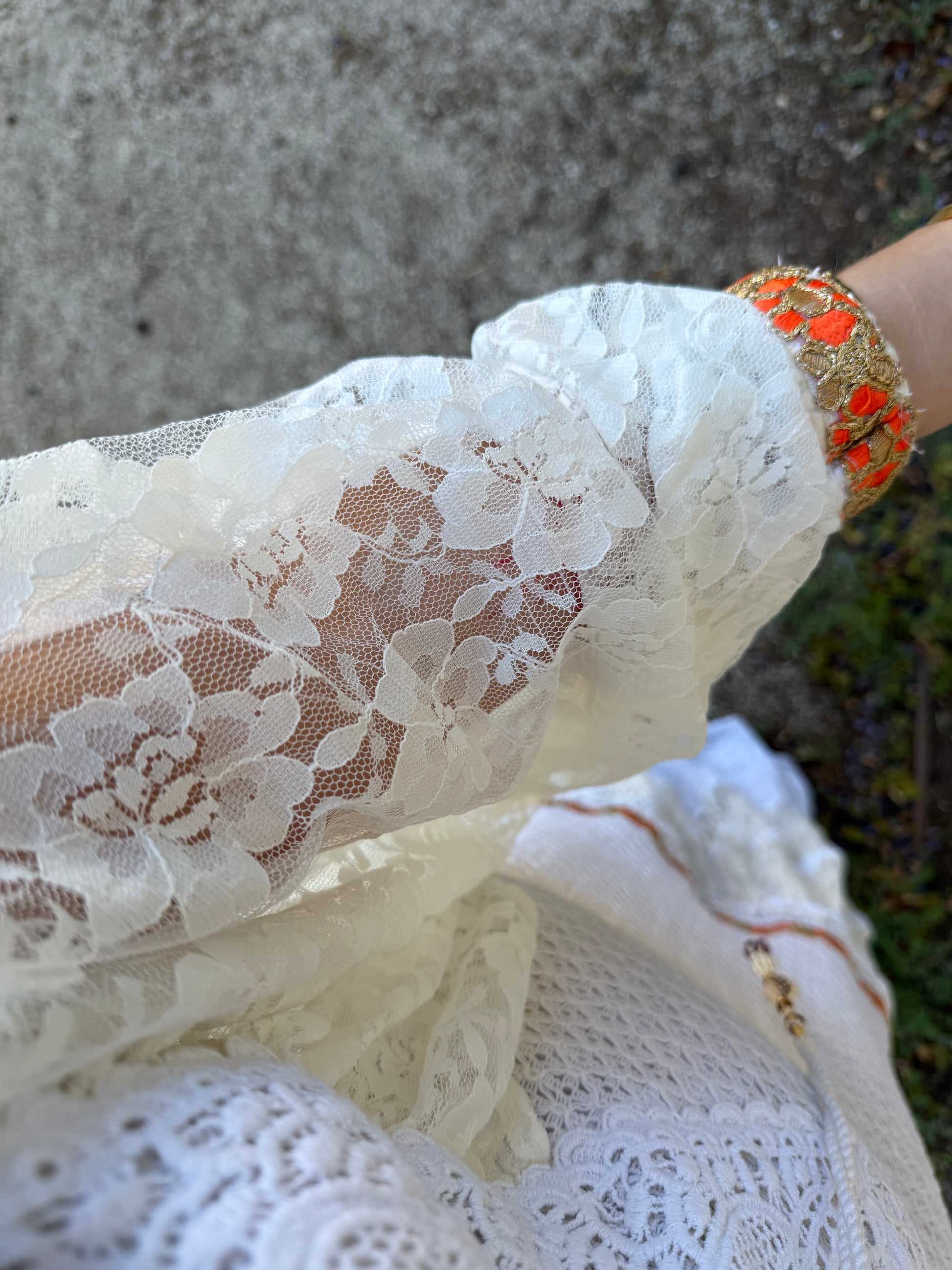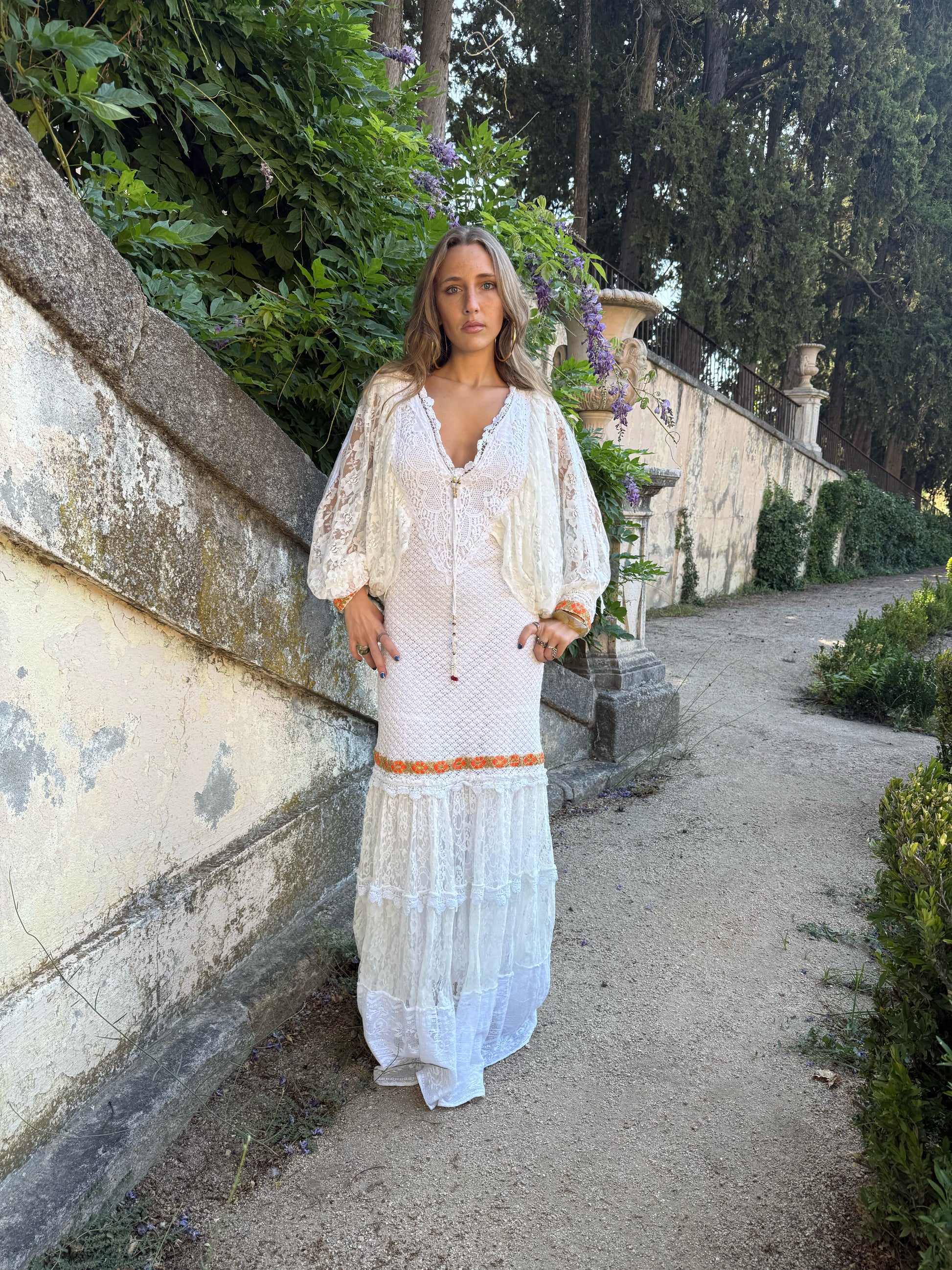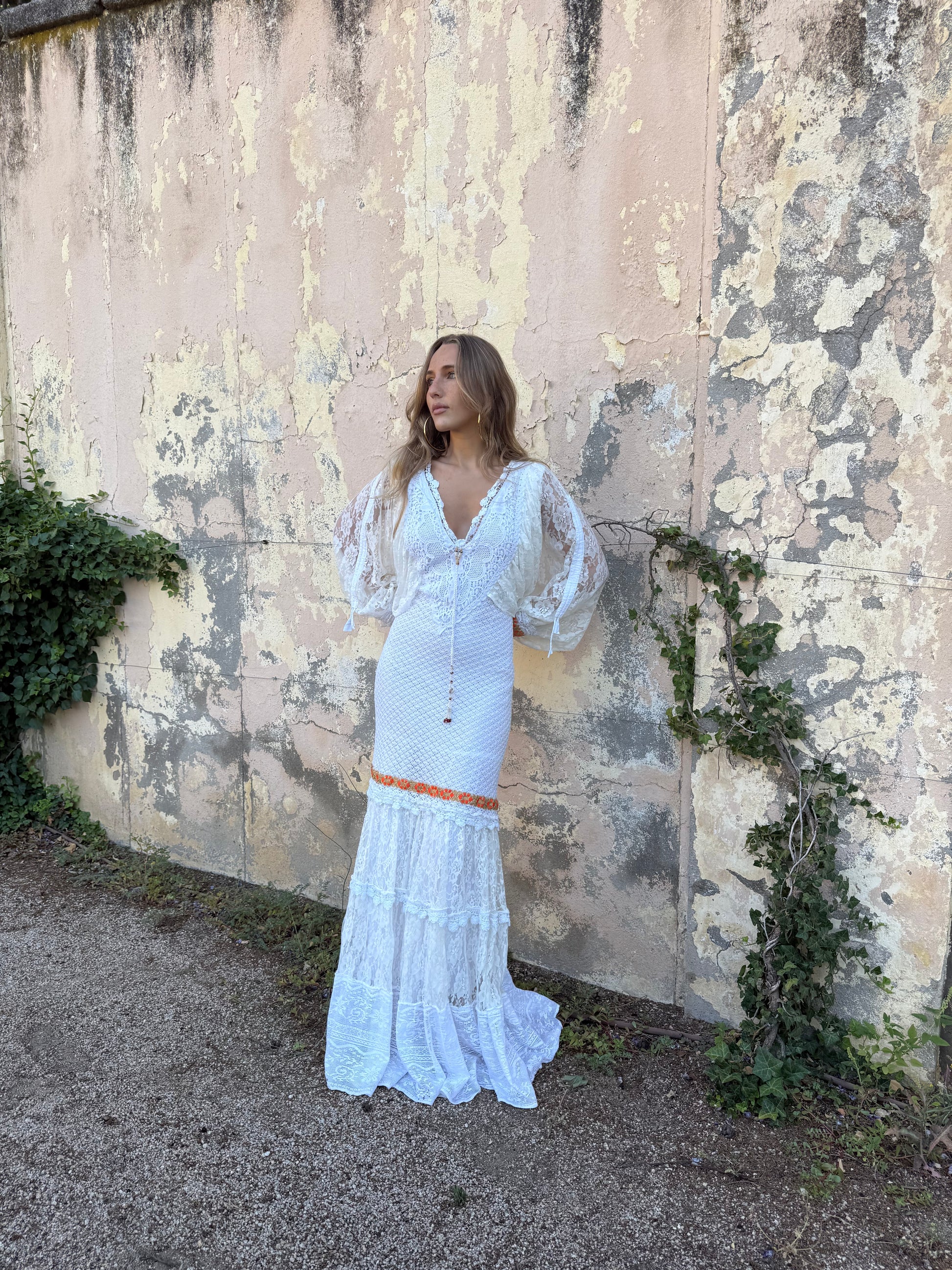 (Talla S/M) Espectacular vestido de estilo bohemio y romántico con delicados detalles de encaje y croché que evocan una sensación de elegancia y frescura. 100% algodón blanco suave y fluido de la India. Escote en forma de V con un pequeño cordón ajustable de perlas, cuentas y piedras en el centro. Las mangas largas, de estilo abullonado, están decoradas con bordes de encaje fino que aportan un toque etéreo al diseño. La falda tiene una caída fluida y ligera, con un corte largo que llega hasta el suelo, destacando una silueta elegante y femenina. Adornado con una franja de bordado color naranja brillante. Tejido ajustable al cuerpo, por lo que no son necesarias medidas, sin cierres de cremallera. Ideal para ocasiones especiales o eventos de día, este vestido es una opción perfecta para quienes buscan un look romántico y de carácter bohemio. Alta calidad, diseñado como vestido de novia. Perfectas condiciones, nuevo sin usar.