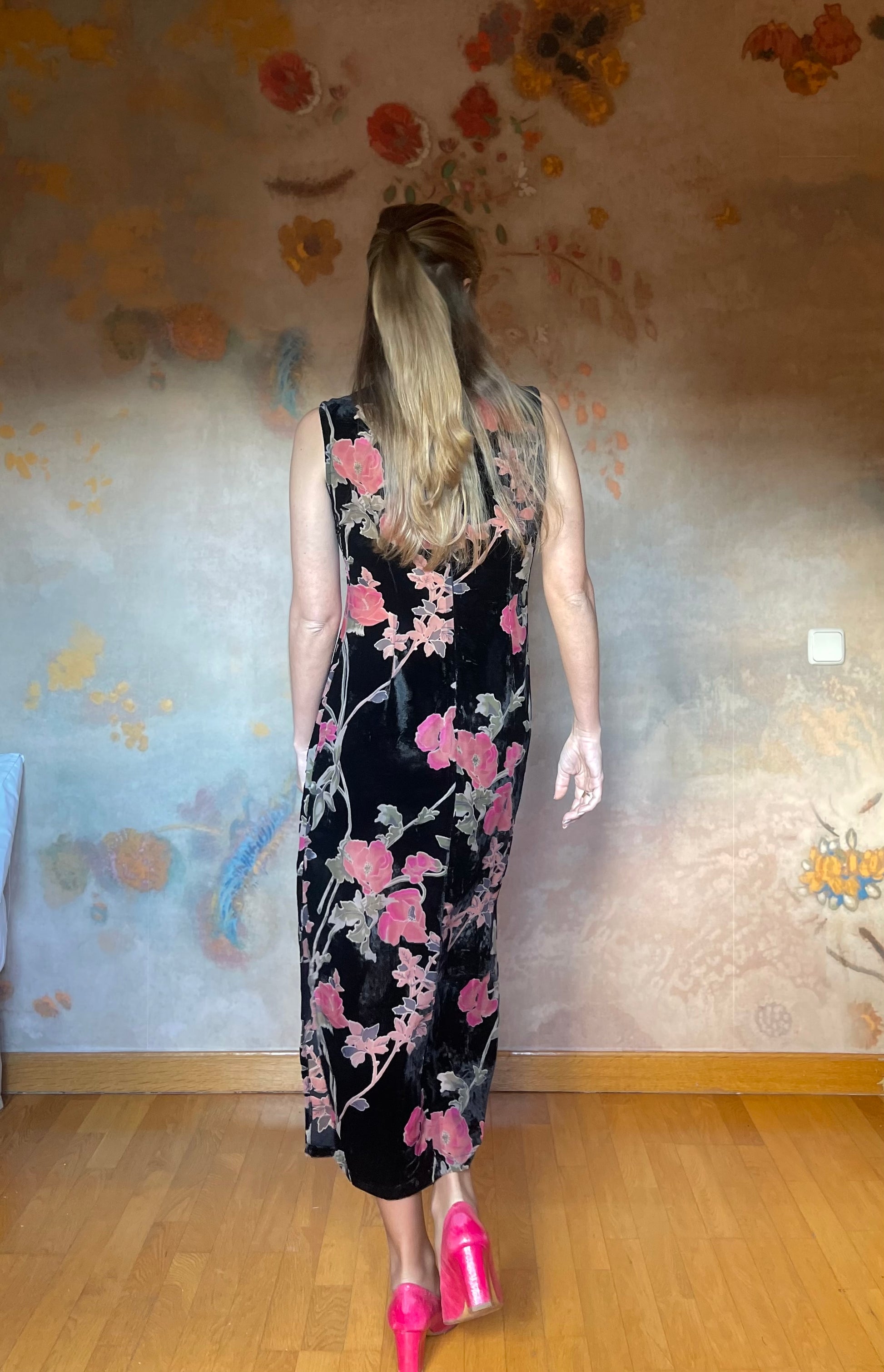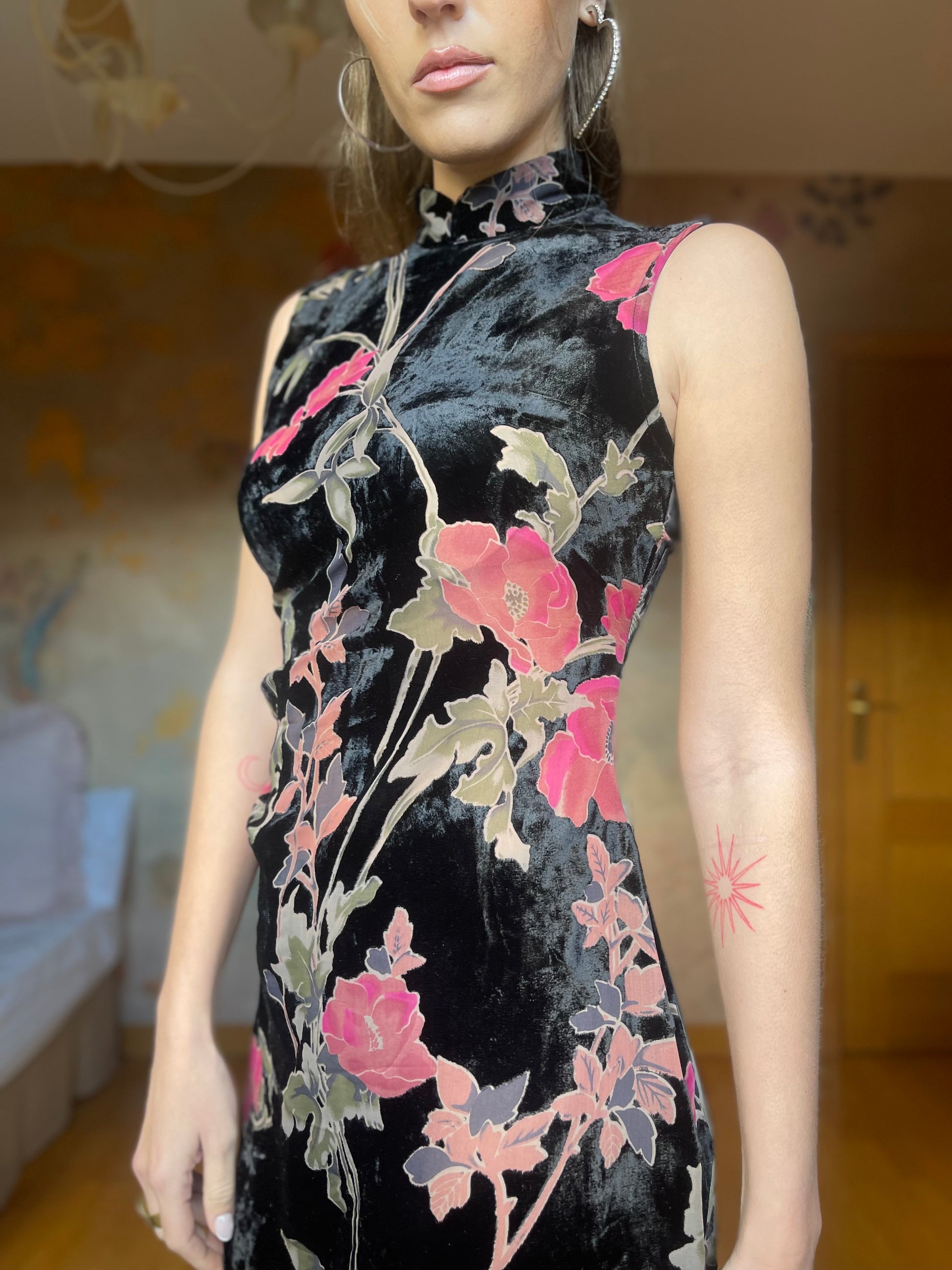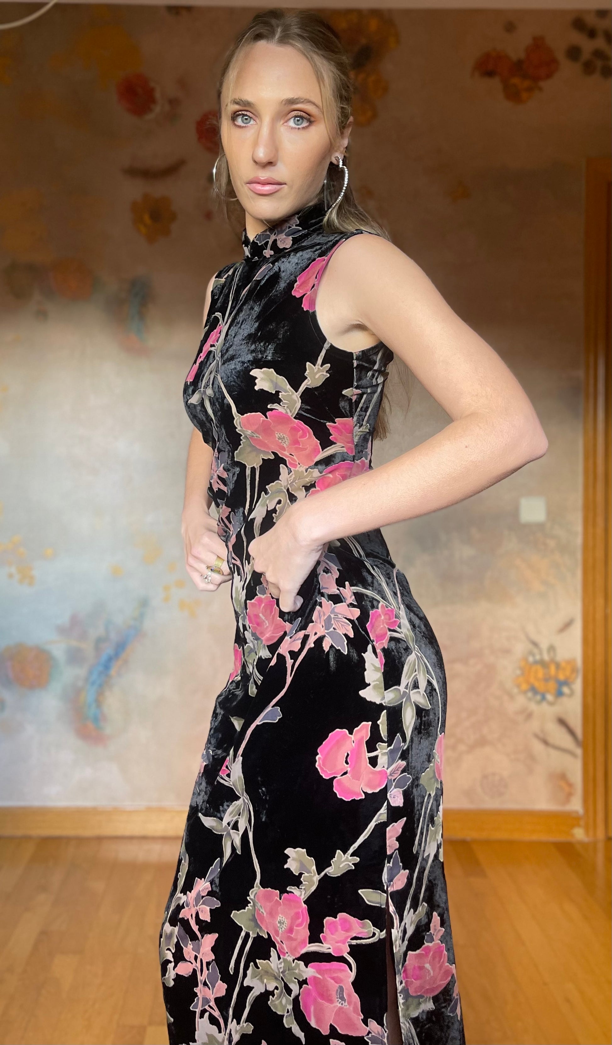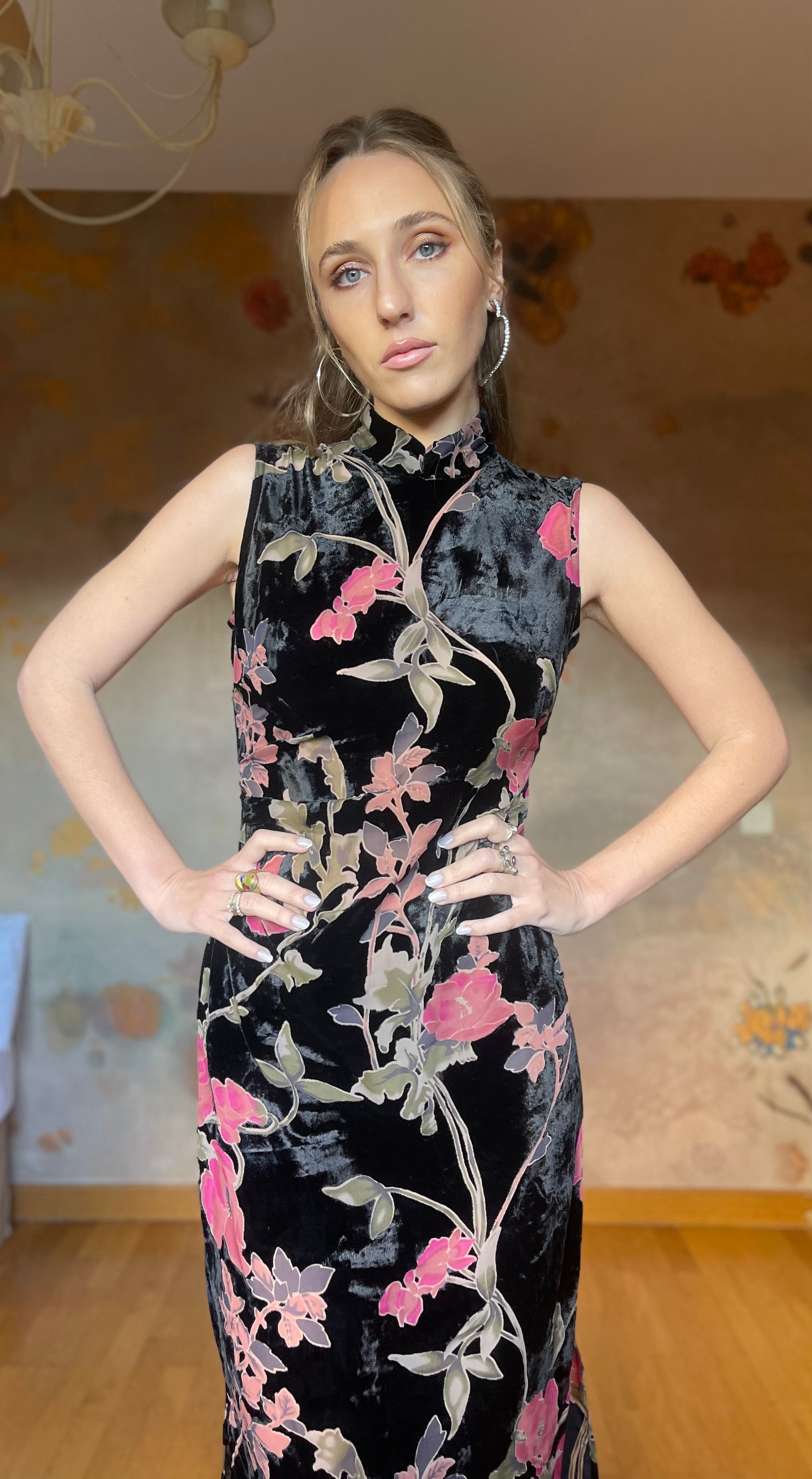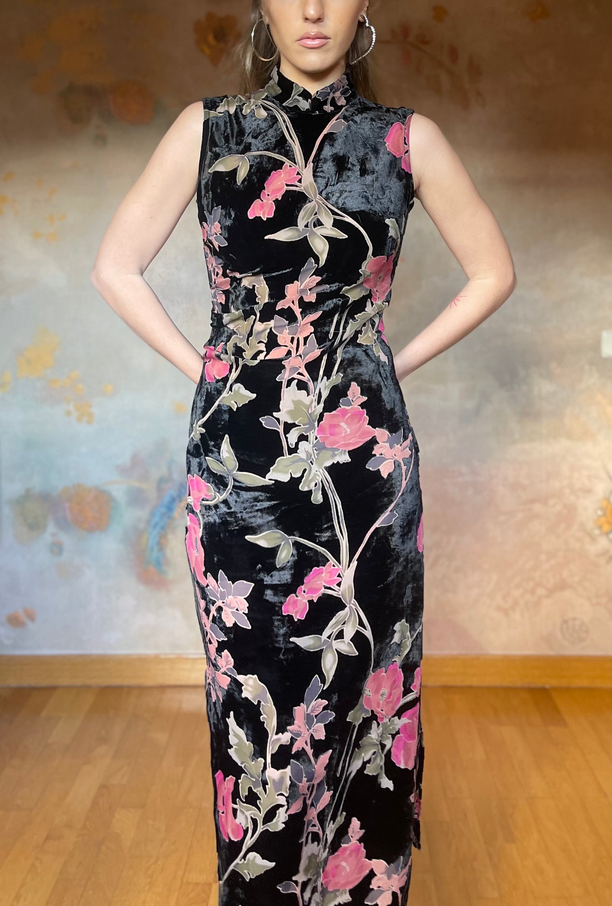 (Talla S) Precioso vestido de terciopelo negro adamascado con delicadas flores rosas y hojas verdes. El tejido de las flores y hojas es semitransparente, pero no deja entrever nada ya que tiene color, creando un detalle precioso y único. Cuello alto, espalda cerrada y cierre trasero de cremallera. El vestido es ceñido debajo del pecho y en la cintura, realzando la figura. Es largo hasta los tobillos. Opción muy acertada para cenas arregladas, fiestas y bodas de invierno. Pefectas condiciones.