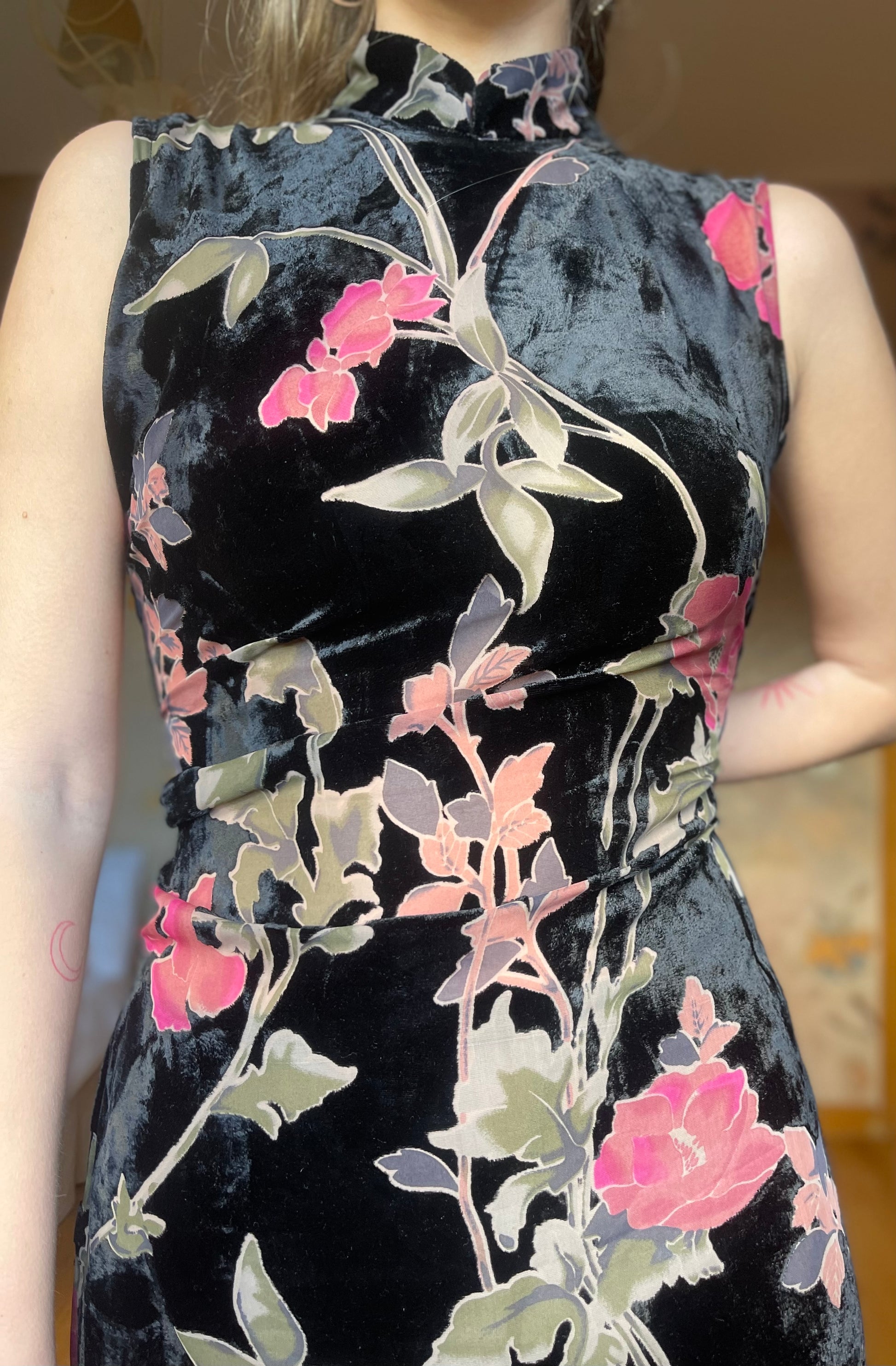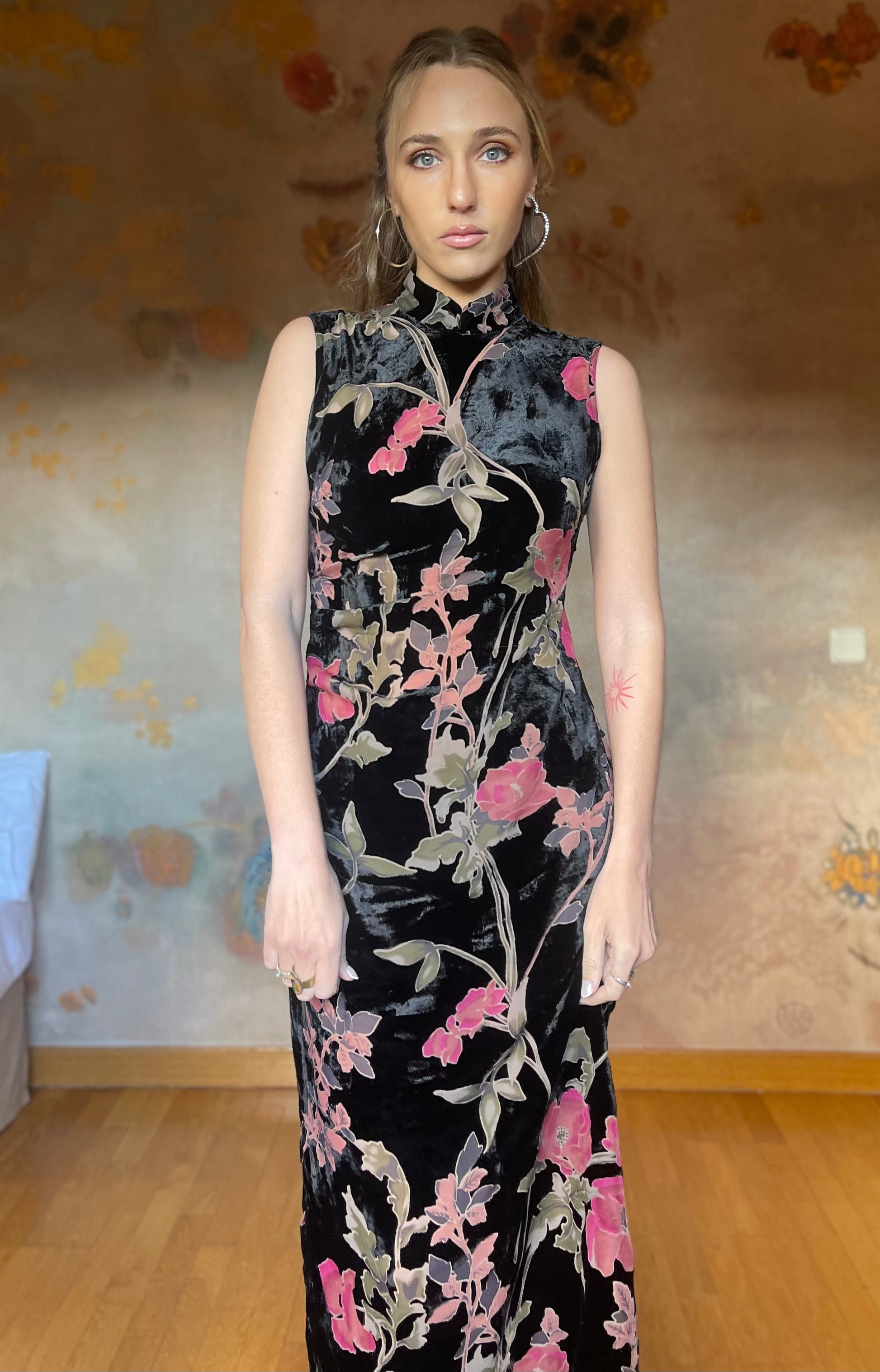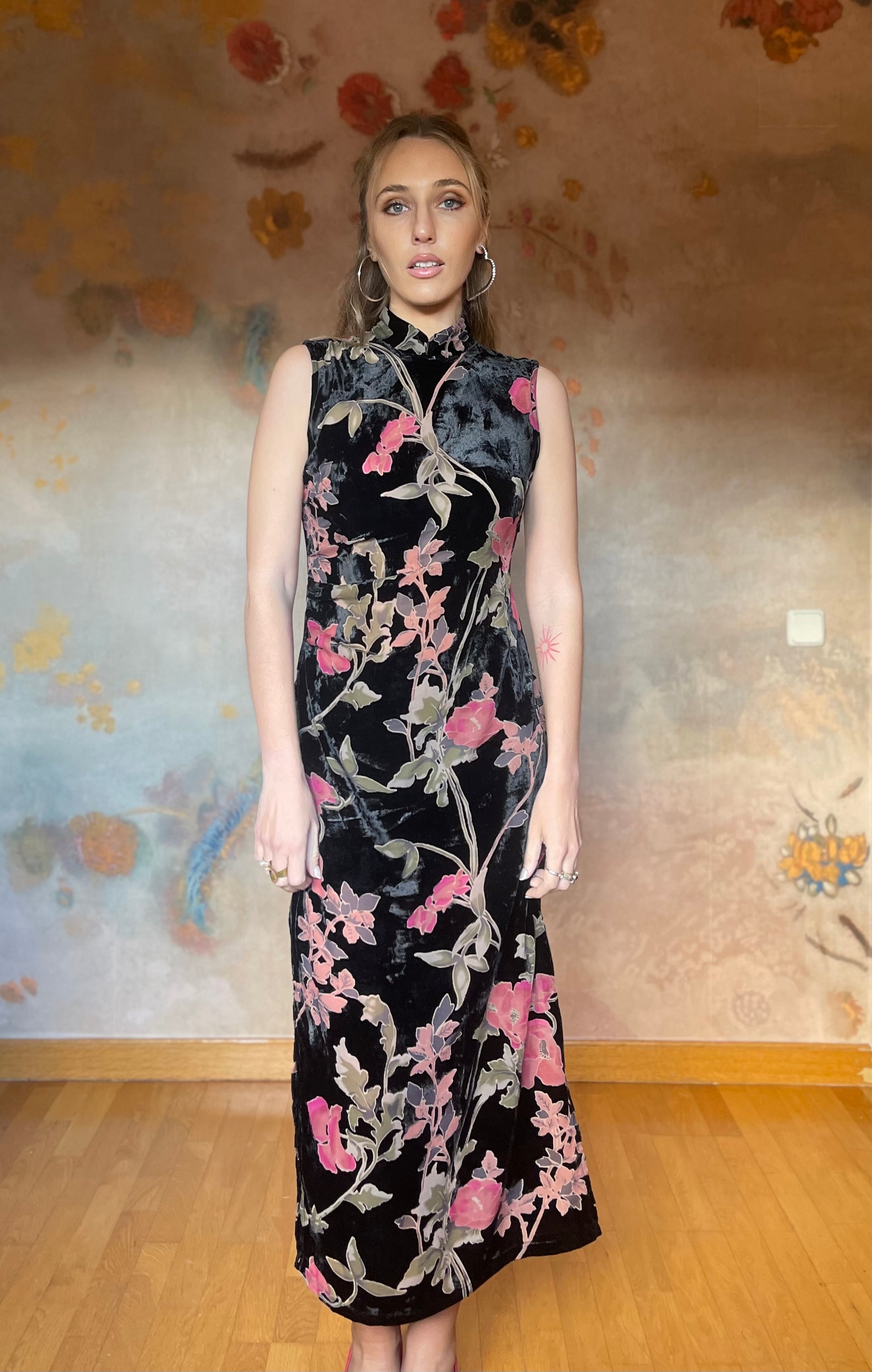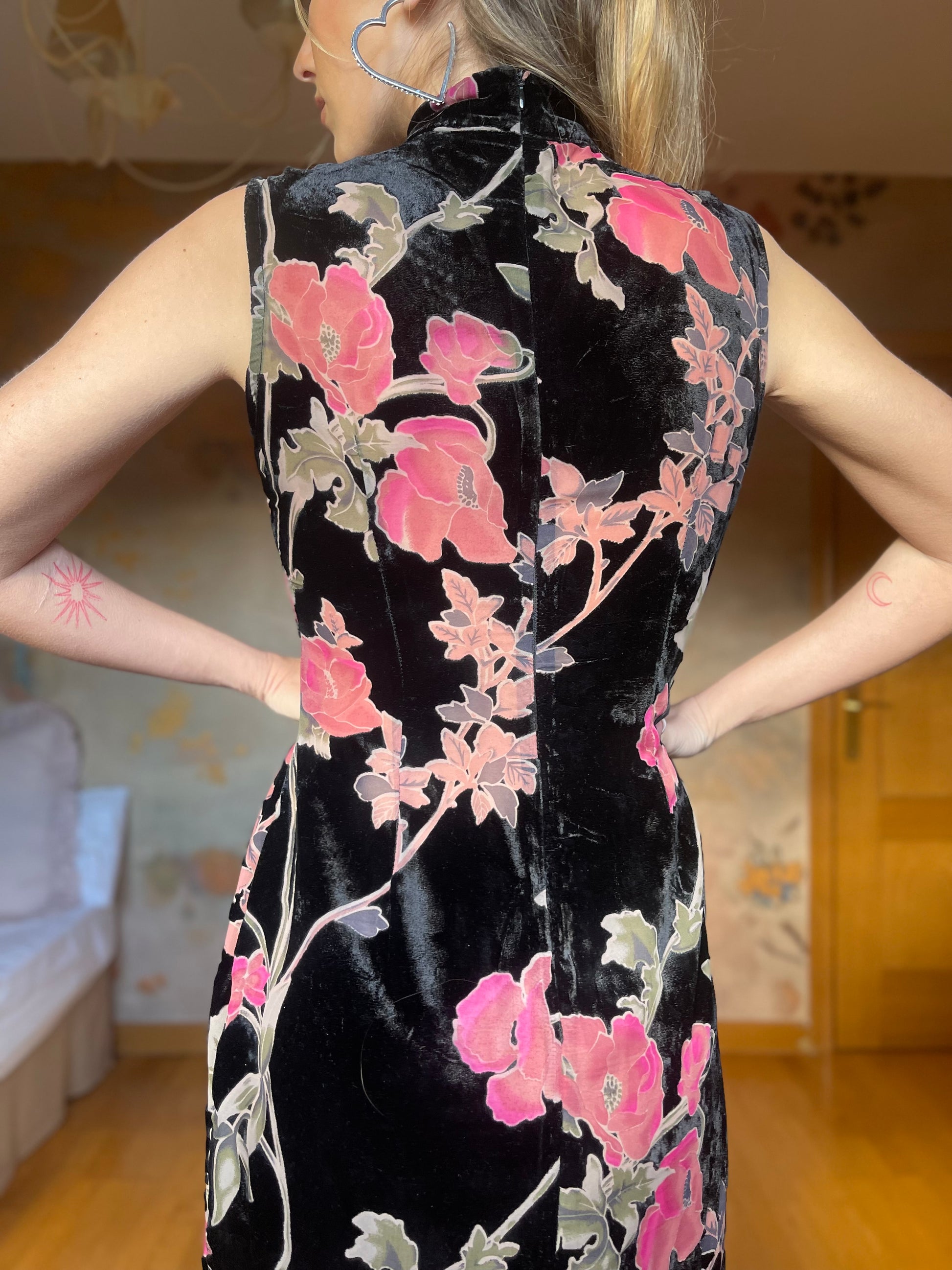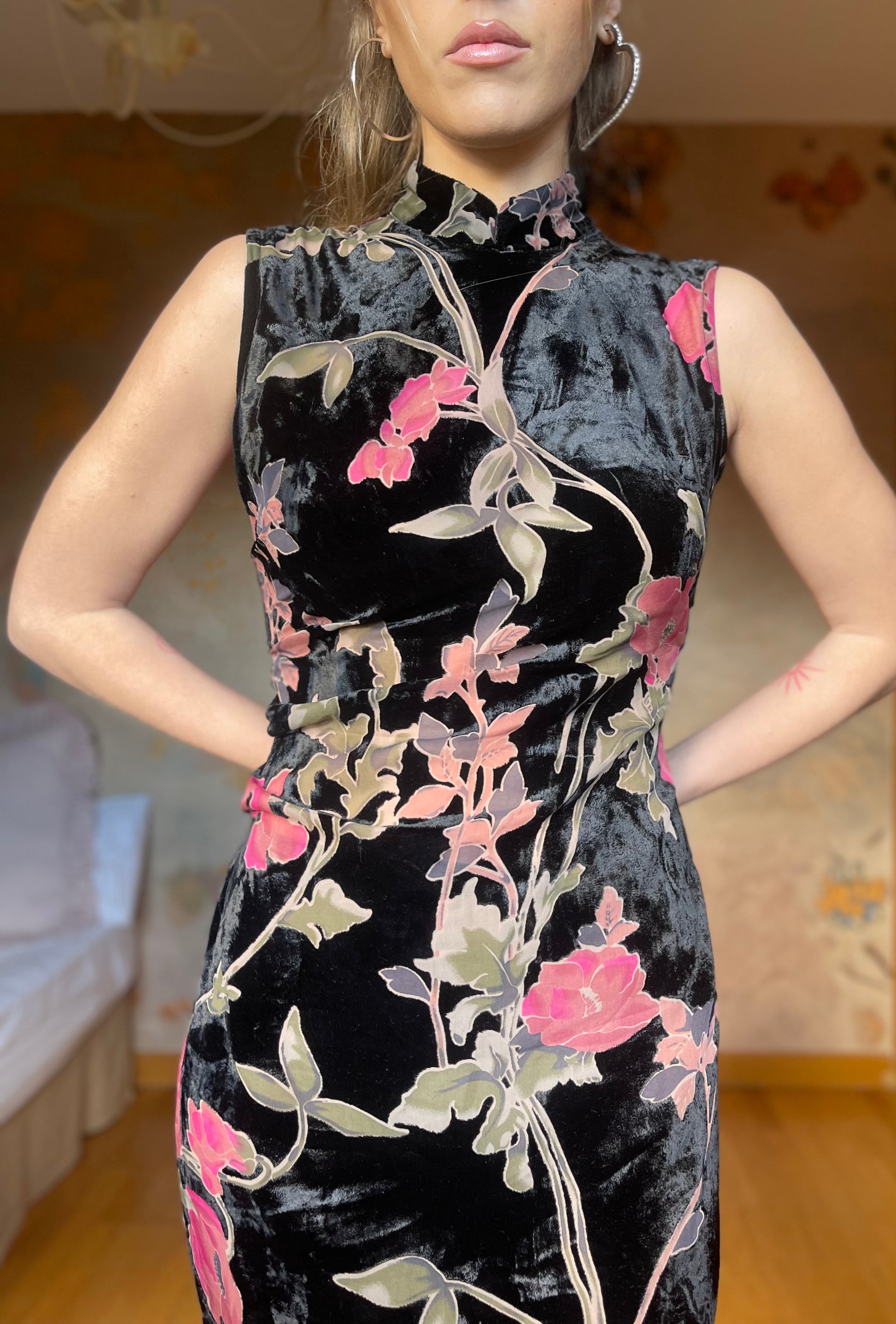 (Talla S) Precioso vestido de terciopelo negro adamascado con delicadas flores rosas y hojas verdes. El tejido de las flores y hojas es semitransparente, pero no deja entrever nada ya que tiene color, creando un detalle precioso y único. Cuello alto, espalda cerrada y cierre trasero de cremallera. El vestido es ceñido debajo del pecho y en la cintura, realzando la figura. Es largo hasta los tobillos. Opción muy acertada para cenas arregladas, fiestas y bodas de invierno. Pefectas condiciones.