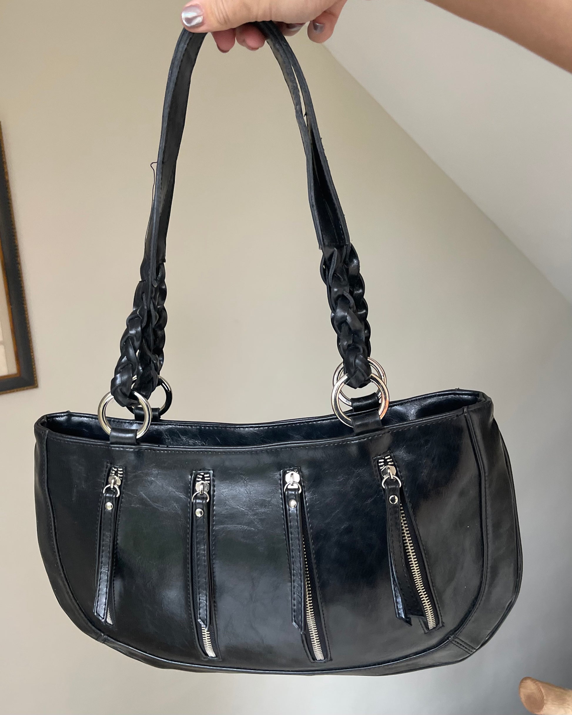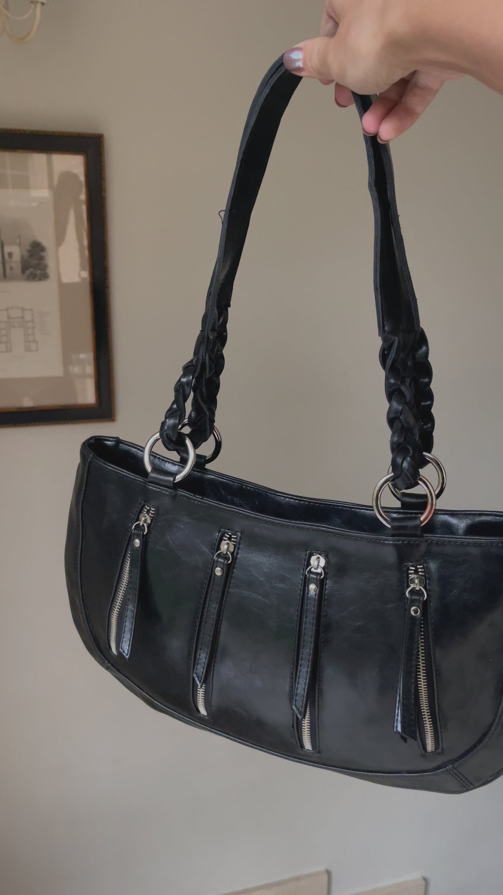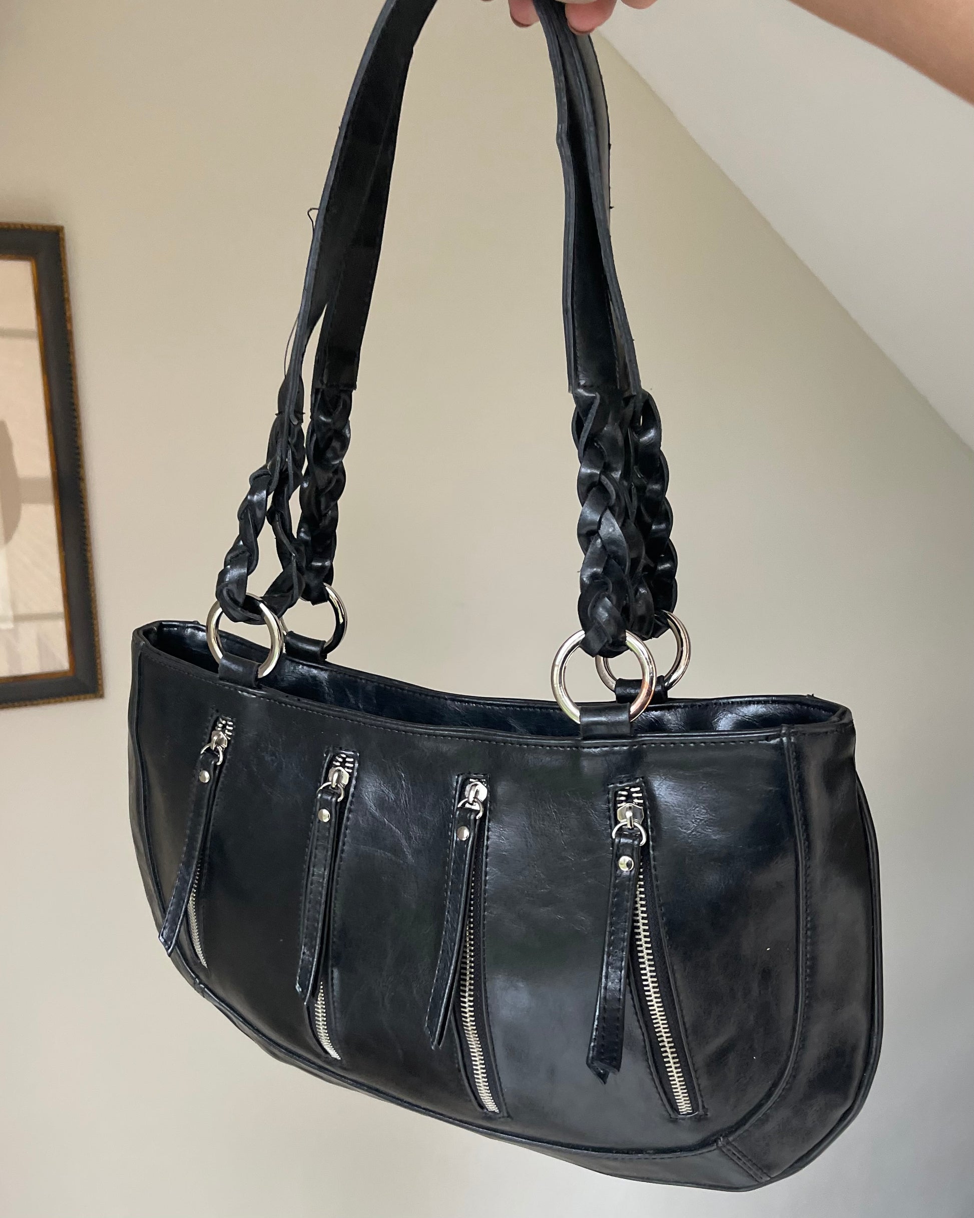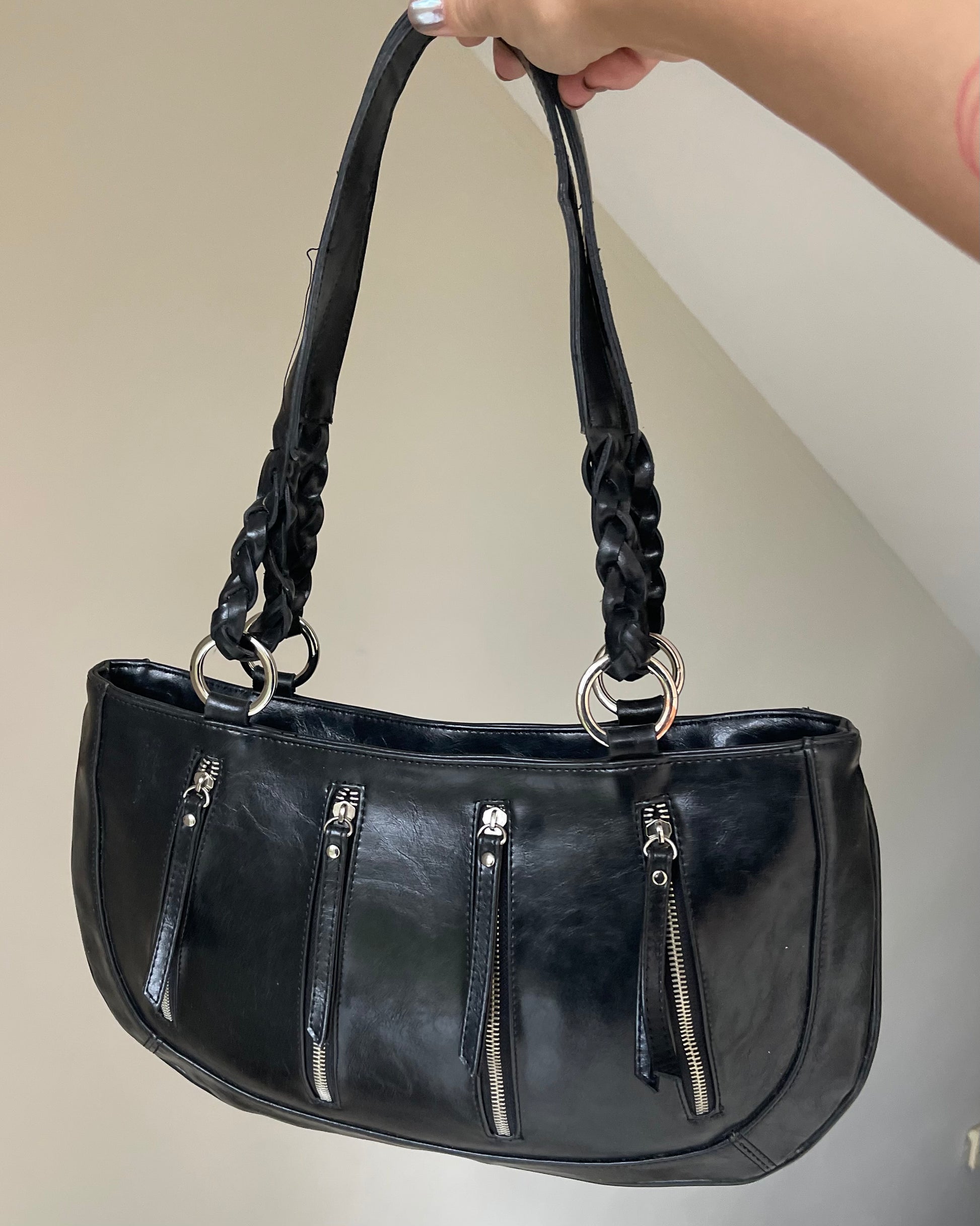 Increíble bolso negro de cuero auténtico con varios bolsillos de cremalleras verticales en su parte frontal que le dan un toque rockero y grunge. Bolsillo exterior trasero de cremallera. Tamaño mediano, tipo shopper y asas de hombro. Perfecto para cualquier plan, por su color y tamaño versátiles. Excelente estado de la piel y del bolso.