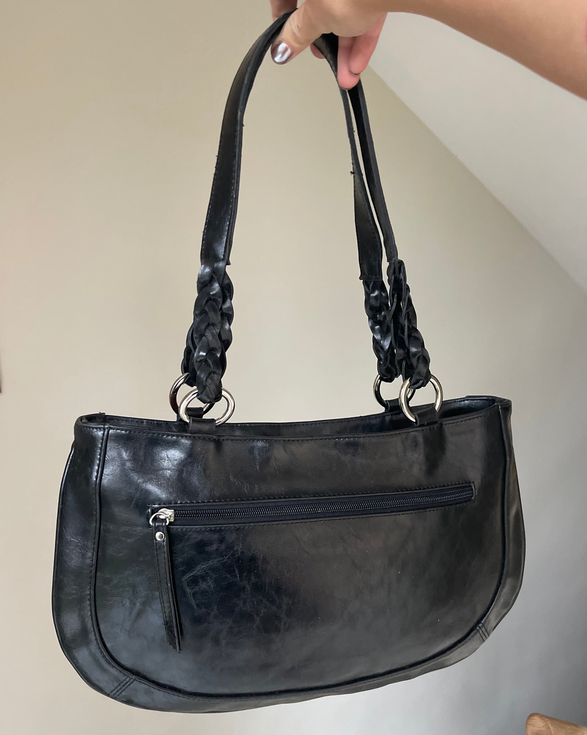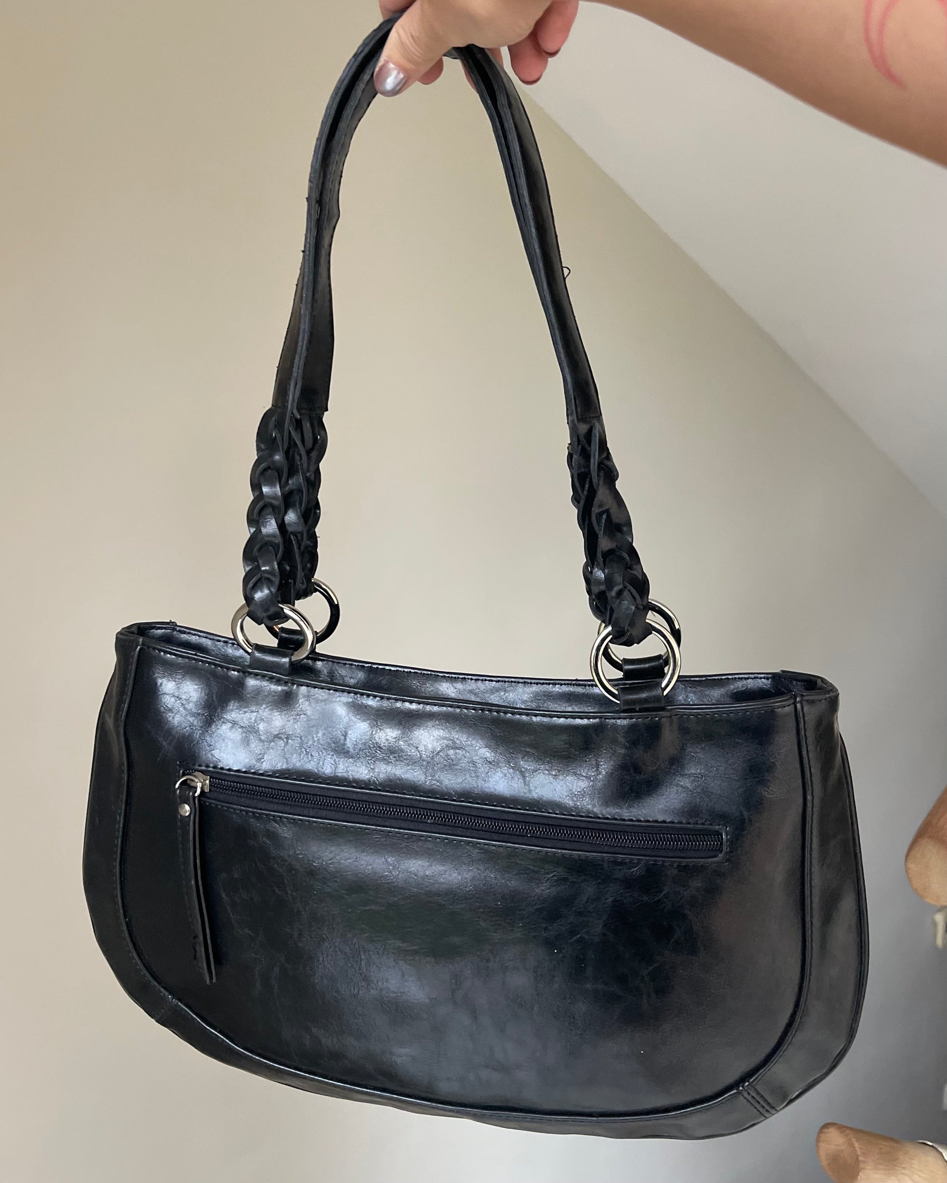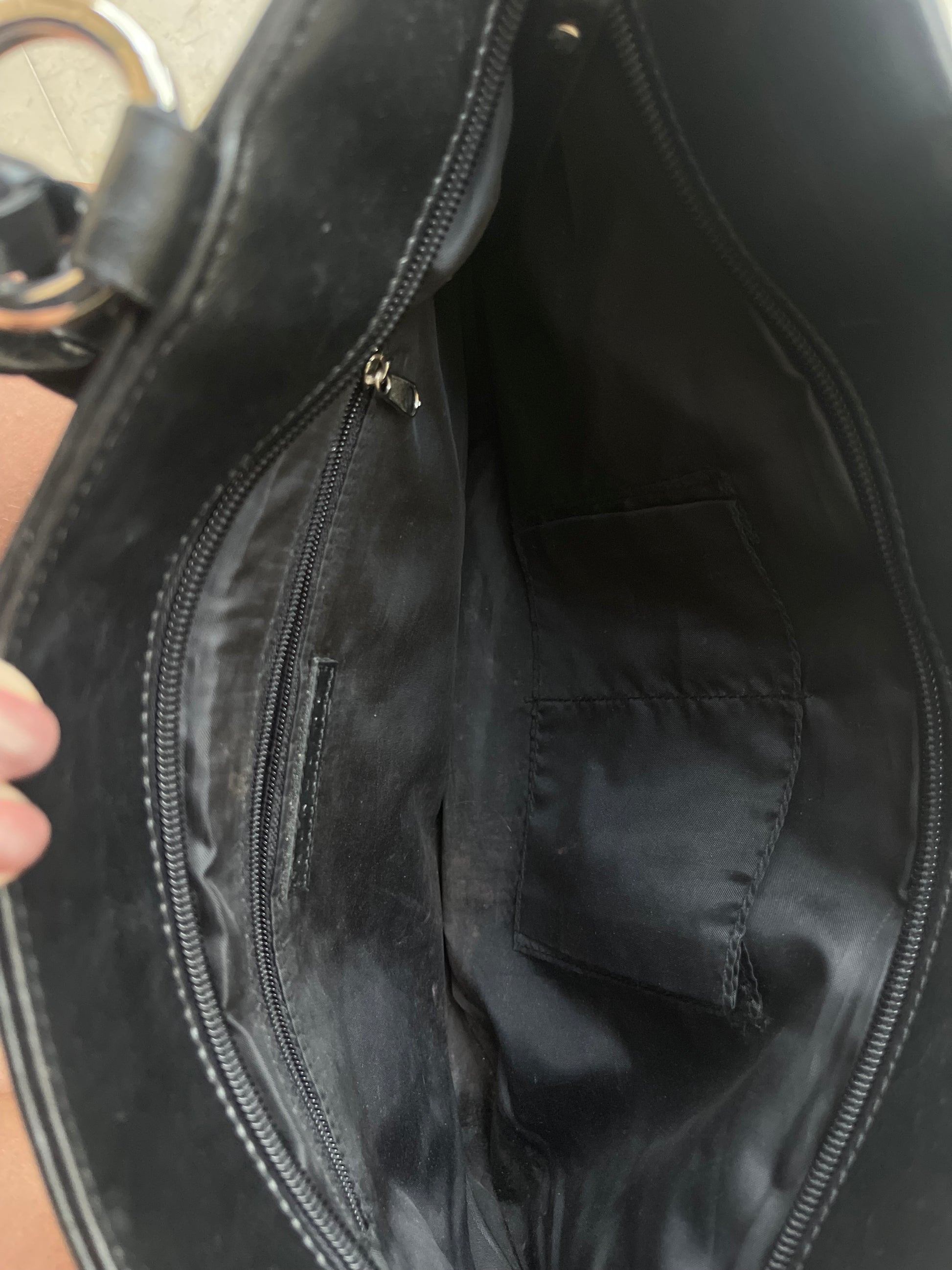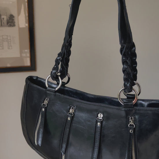 Increíble bolso negro de cuero auténtico con varios bolsillos de cremalleras verticales en su parte frontal que le dan un toque rockero y grunge. Bolsillo exterior trasero de cremallera. Tamaño mediano, tipo shopper y asas de hombro. Perfecto para cualquier plan, por su color y tamaño versátiles. Excelente estado de la piel y del bolso.