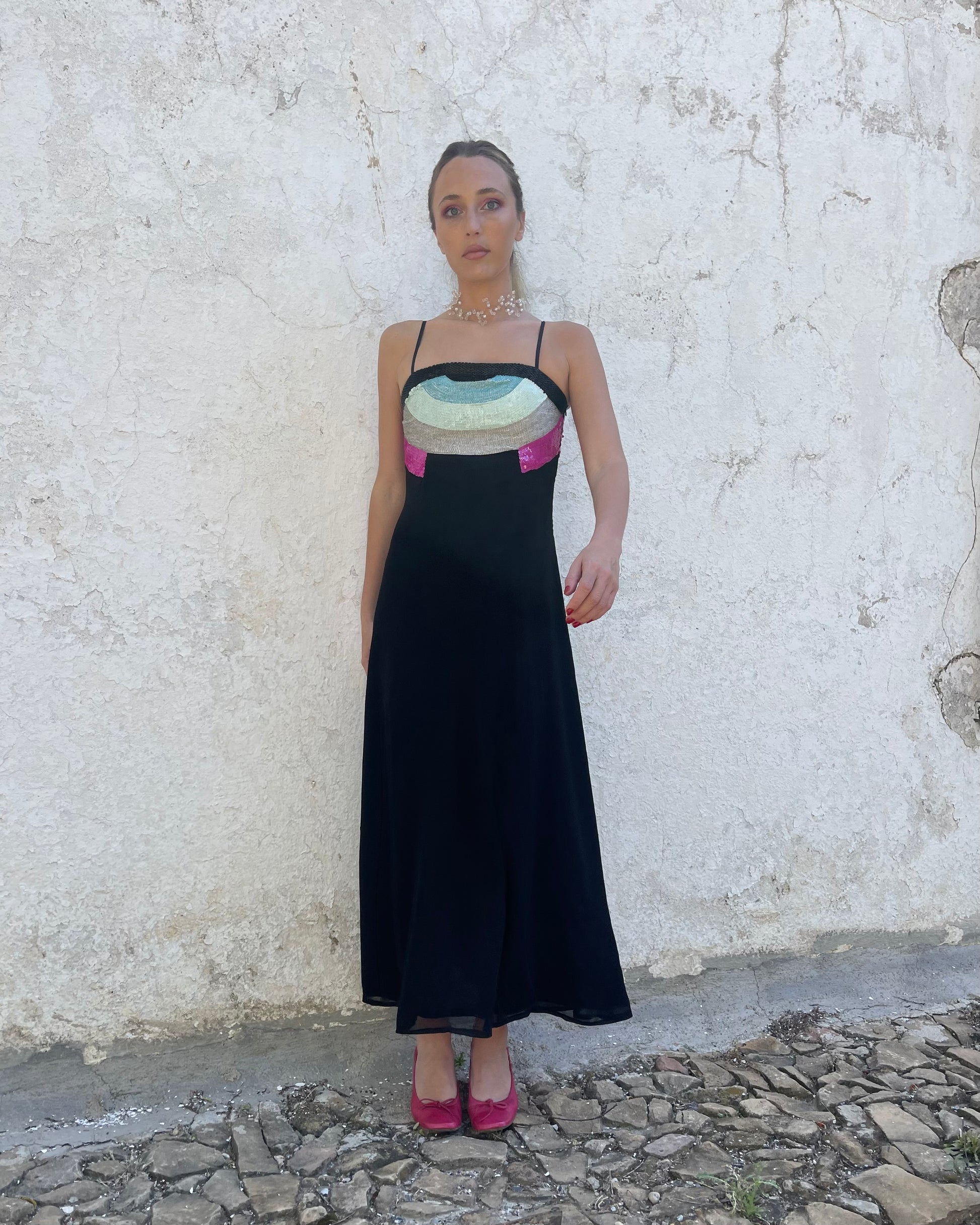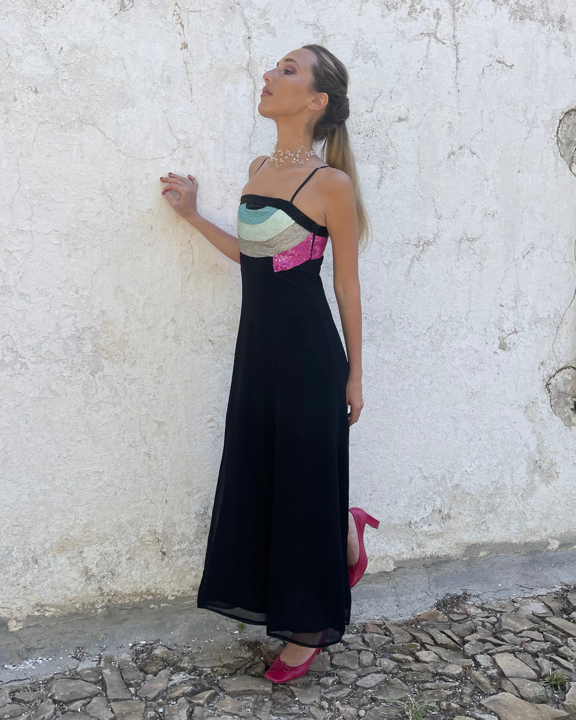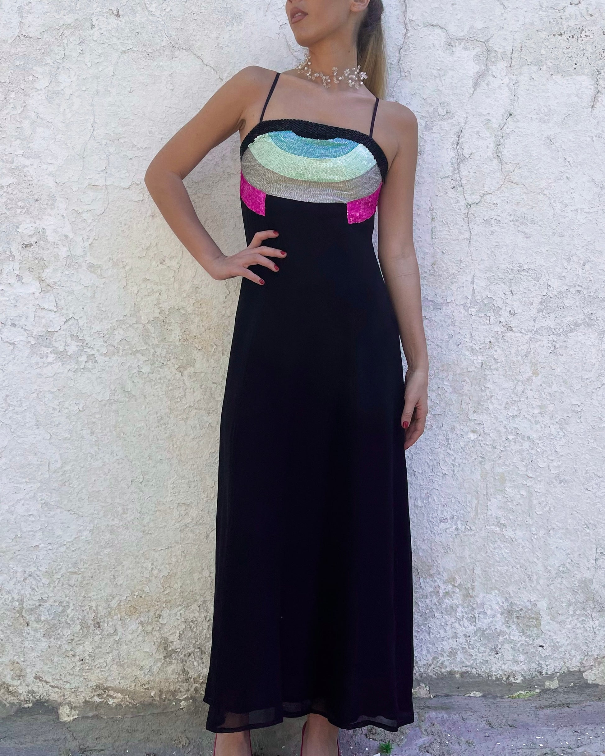 Size XS. Elegant long black dress with unique design of sequins on the neckline with a drawing of curved stripes of different colors that continues in the back. 100% silk. Timeless and very elegant, great for any special occasion (wedding, party, ball). Side zipper closure. Perfect condition. The measurements in cm are 78 in circumference and 139 in length approximately. The chest is not included because it is adaptable, while the contour is the one to be taken into account because of the zipper. The model is size XS/S and is 1.72 cm tall).