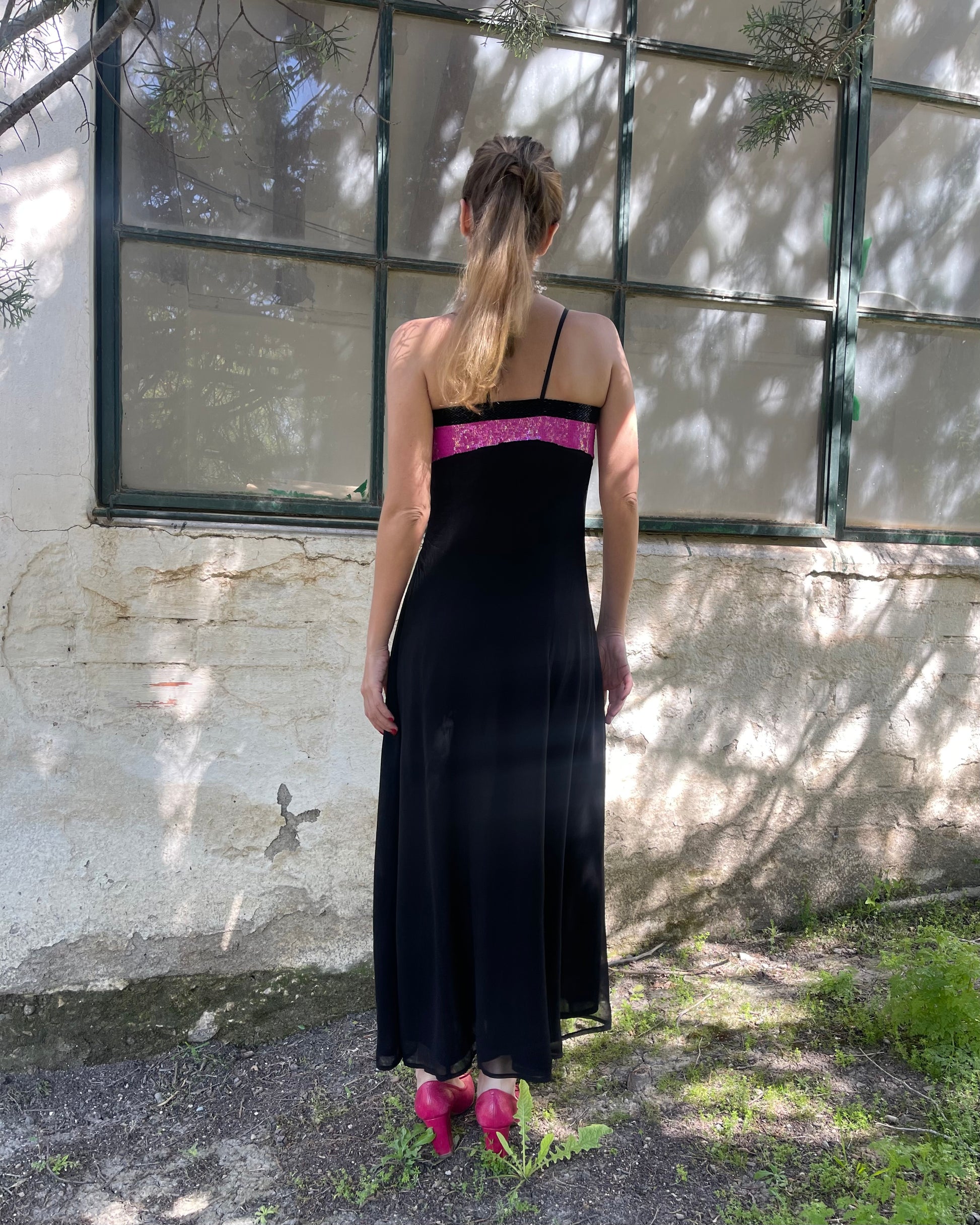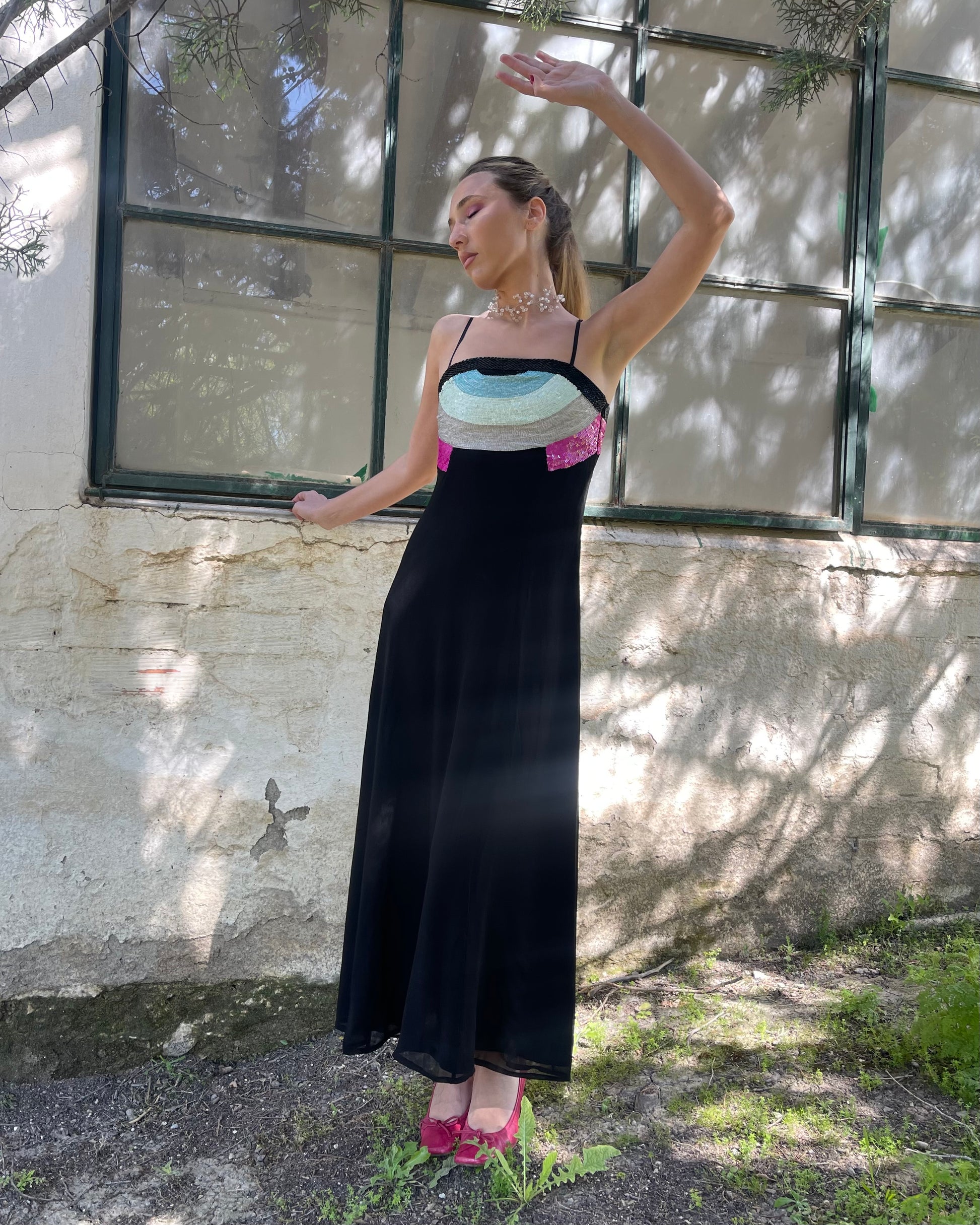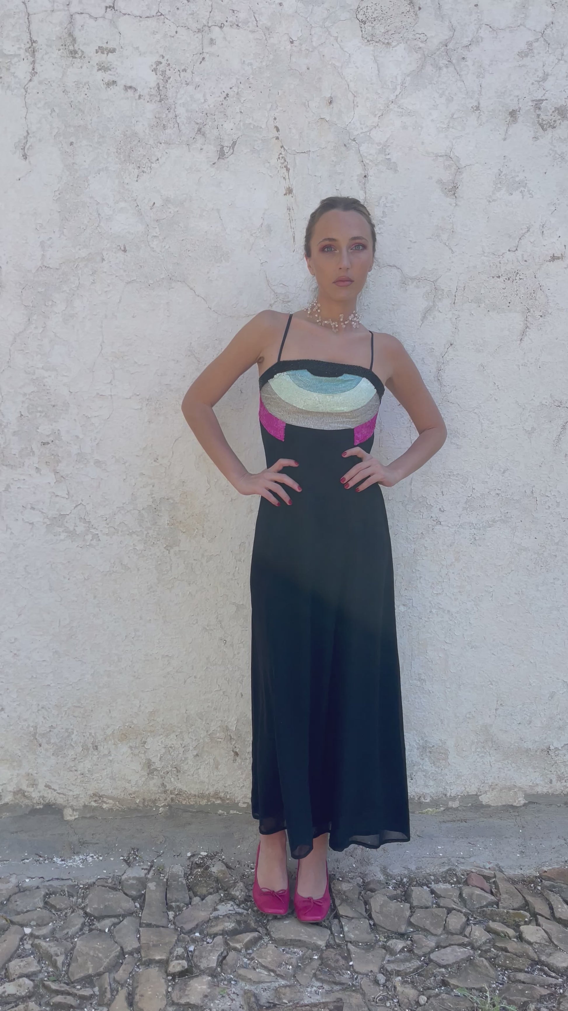 Size XS. Elegant long black dress with unique design of sequins on the neckline with a drawing of curved stripes of different colors that continues in the back. 100% silk. Timeless and very elegant, great for any special occasion (wedding, party, ball). Side zipper closure. Perfect condition. The measurements in cm are 78 in circumference and 139 in length approximately. The chest is not included because it is adaptable, while the contour is the one to be taken into account because of the zipper. The model is size XS/S and is 1.72 cm tall).